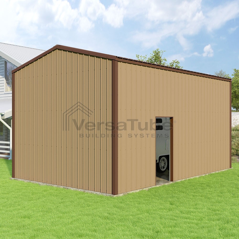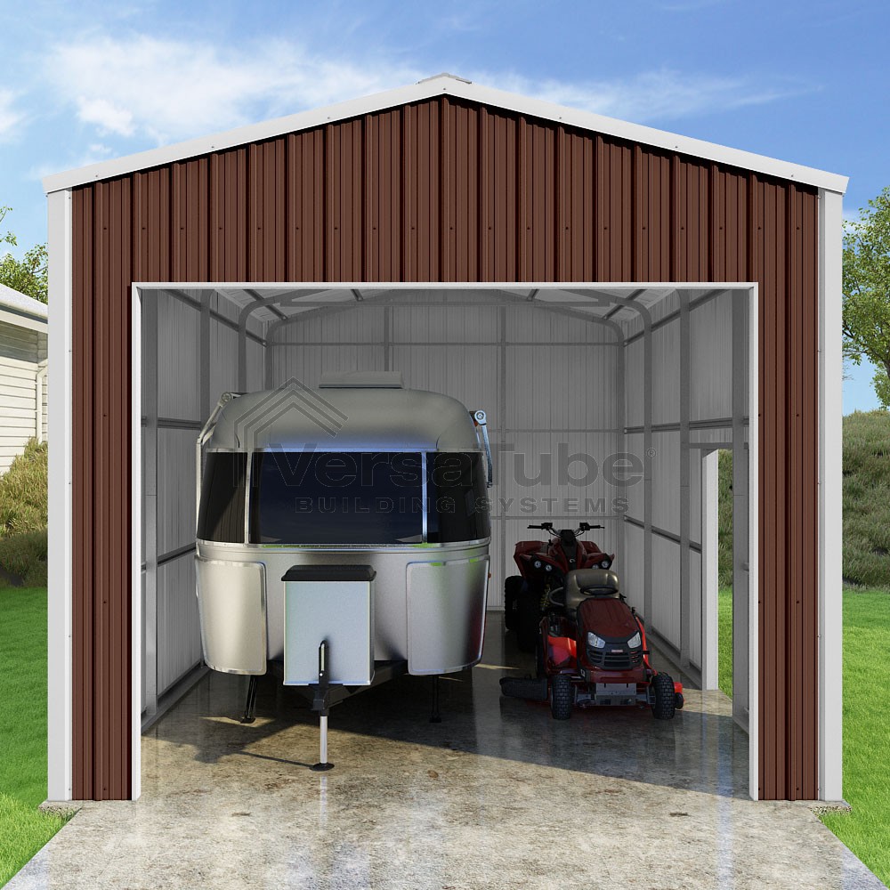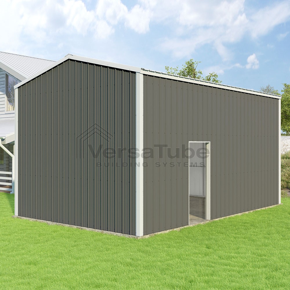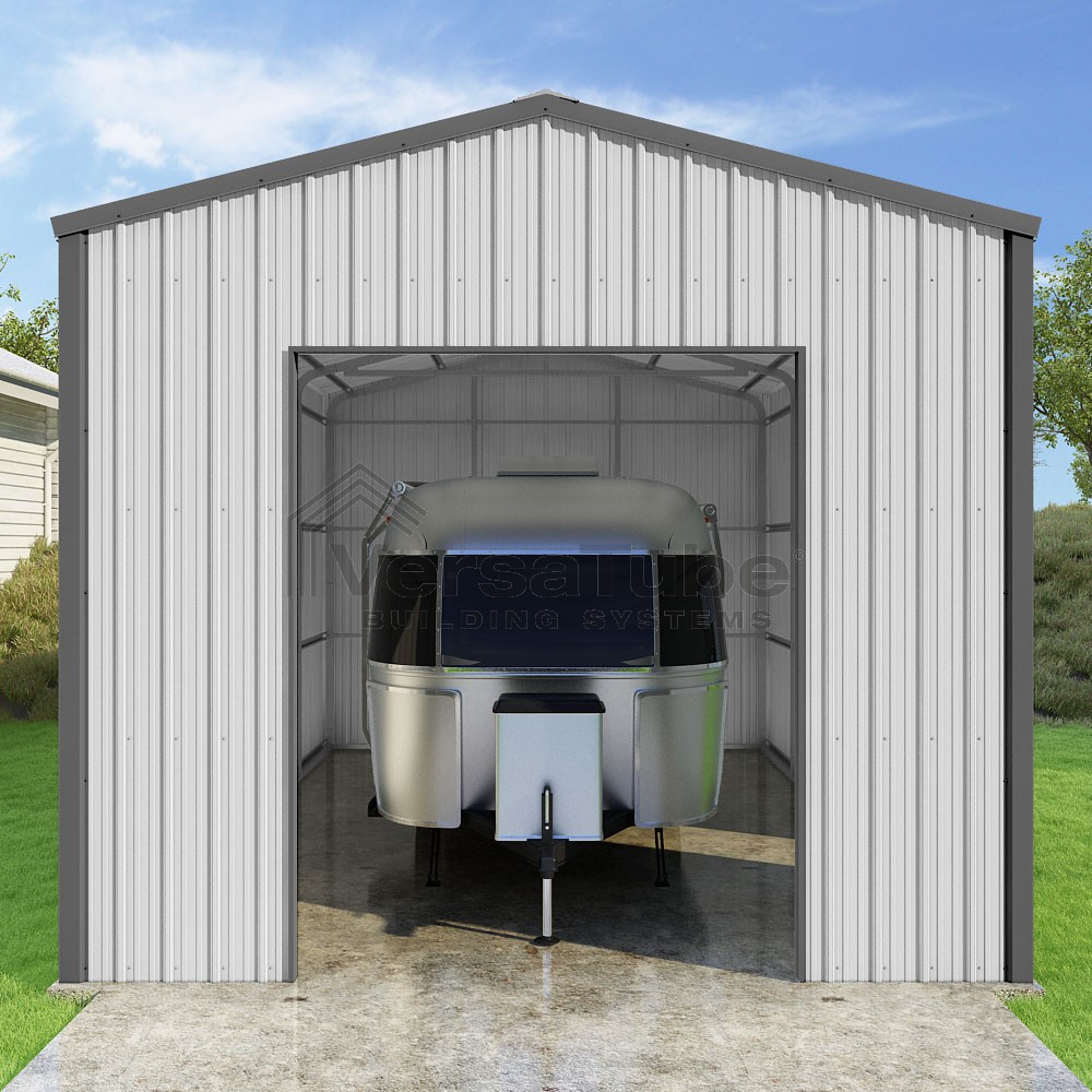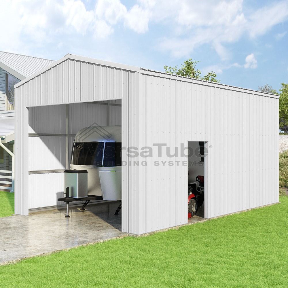 Summit Series DIY garage kit features vertical sheet metal roof and siding panels for a consistent look.