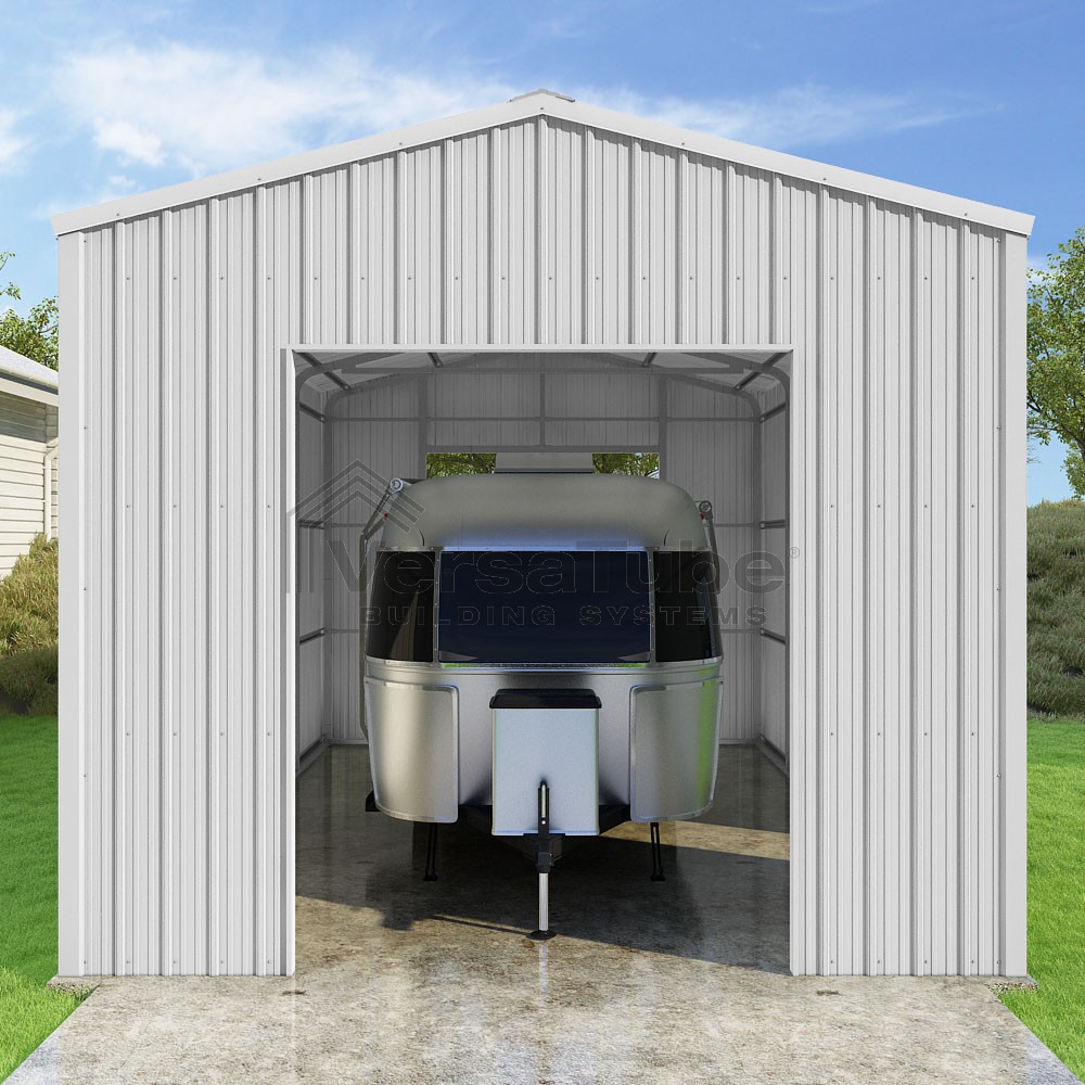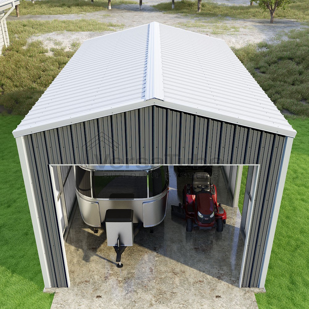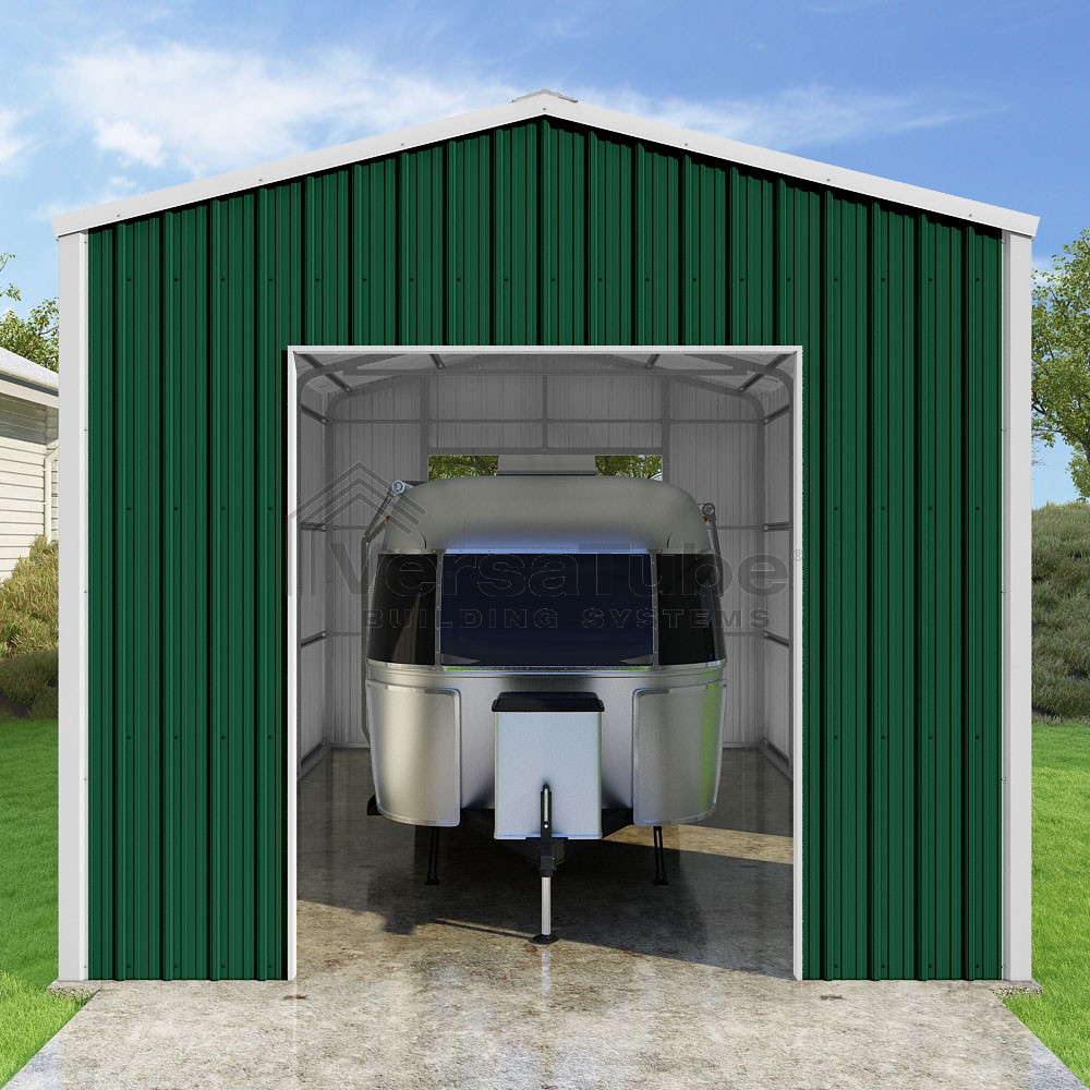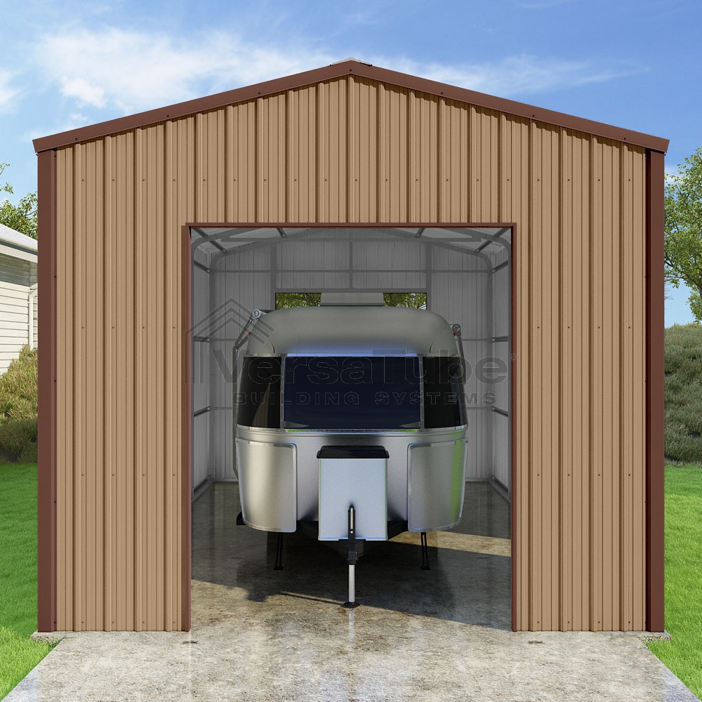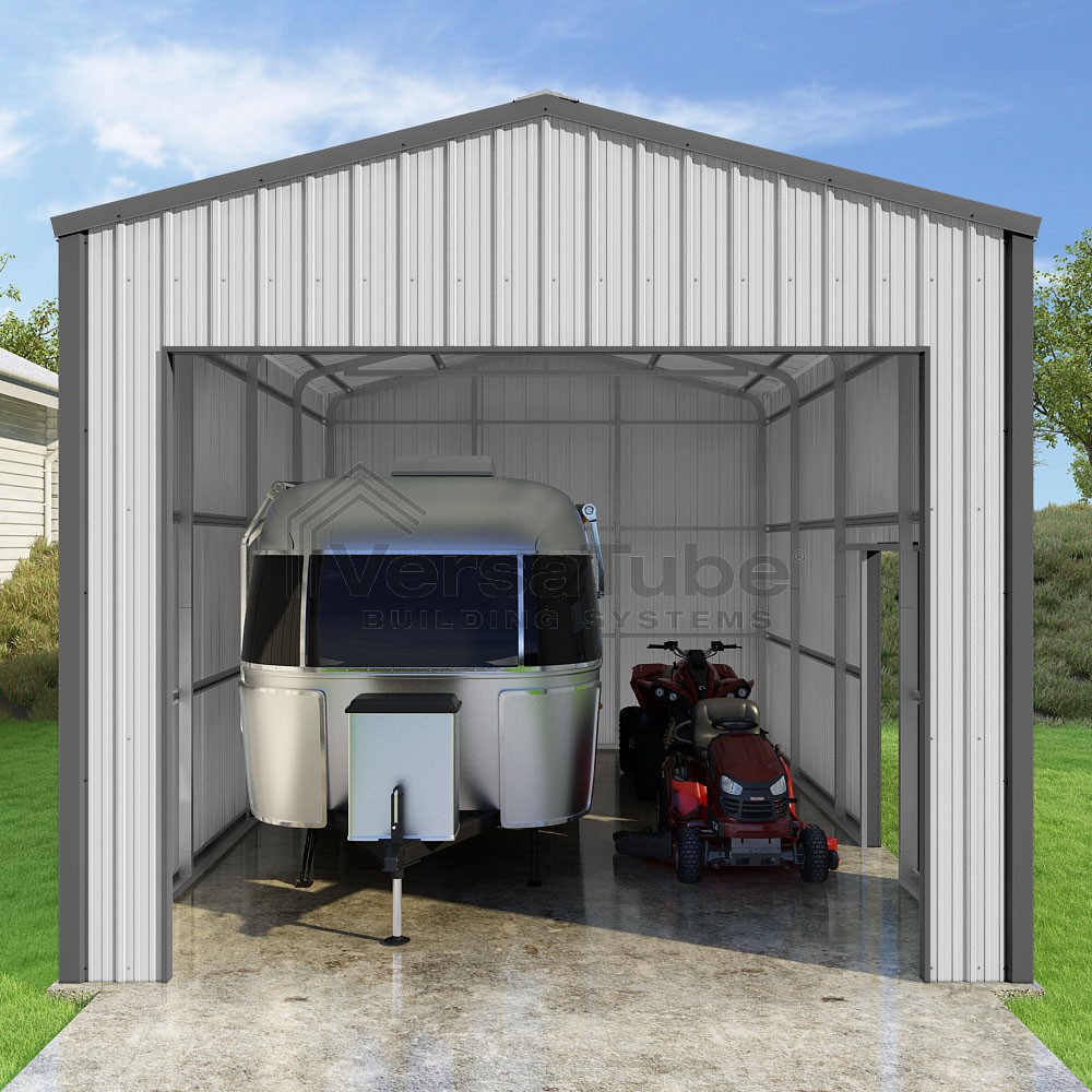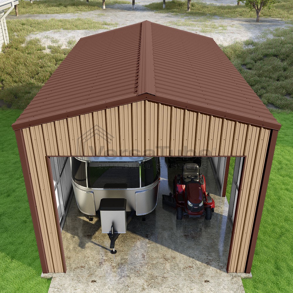 Summit Series DIY garage kit features vertical sheet metal roof and siding panels for a consistent look.