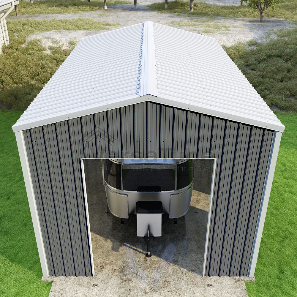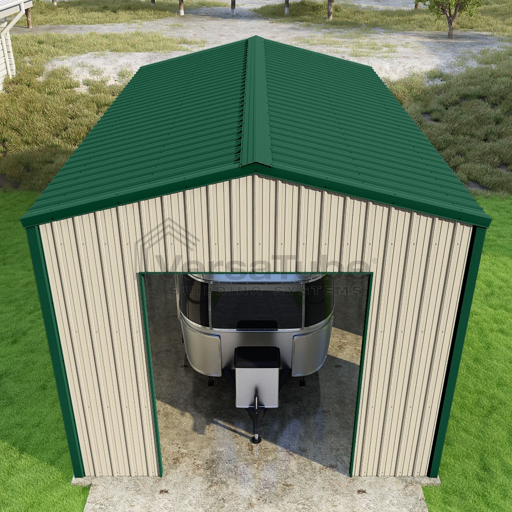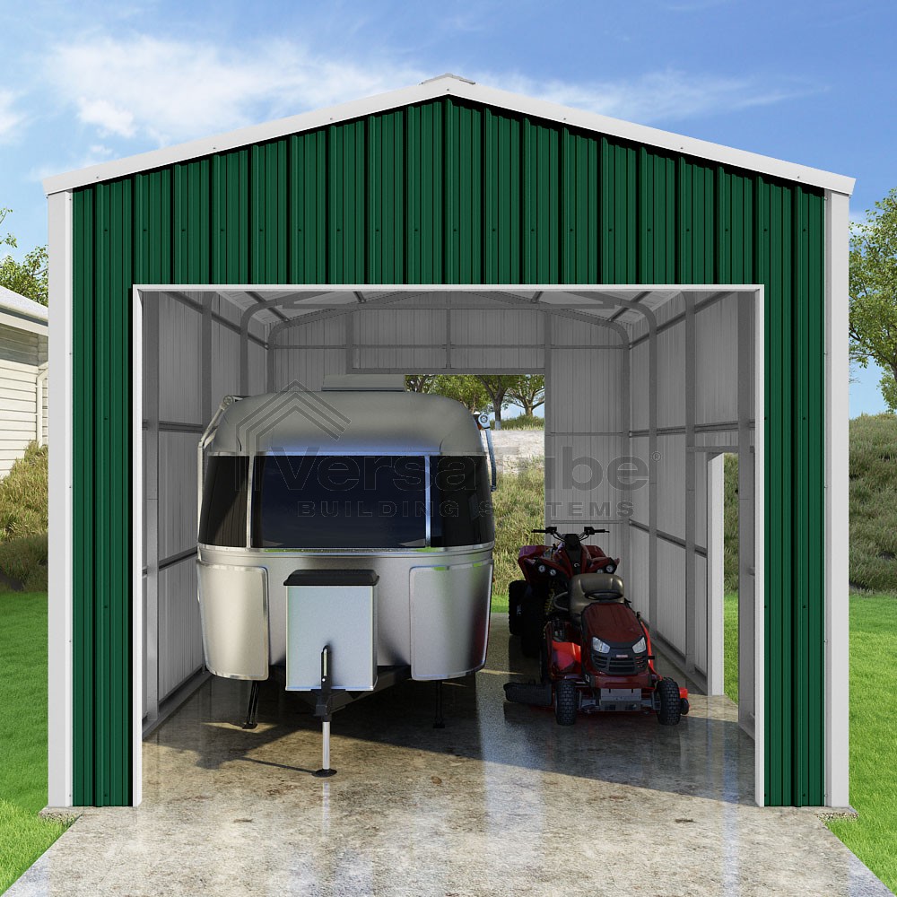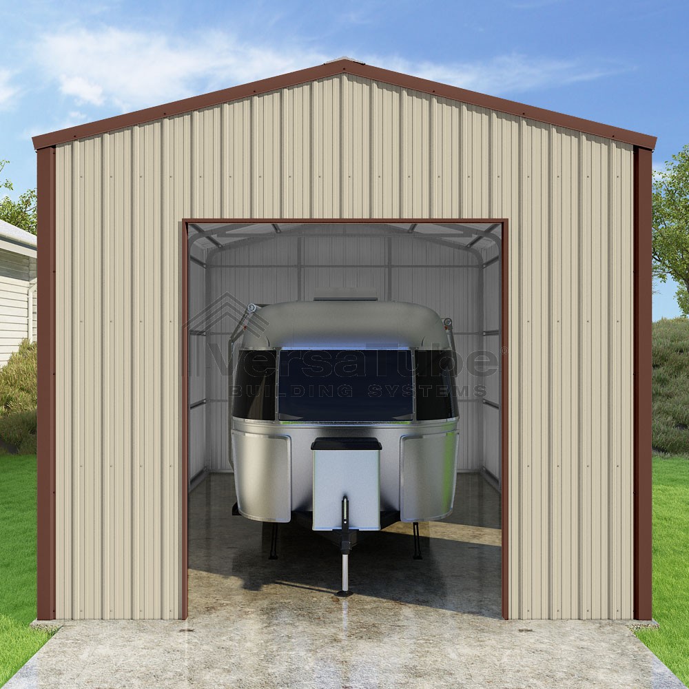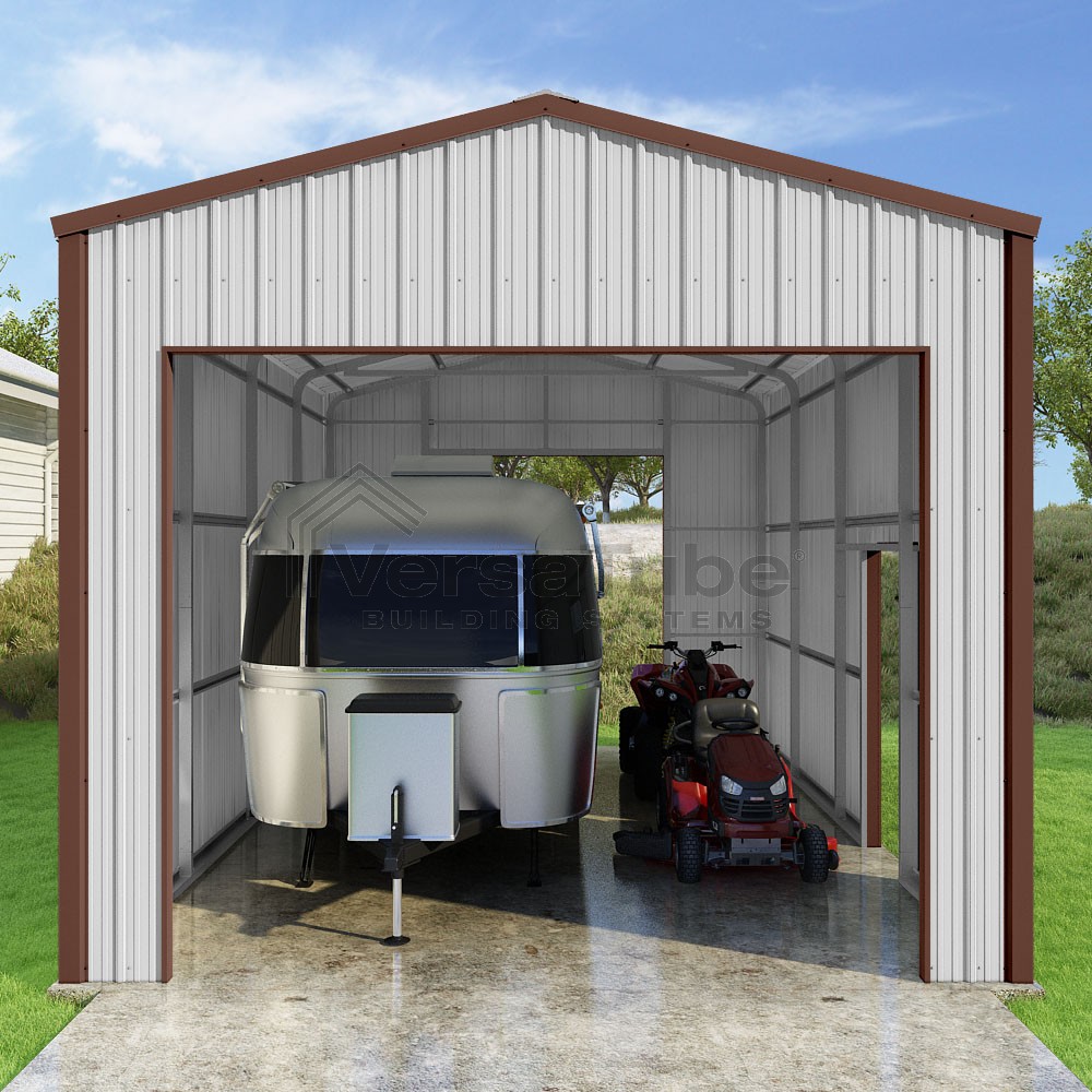 Summit Series DIY garage kit features vertical sheet metal roof and siding panels for a consistent look.