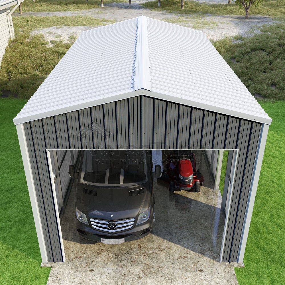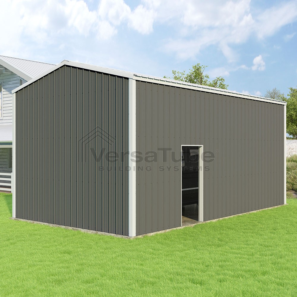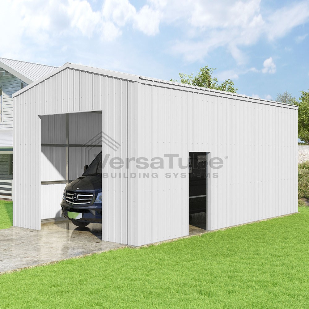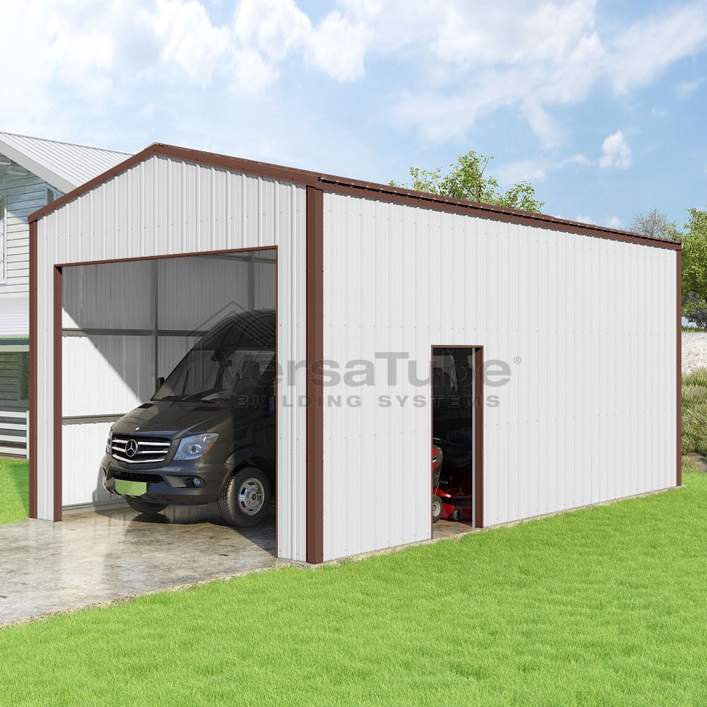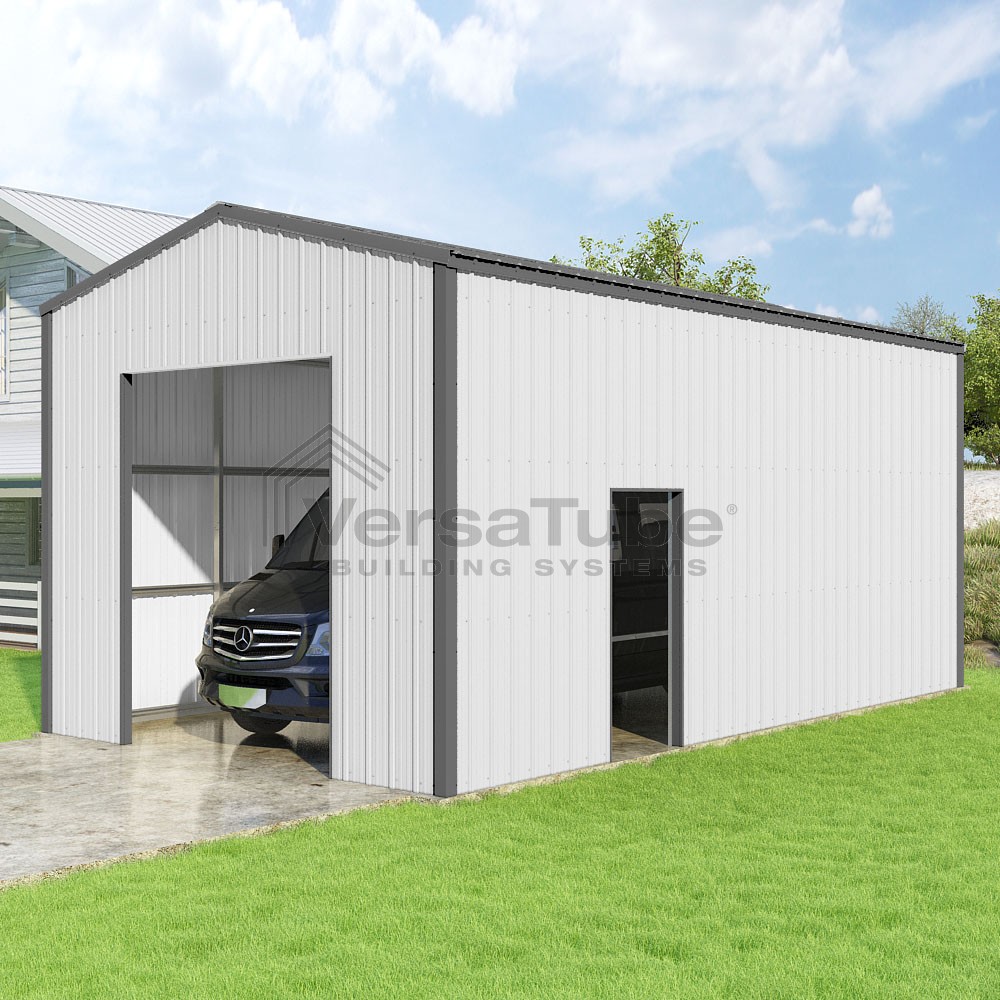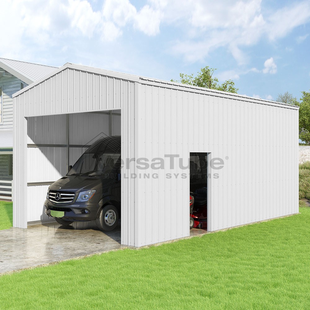 Summit Series DIY garage kit features vertical sheet metal roof and siding panels for a consistent look.