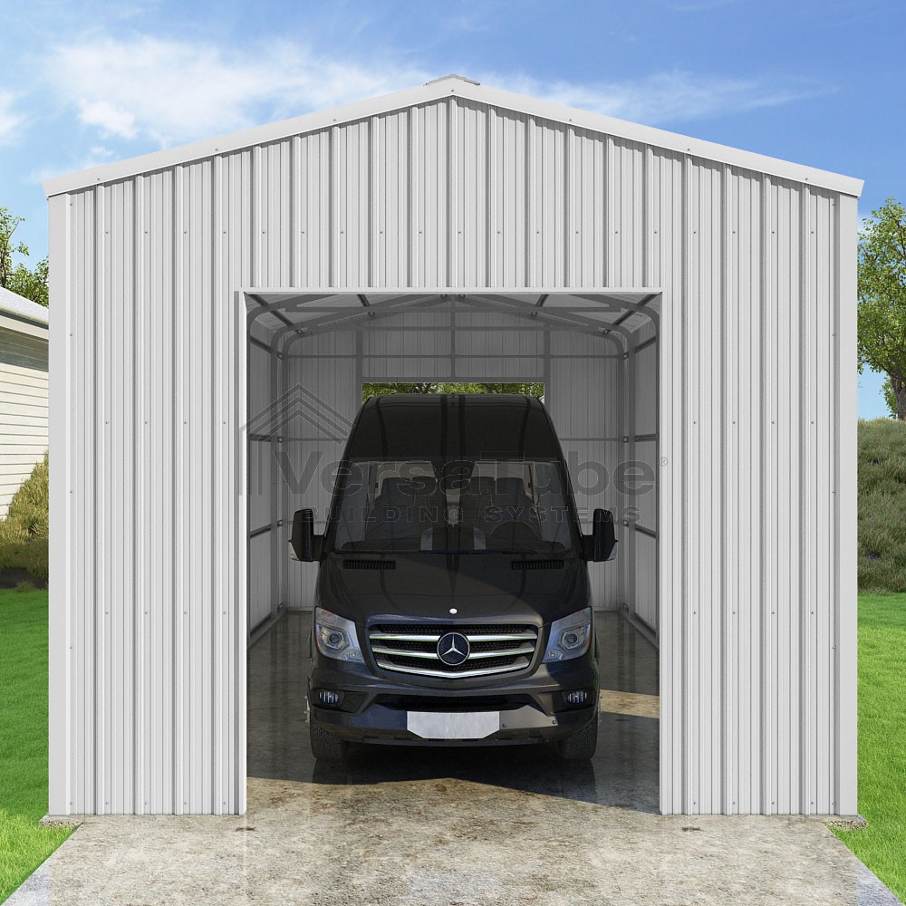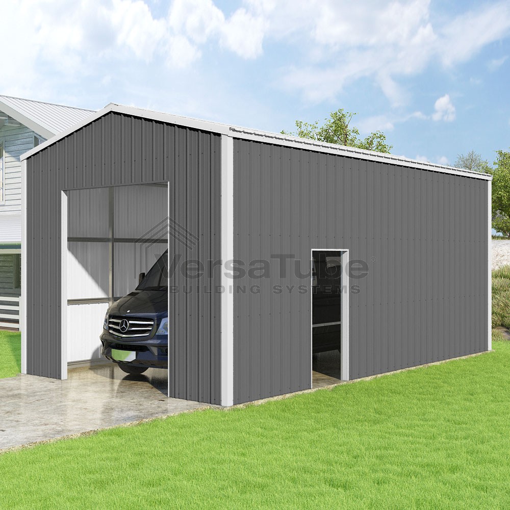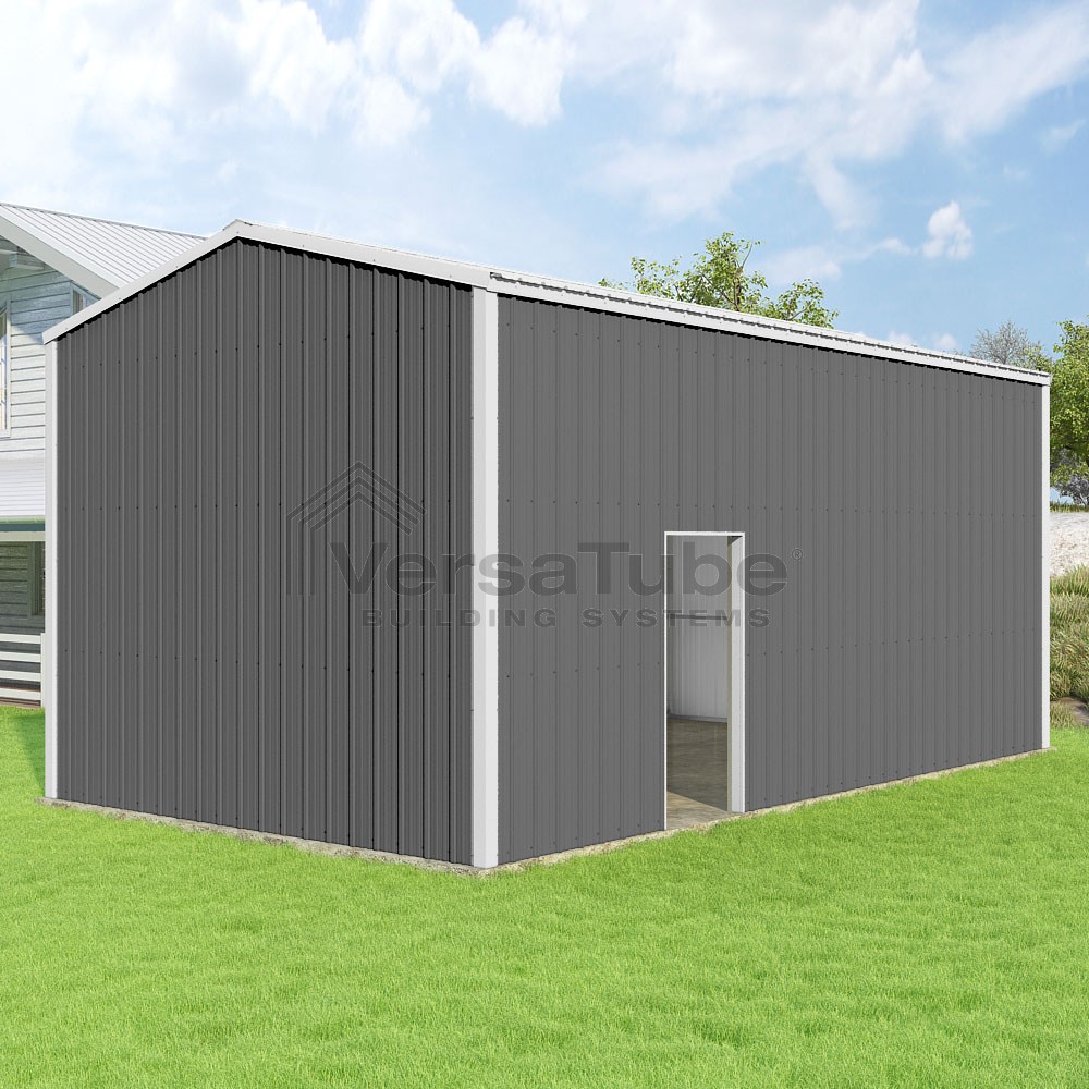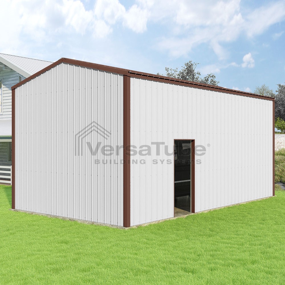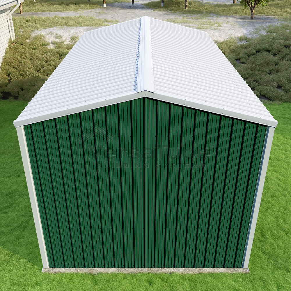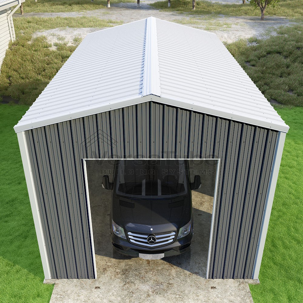 Summit Series DIY garage kit features vertical sheet metal roof and siding panels for a consistent look.