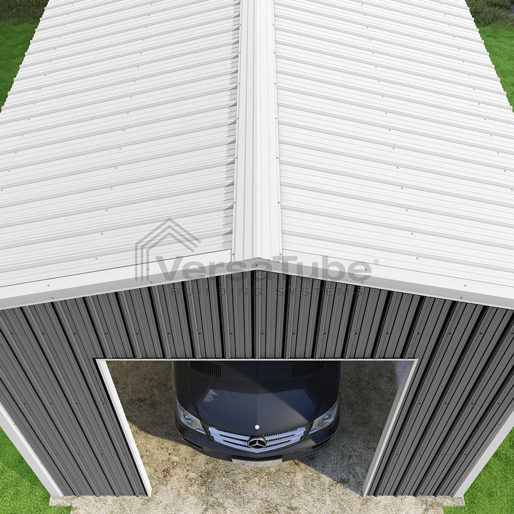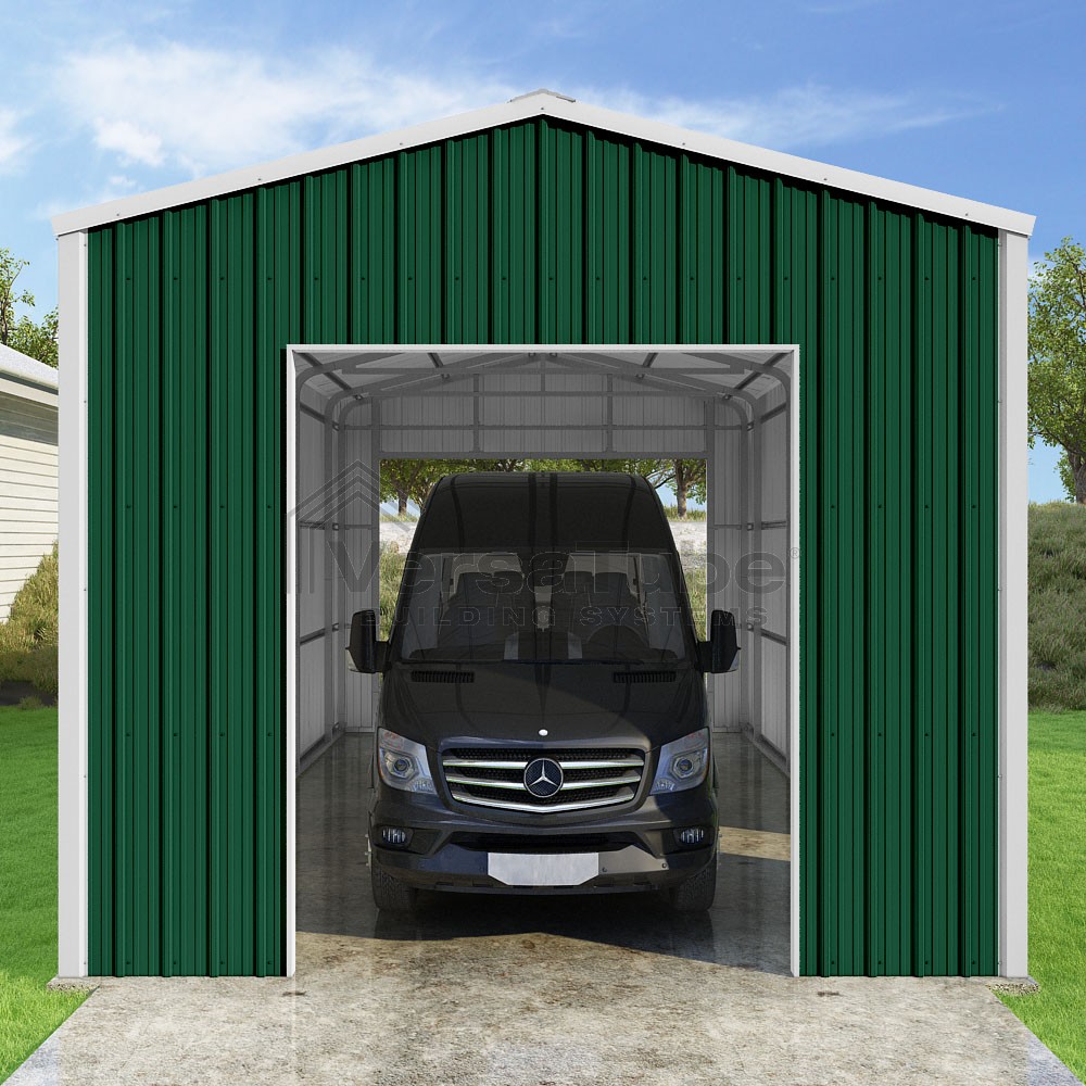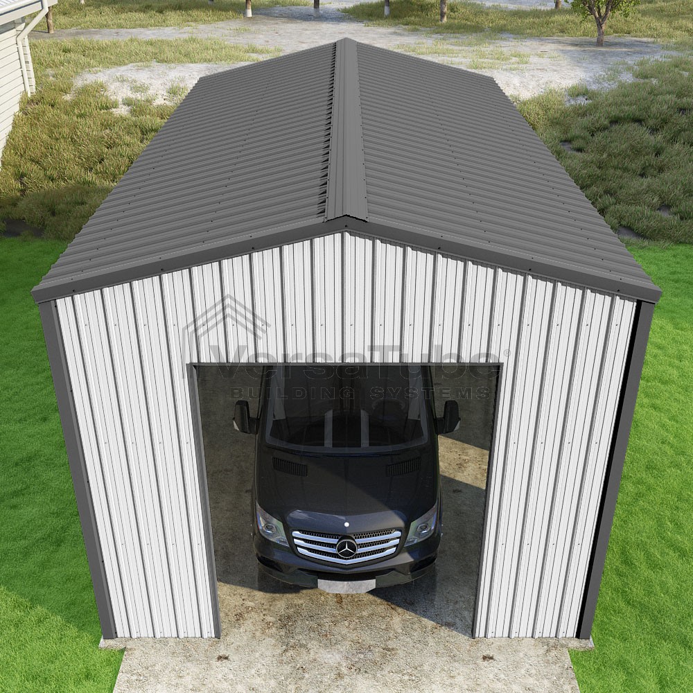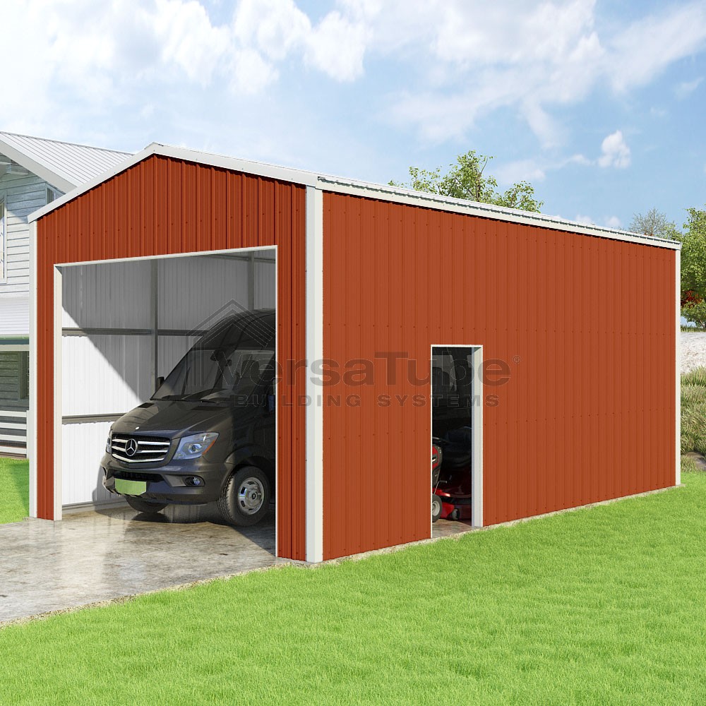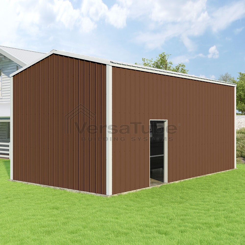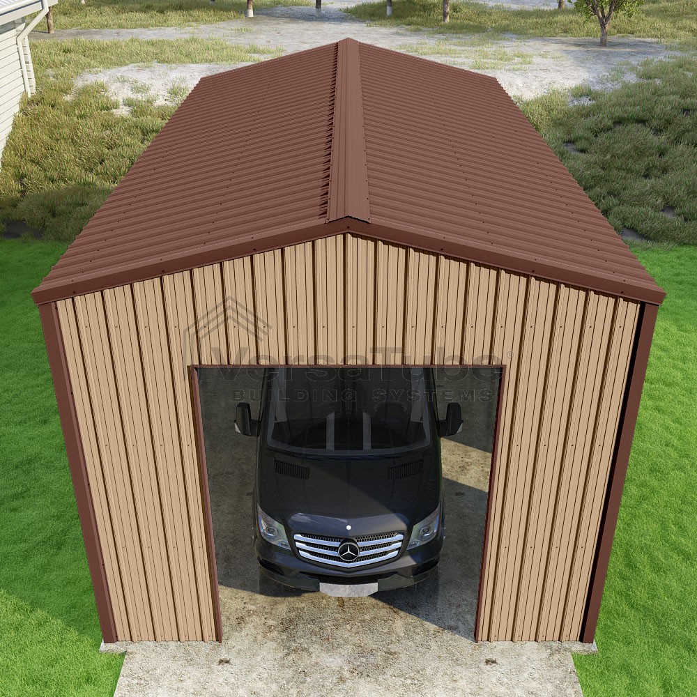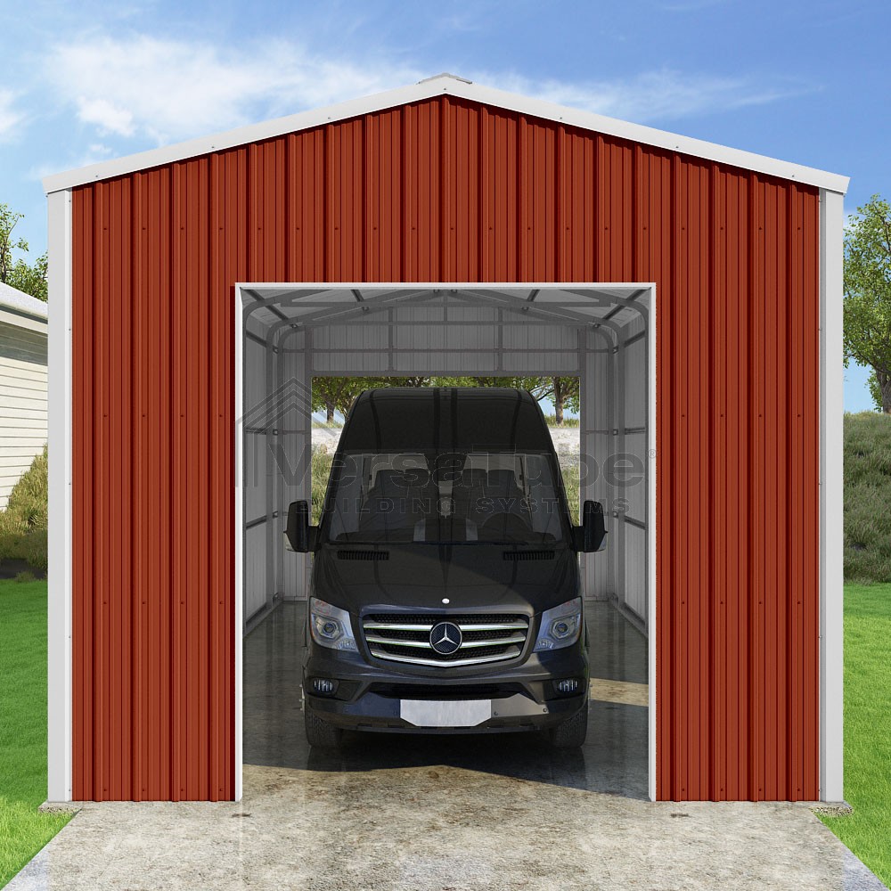 Summit Series DIY garage kit features vertical sheet metal roof and siding panels for a consistent look.
