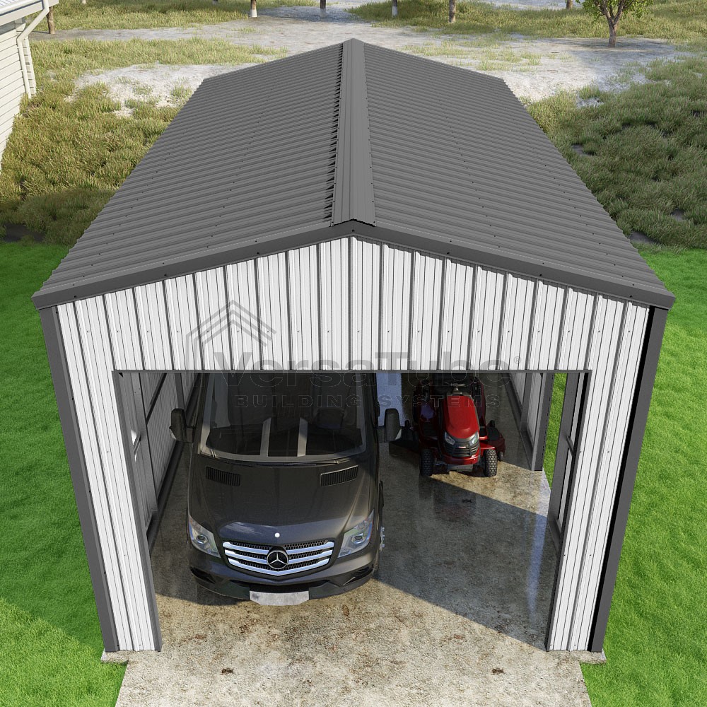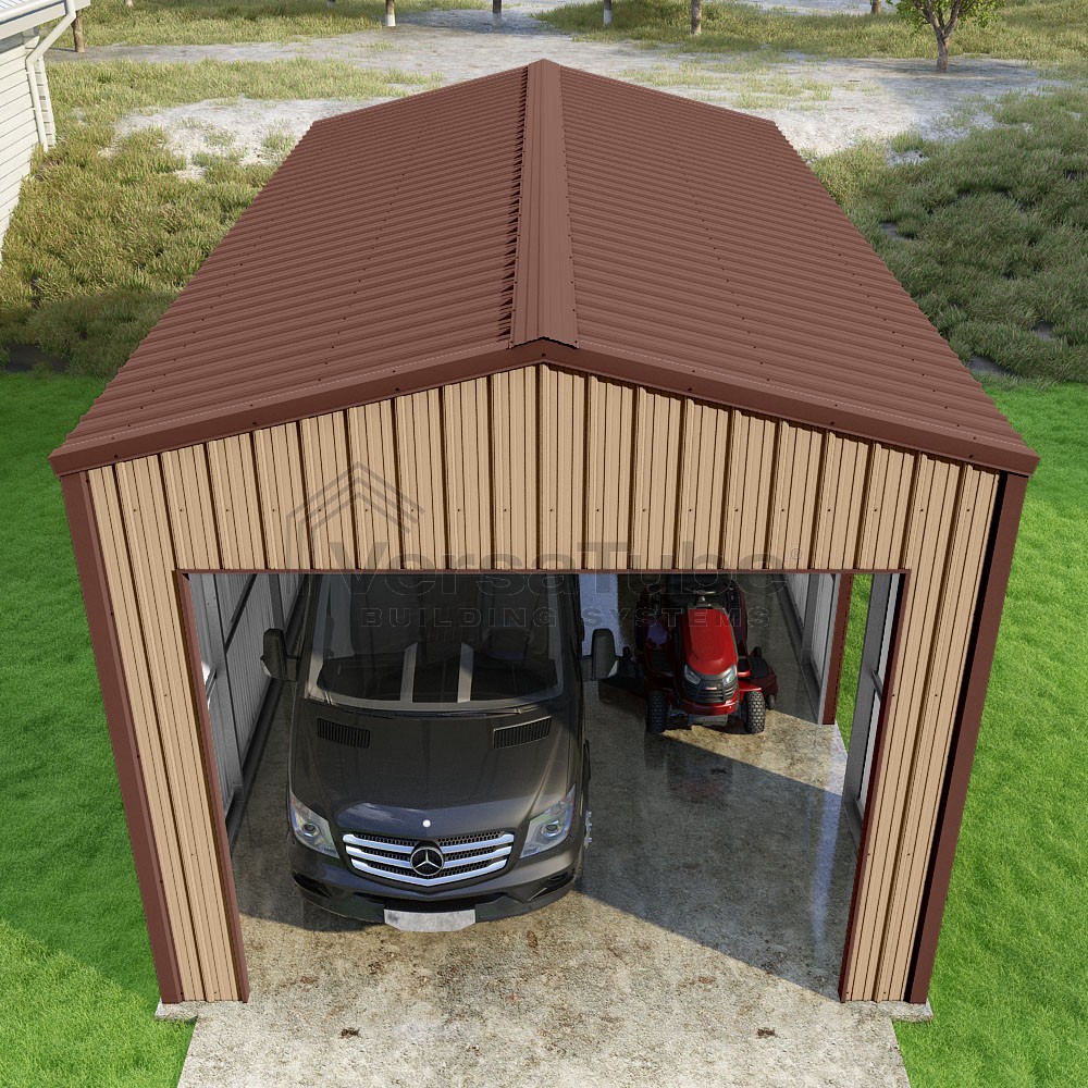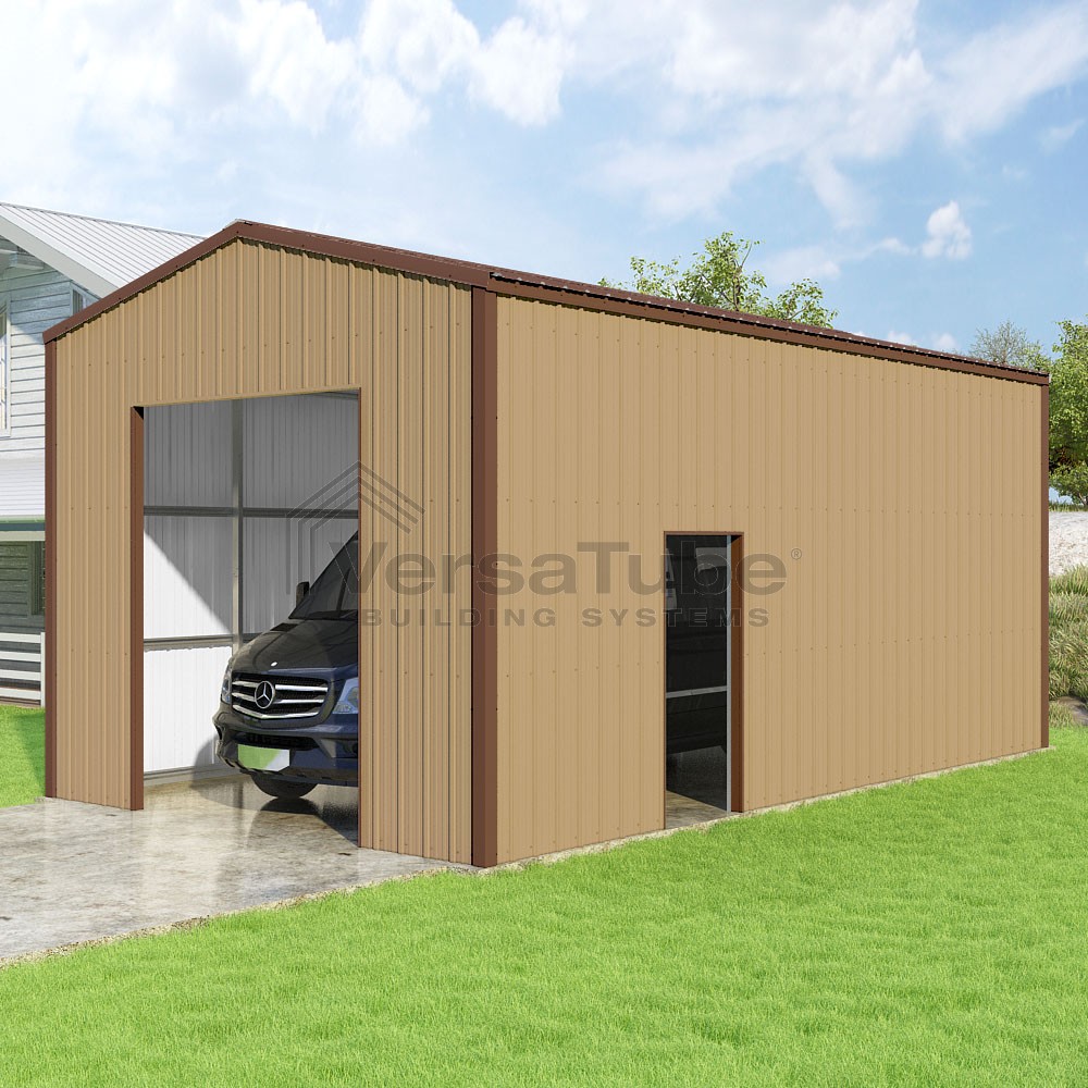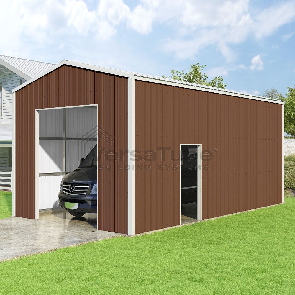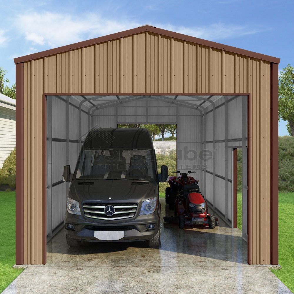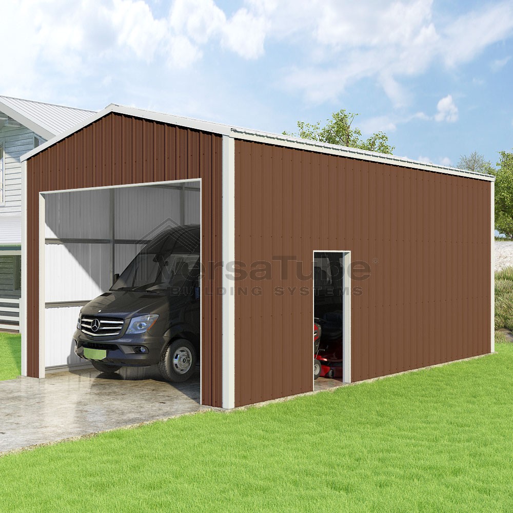 Summit Series DIY garage kit features vertical sheet metal roof and siding panels for a consistent look.