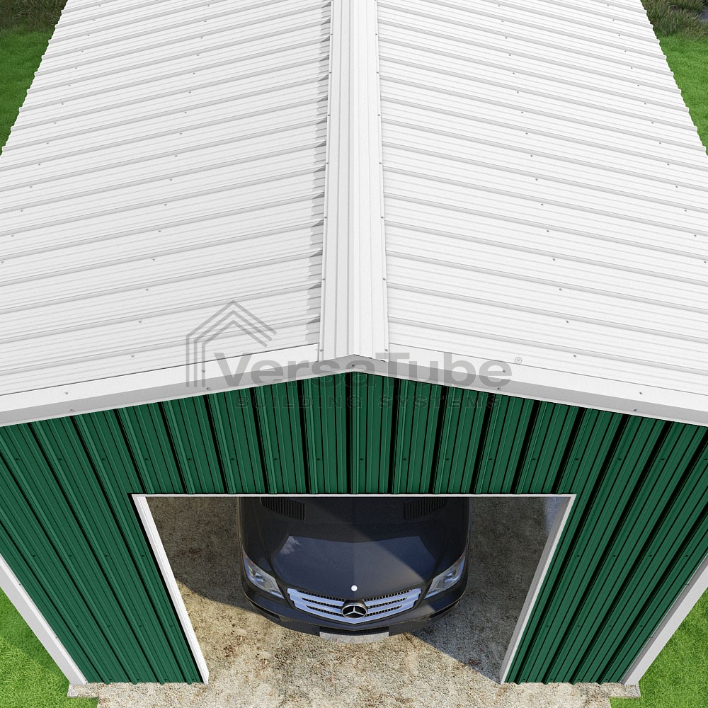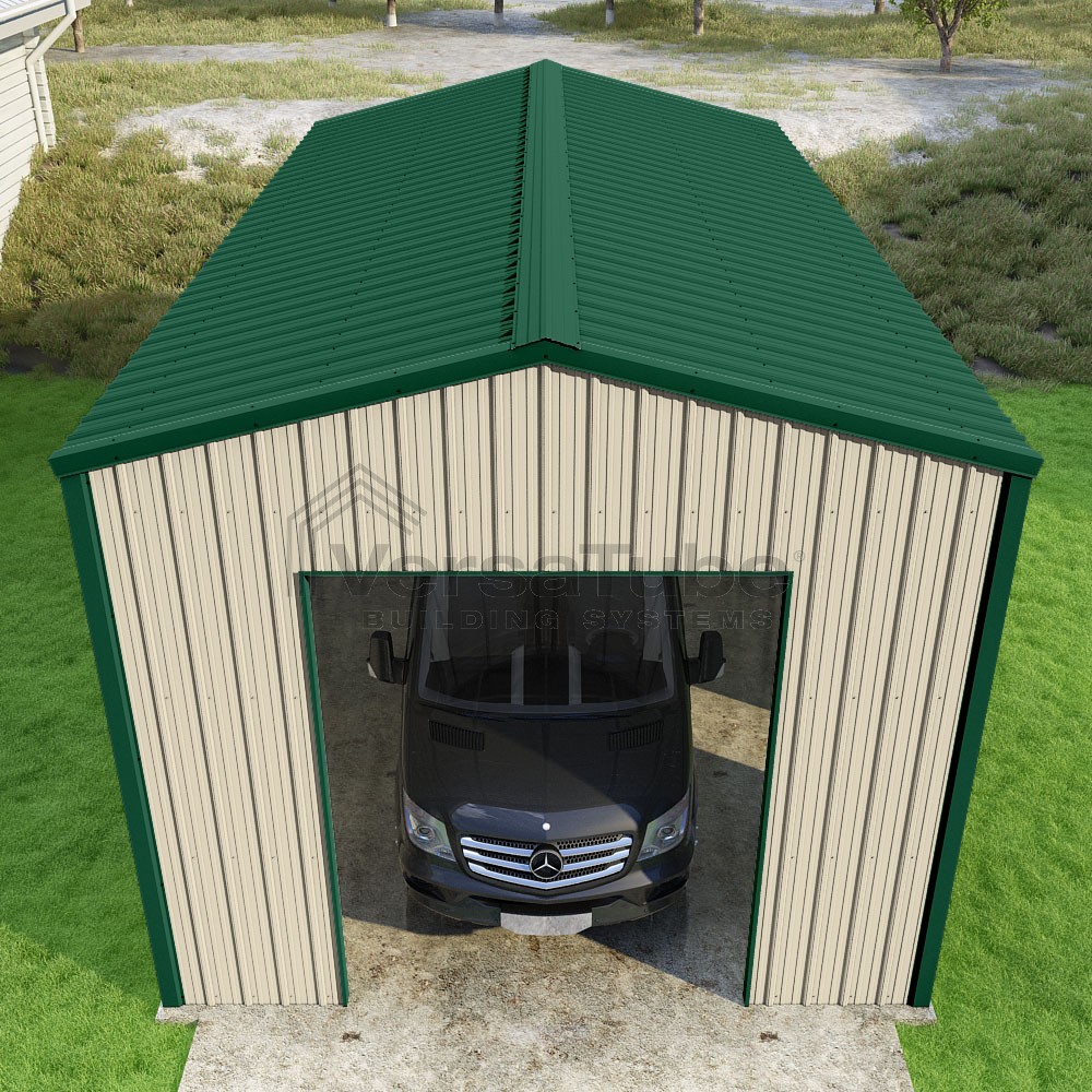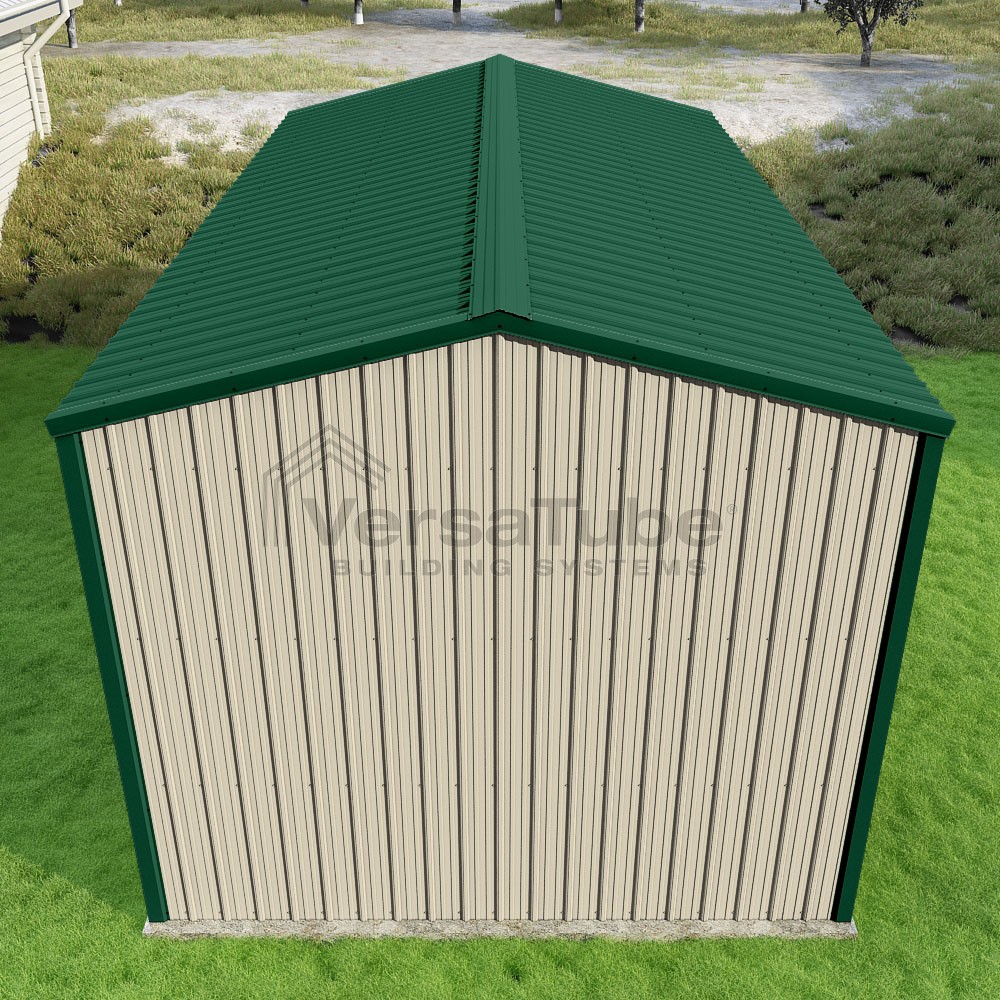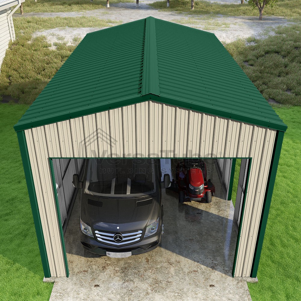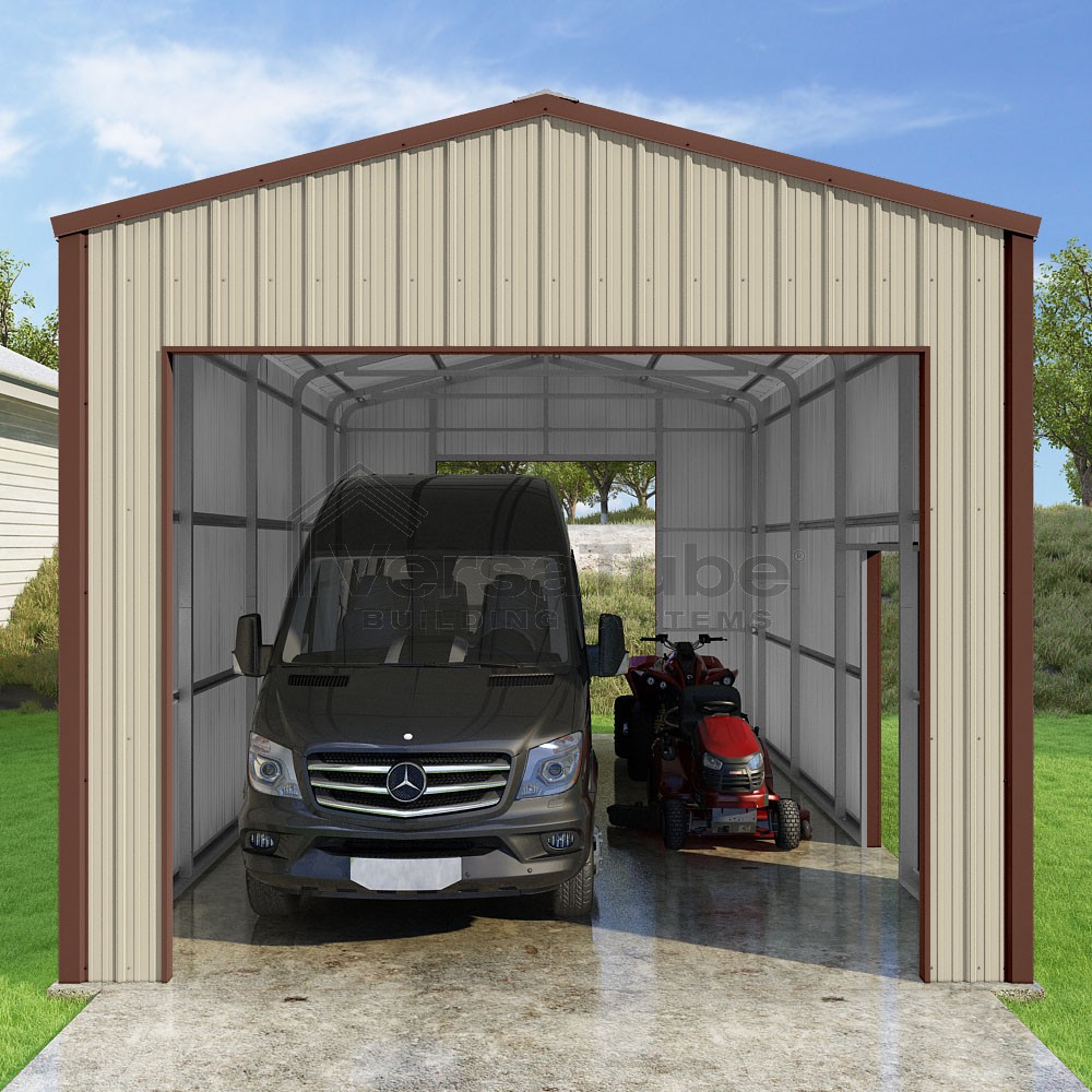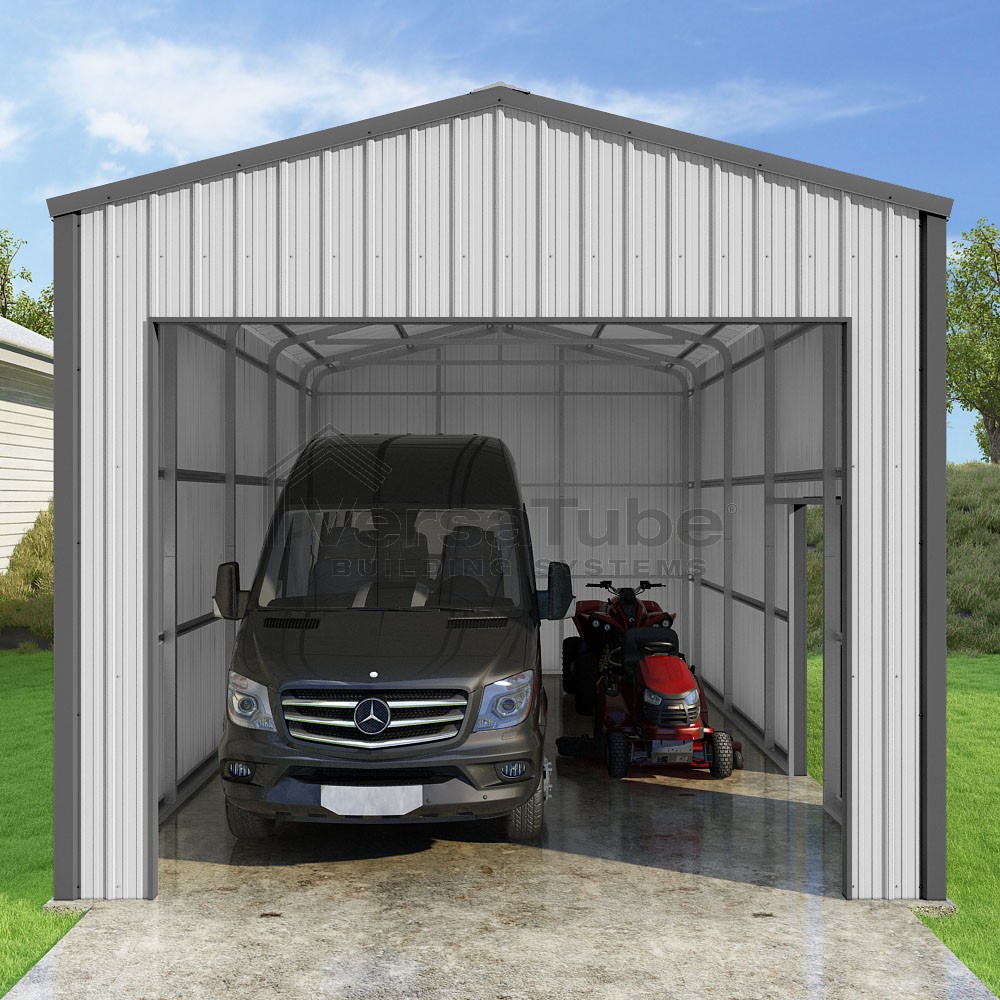 Summit Series DIY garage kit features vertical sheet metal roof and siding panels for a consistent look.