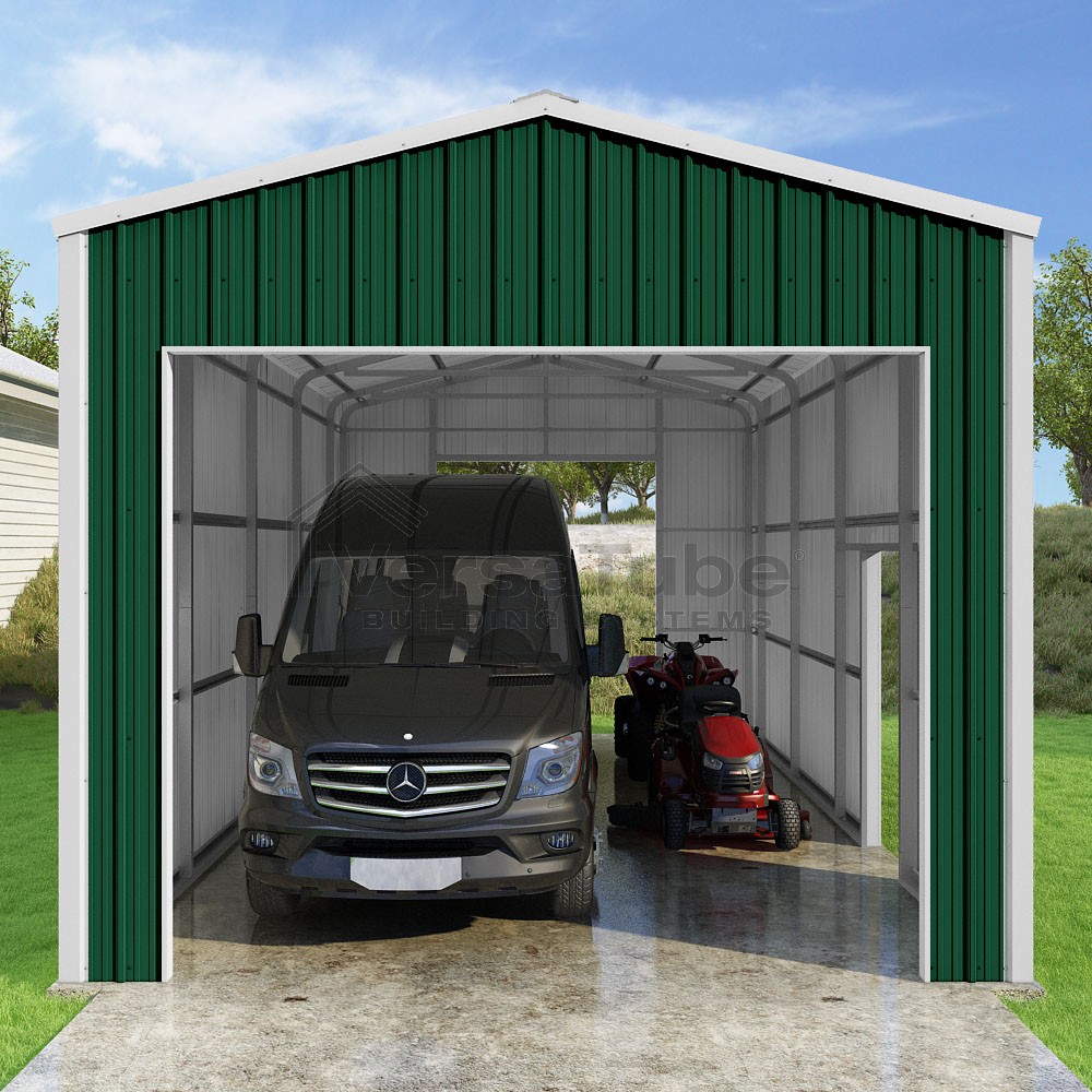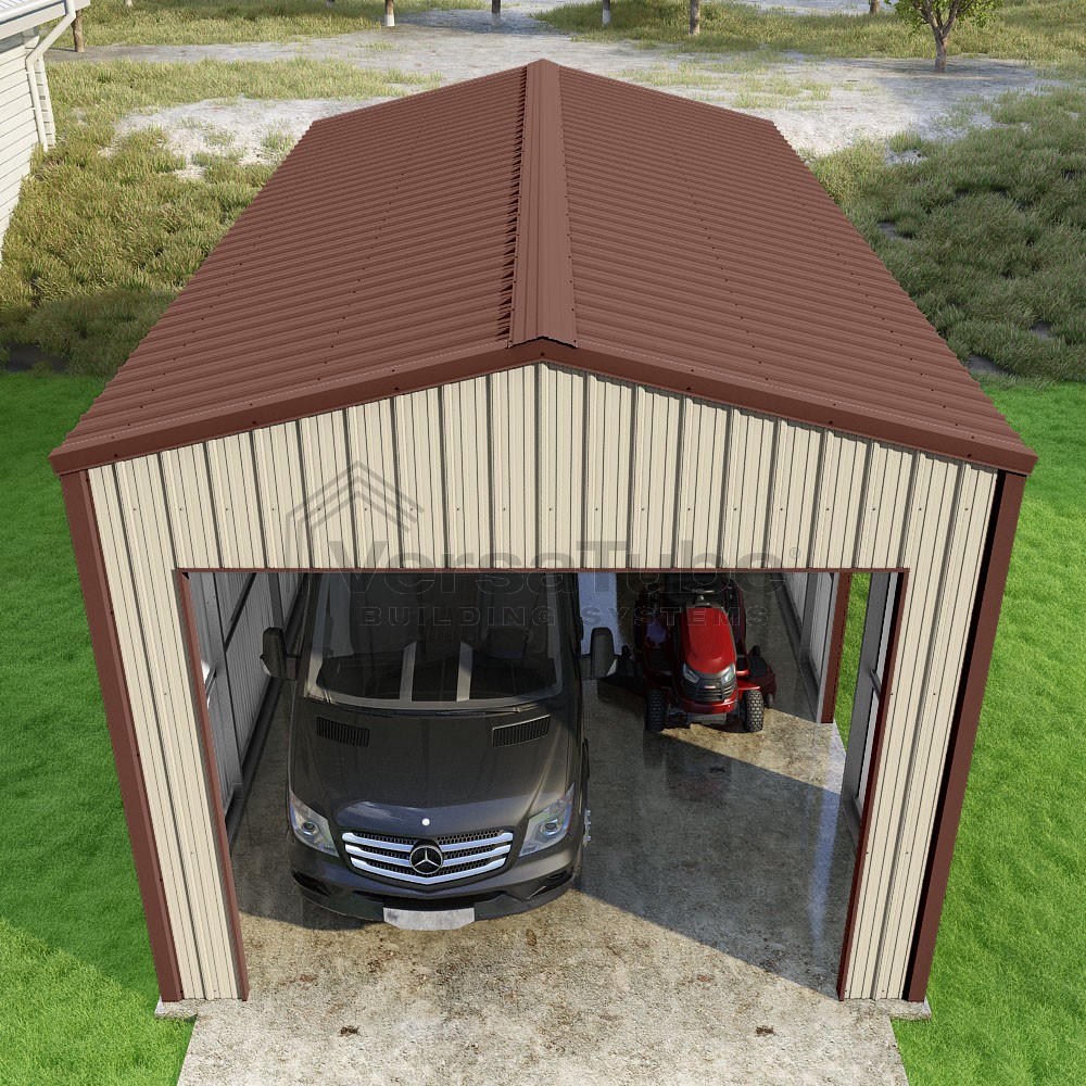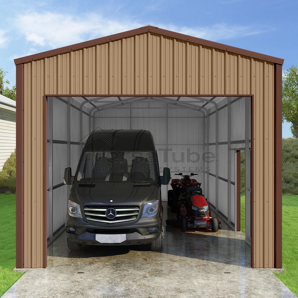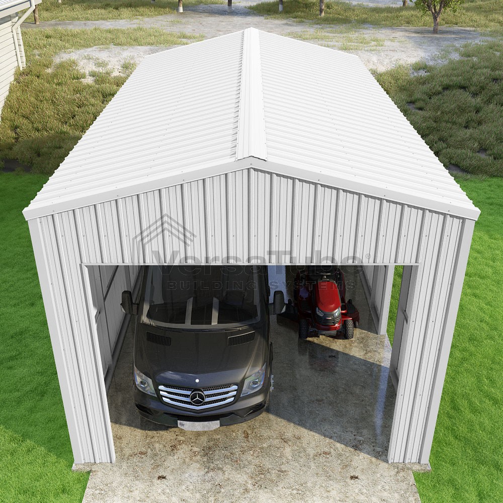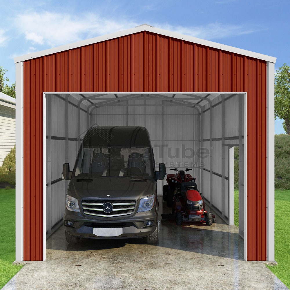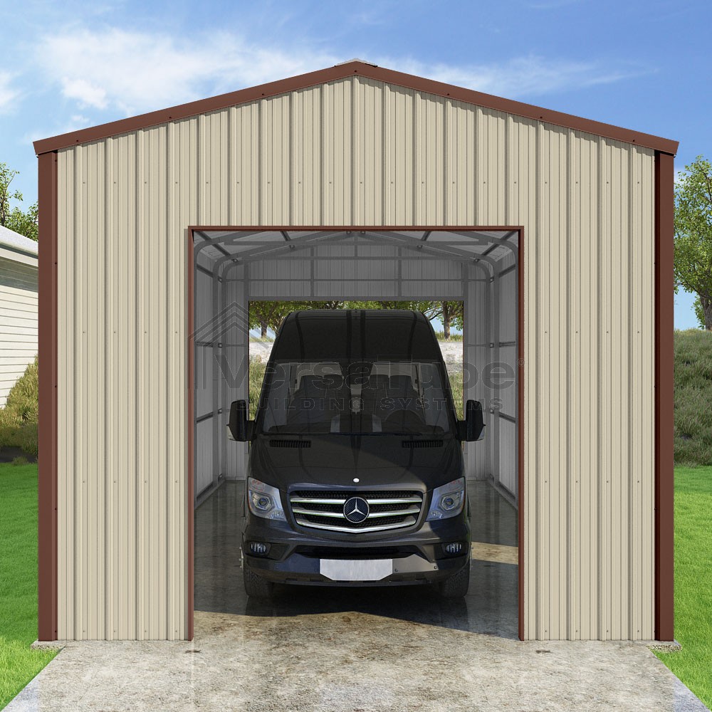 Summit Series DIY garage kit features vertical sheet metal roof and siding panels for a consistent look.