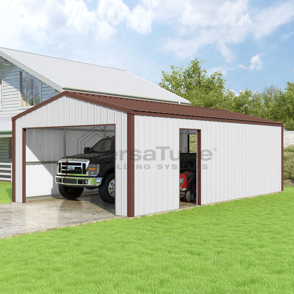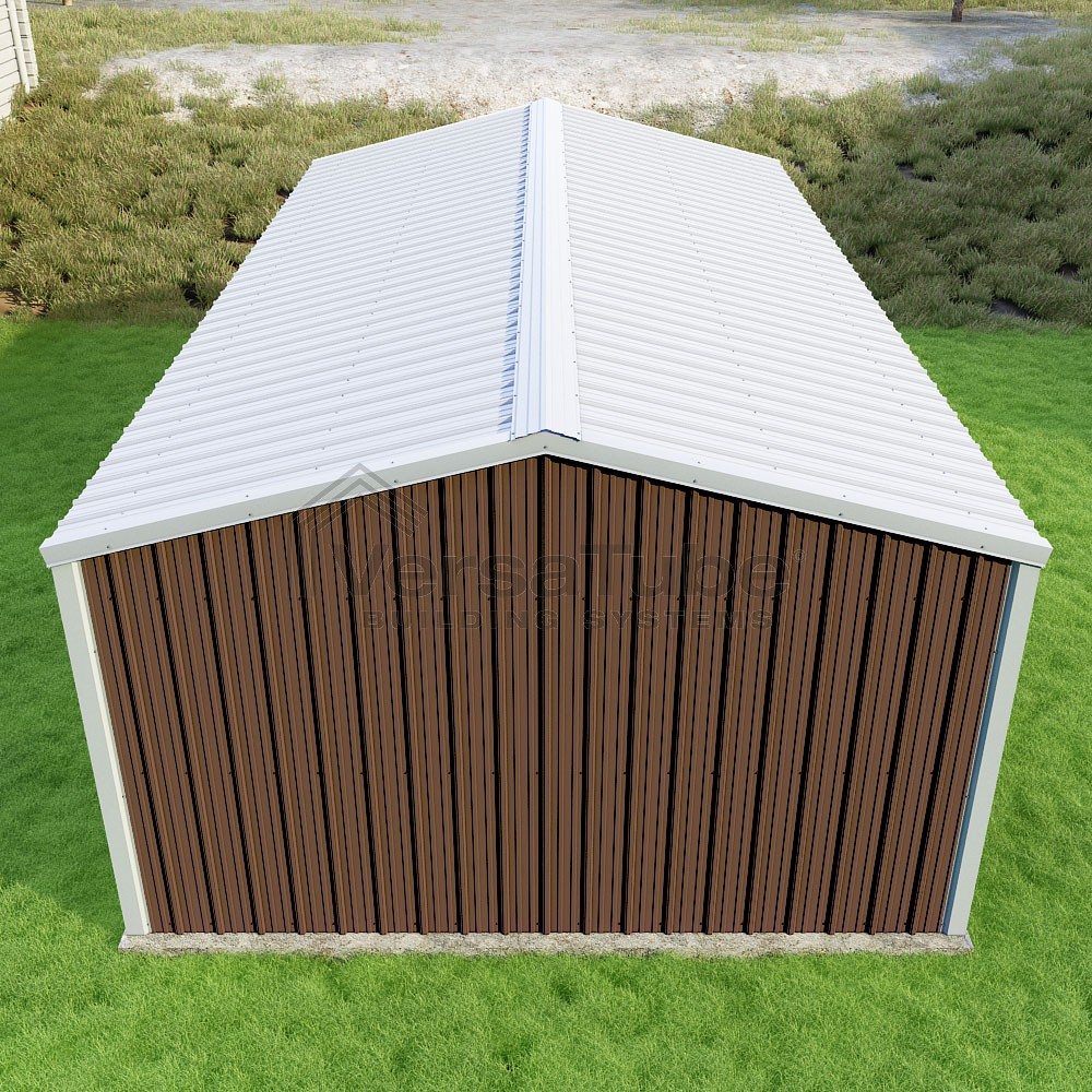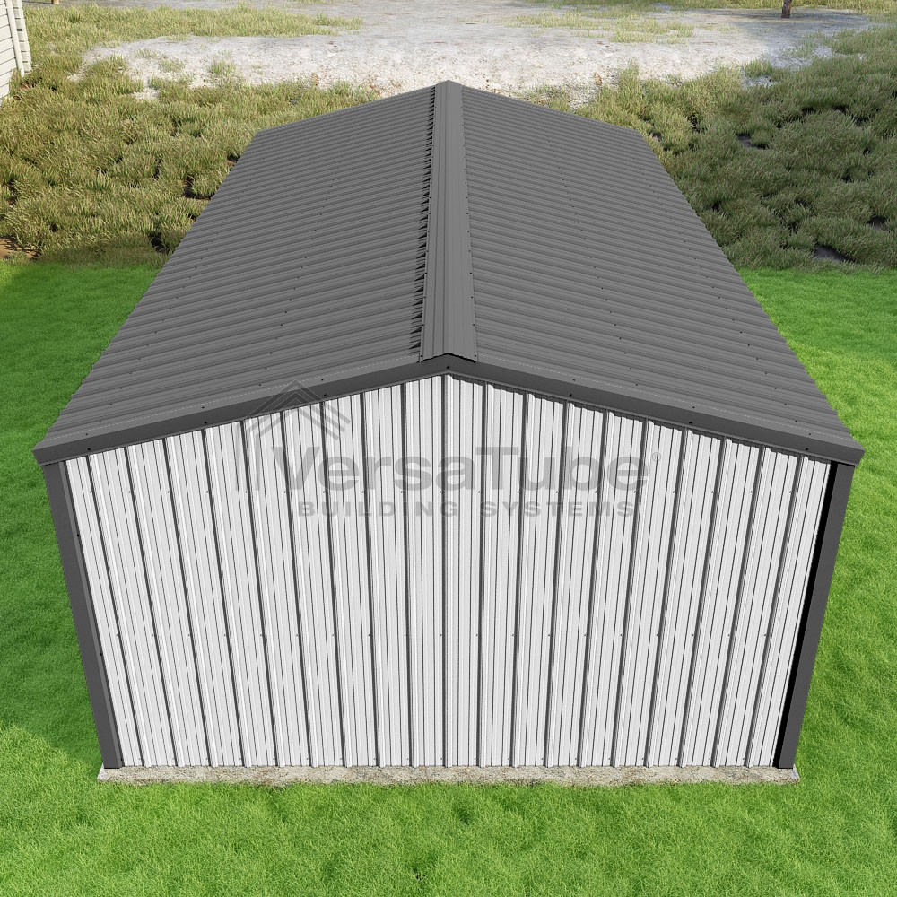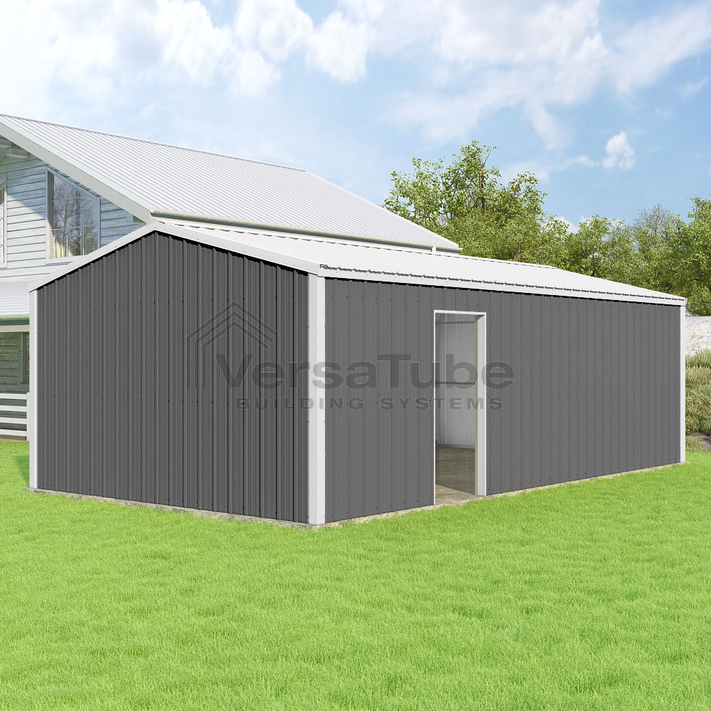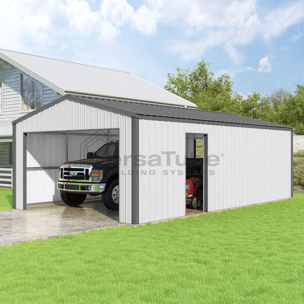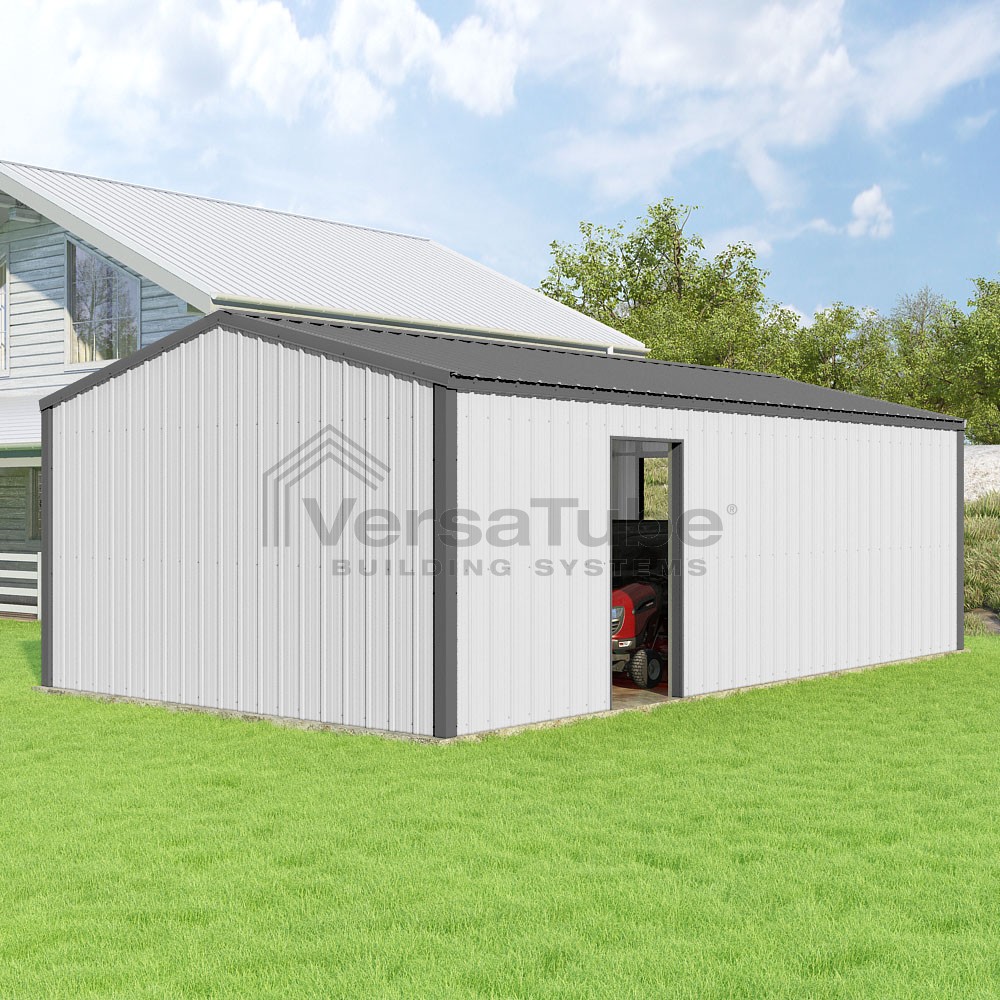 Summit Series DIY garage kit features vertical sheet metal roof and siding panels for a consistent look.