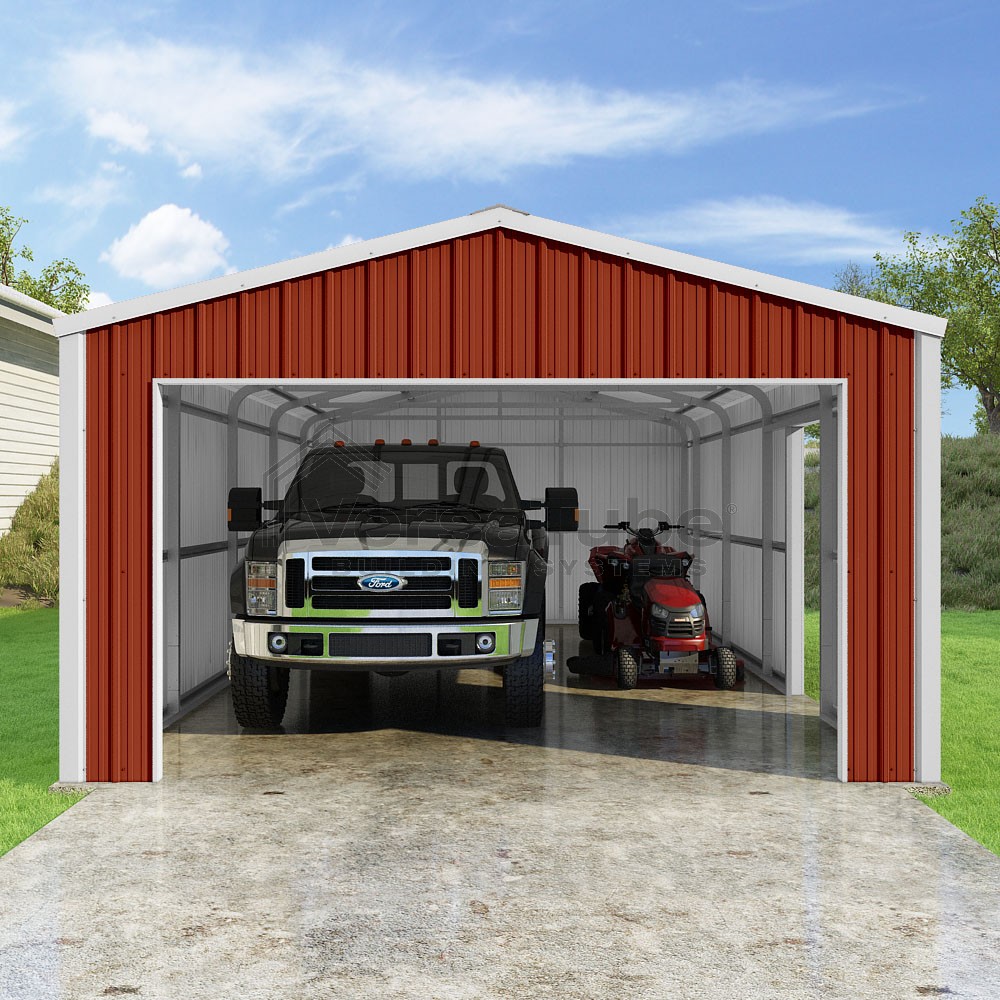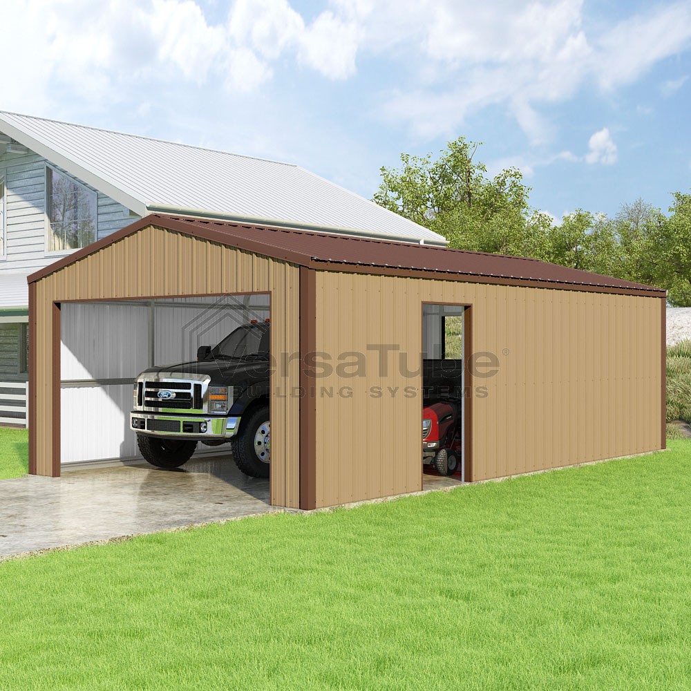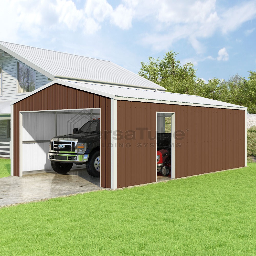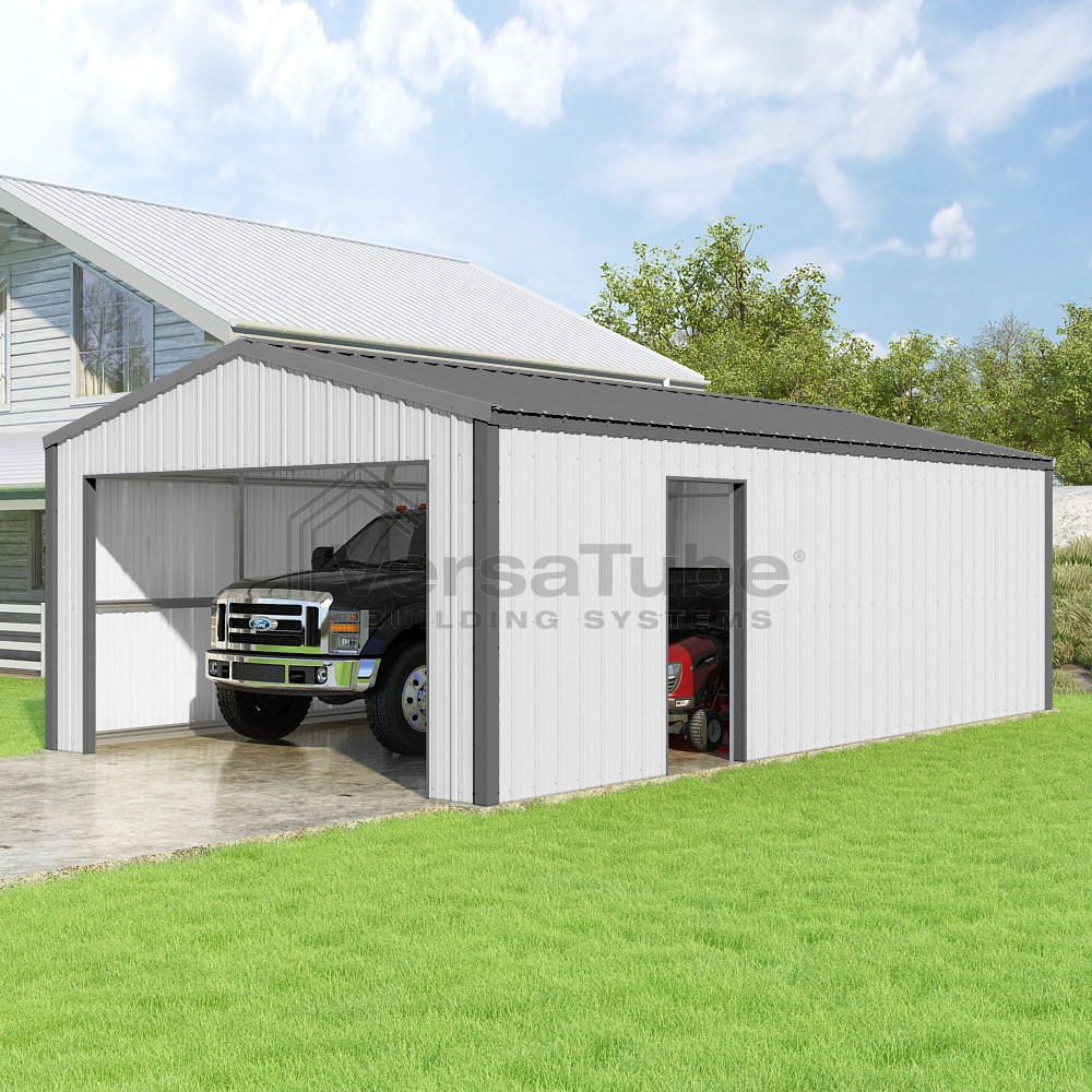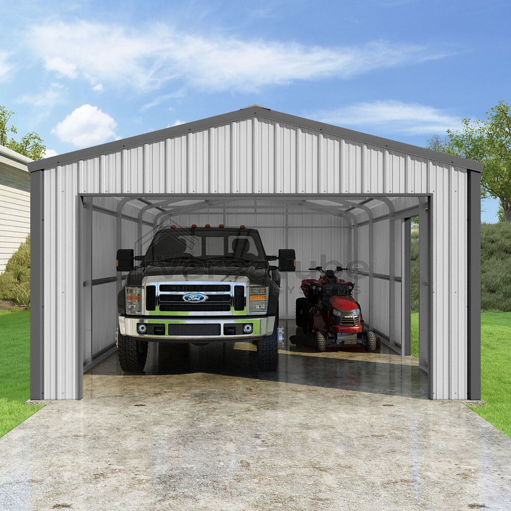 Summit Series DIY garage kit features vertical sheet metal roof and siding panels for a consistent look.