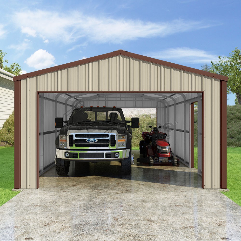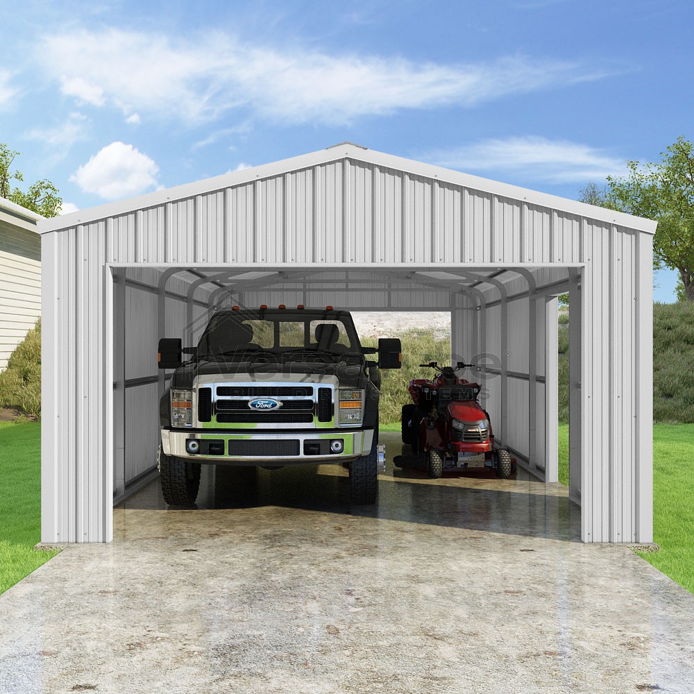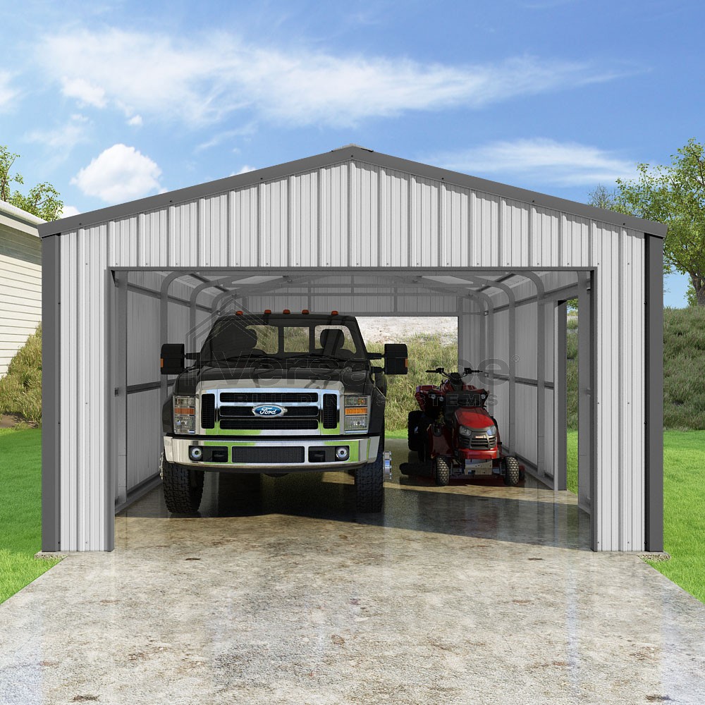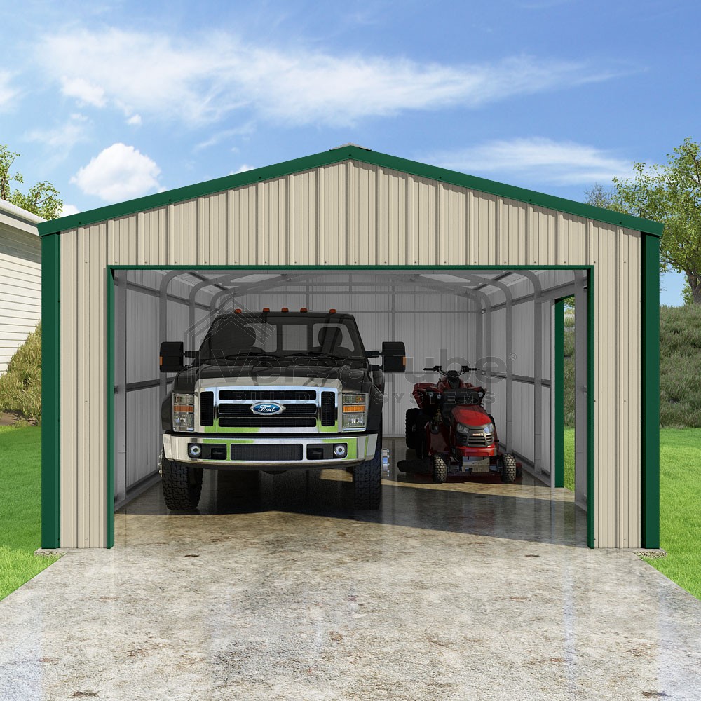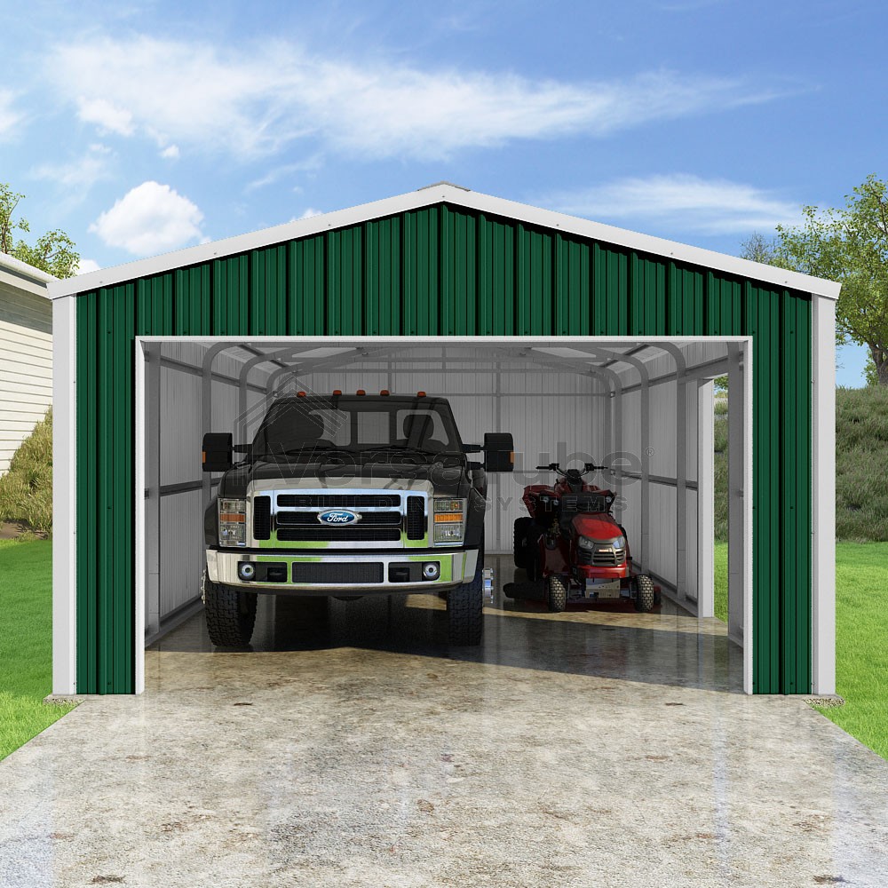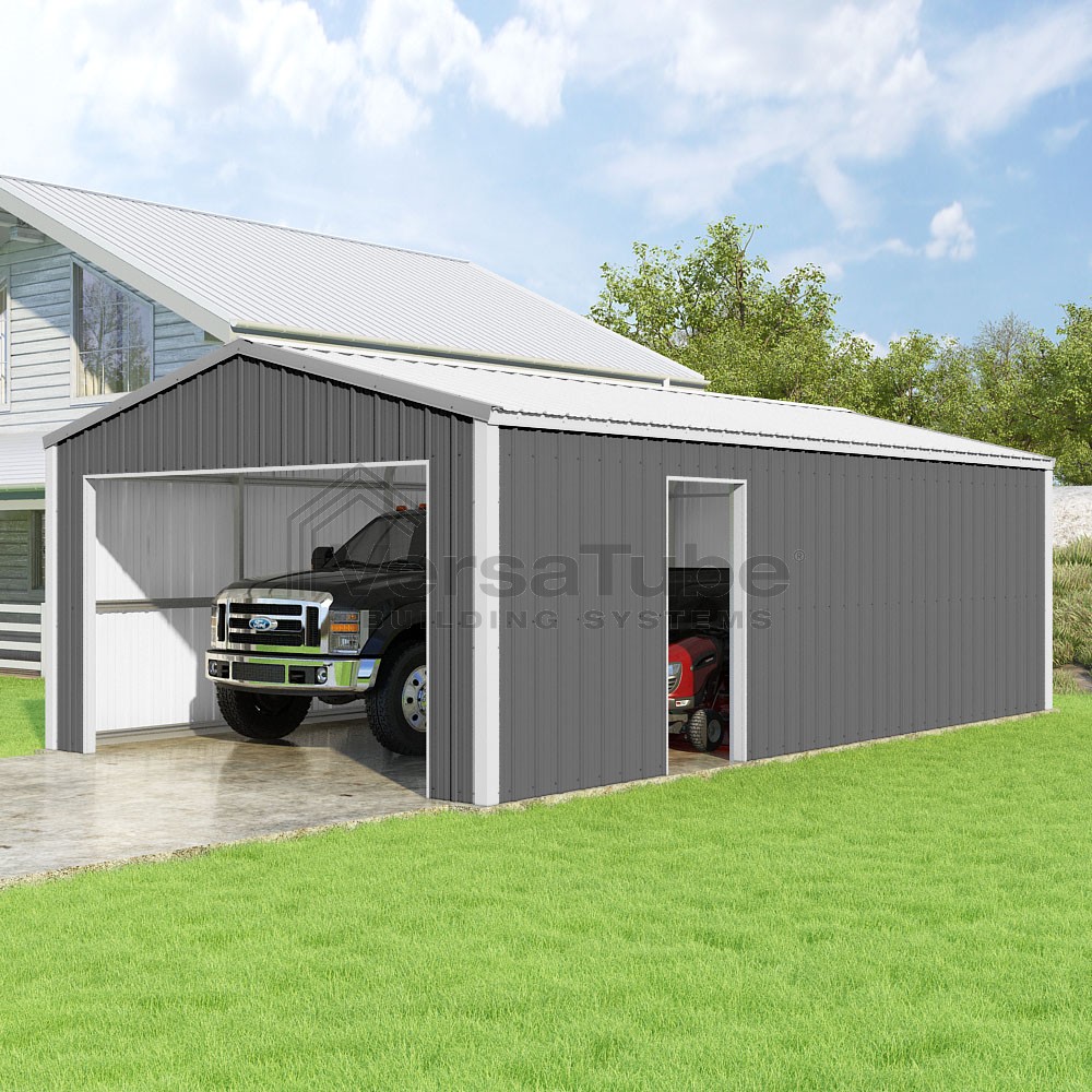Summit Series DIY garage kit features vertical sheet metal roof and siding panels for a consistent look.