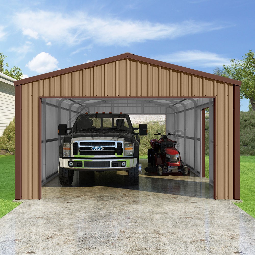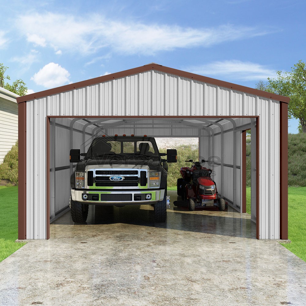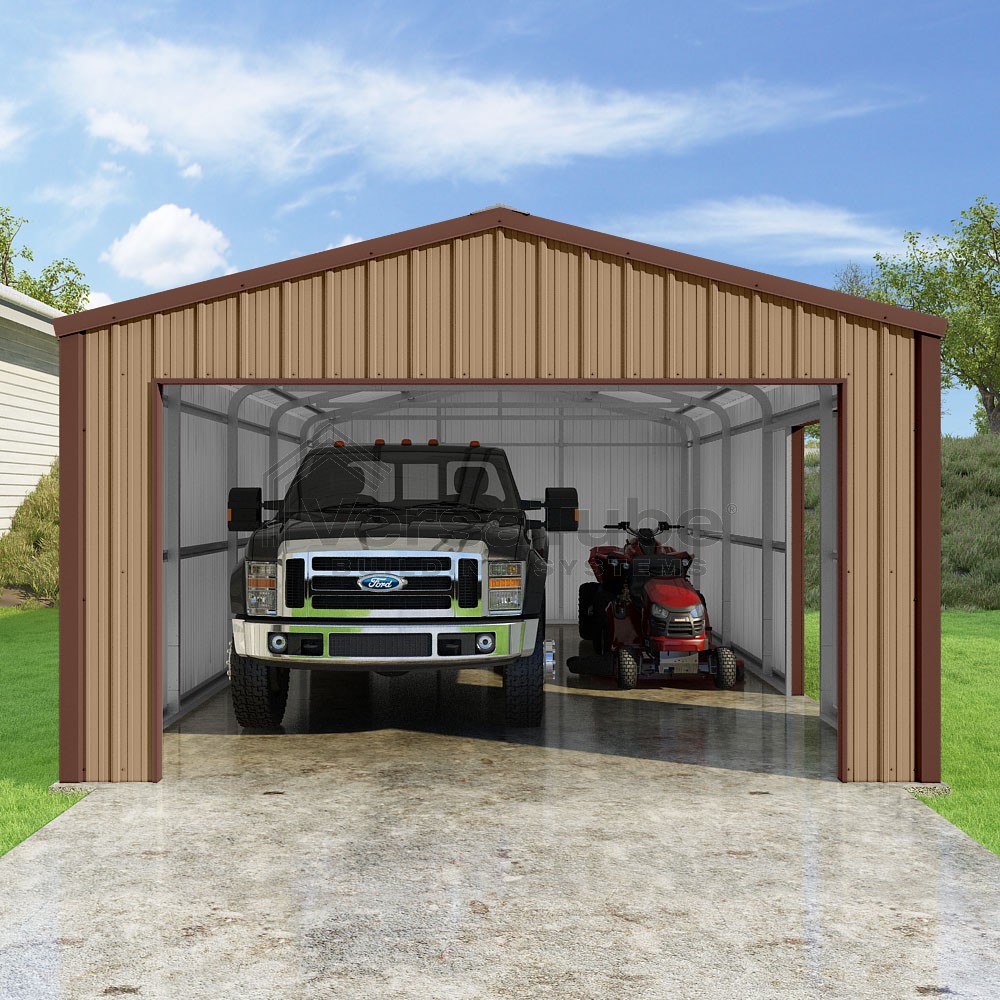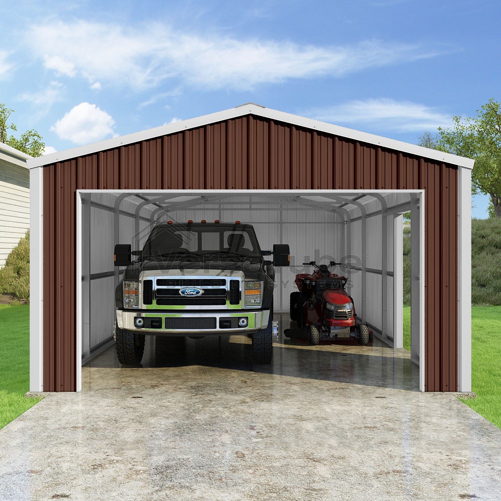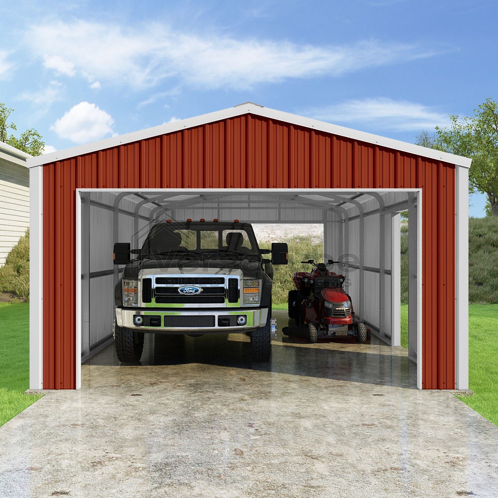Summit Series DIY garage kit features vertical sheet metal roof and siding panels for a consistent look.