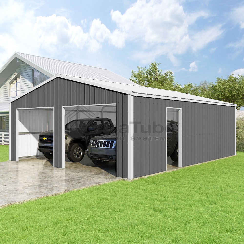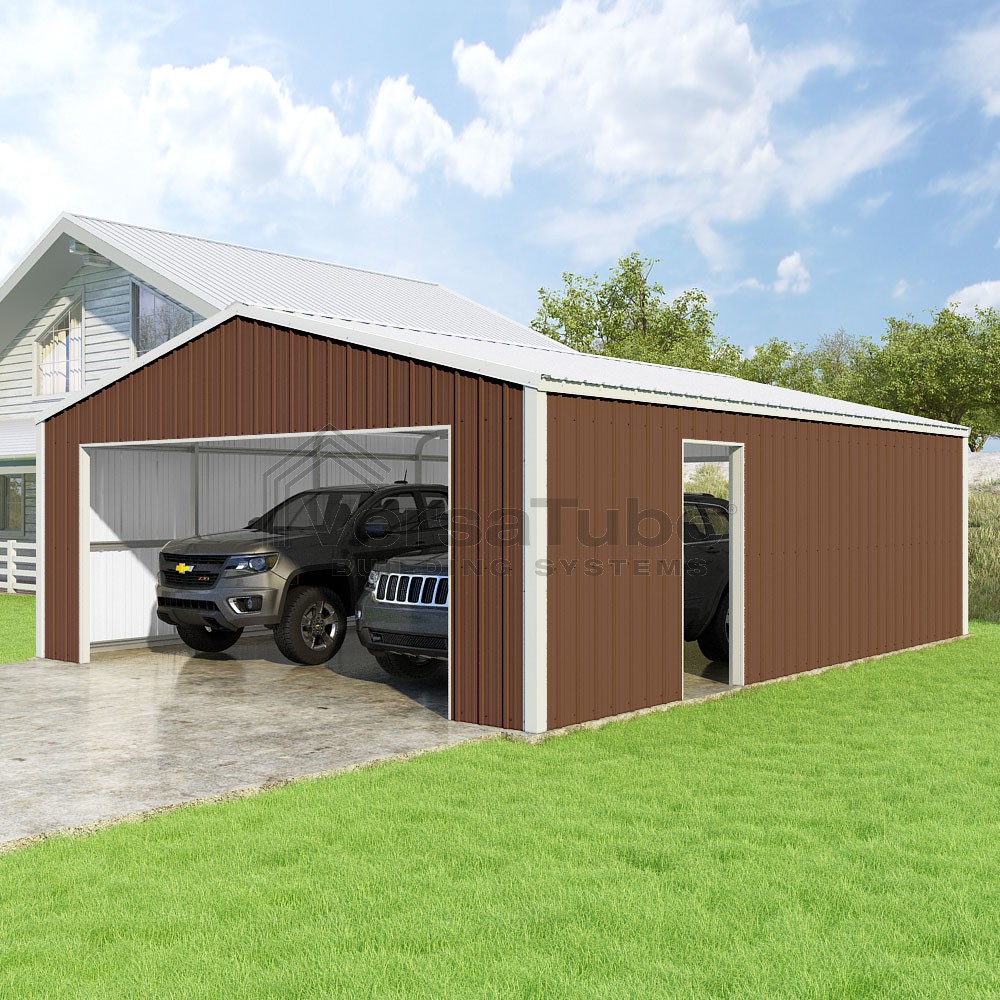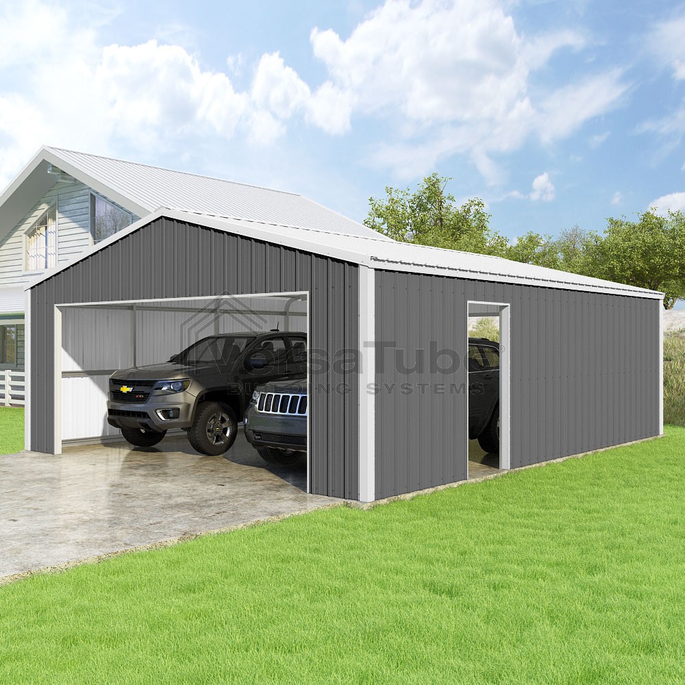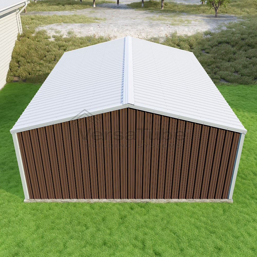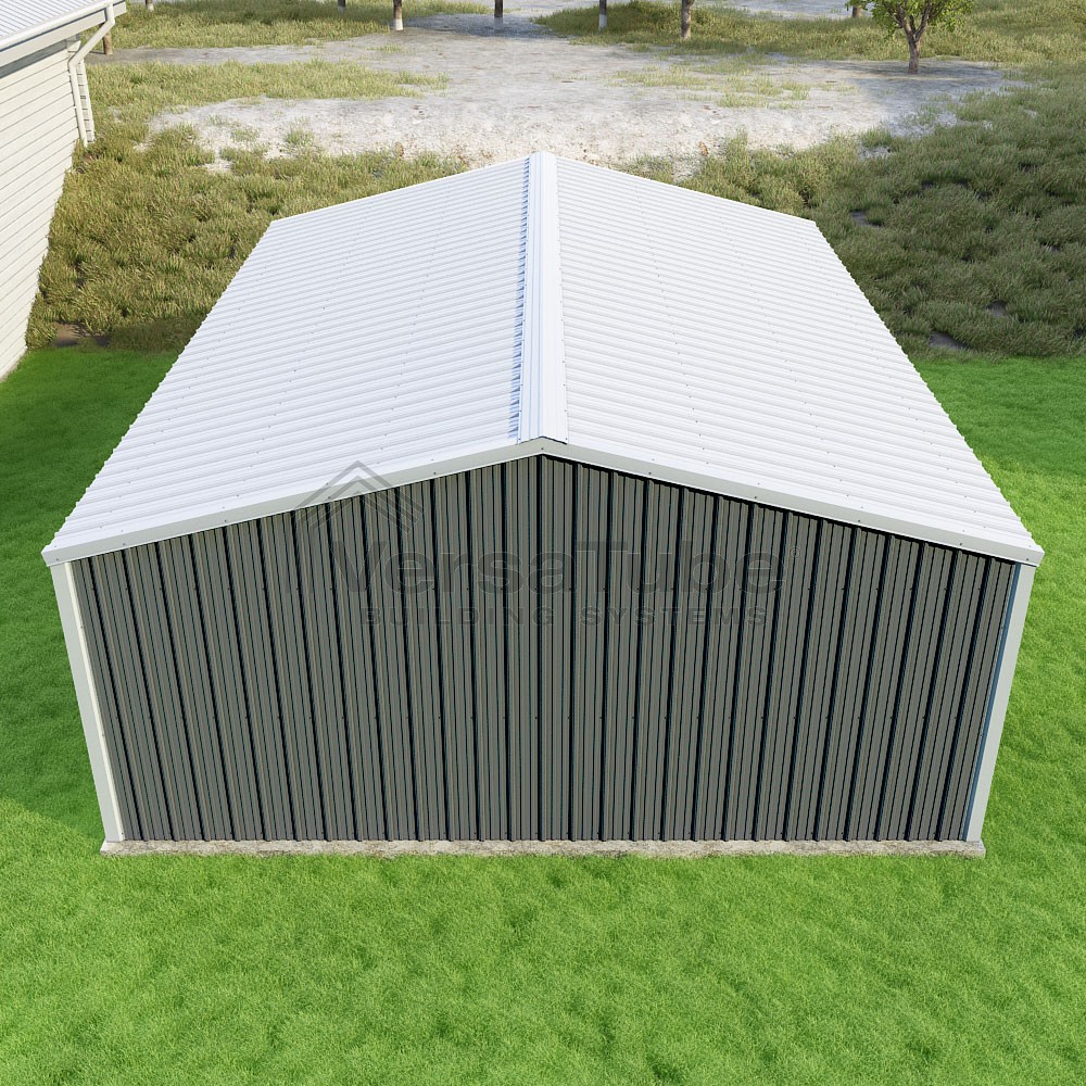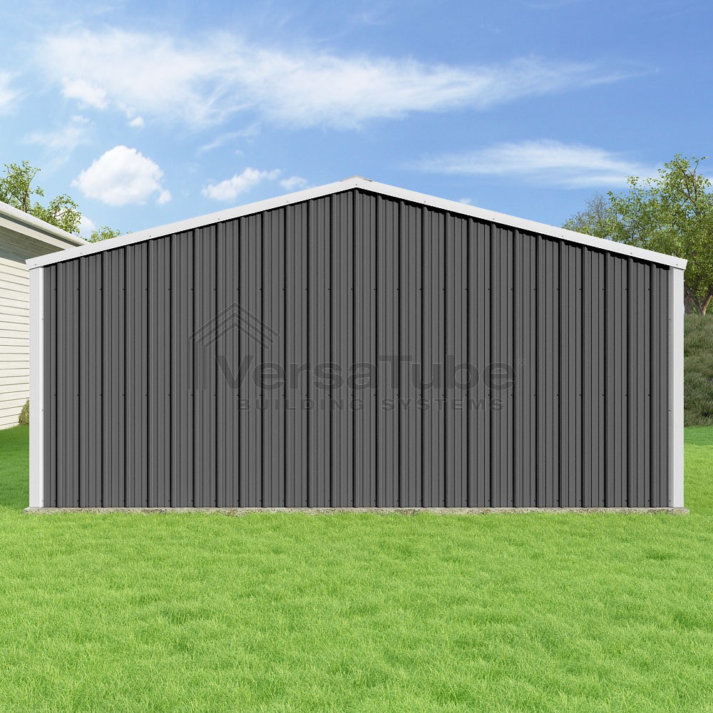Summit Series DIY garage kit features vertical sheet metal roof and siding panels for a consistent look.