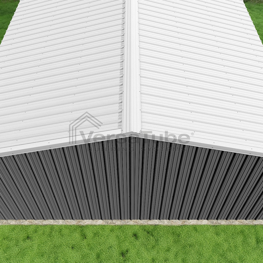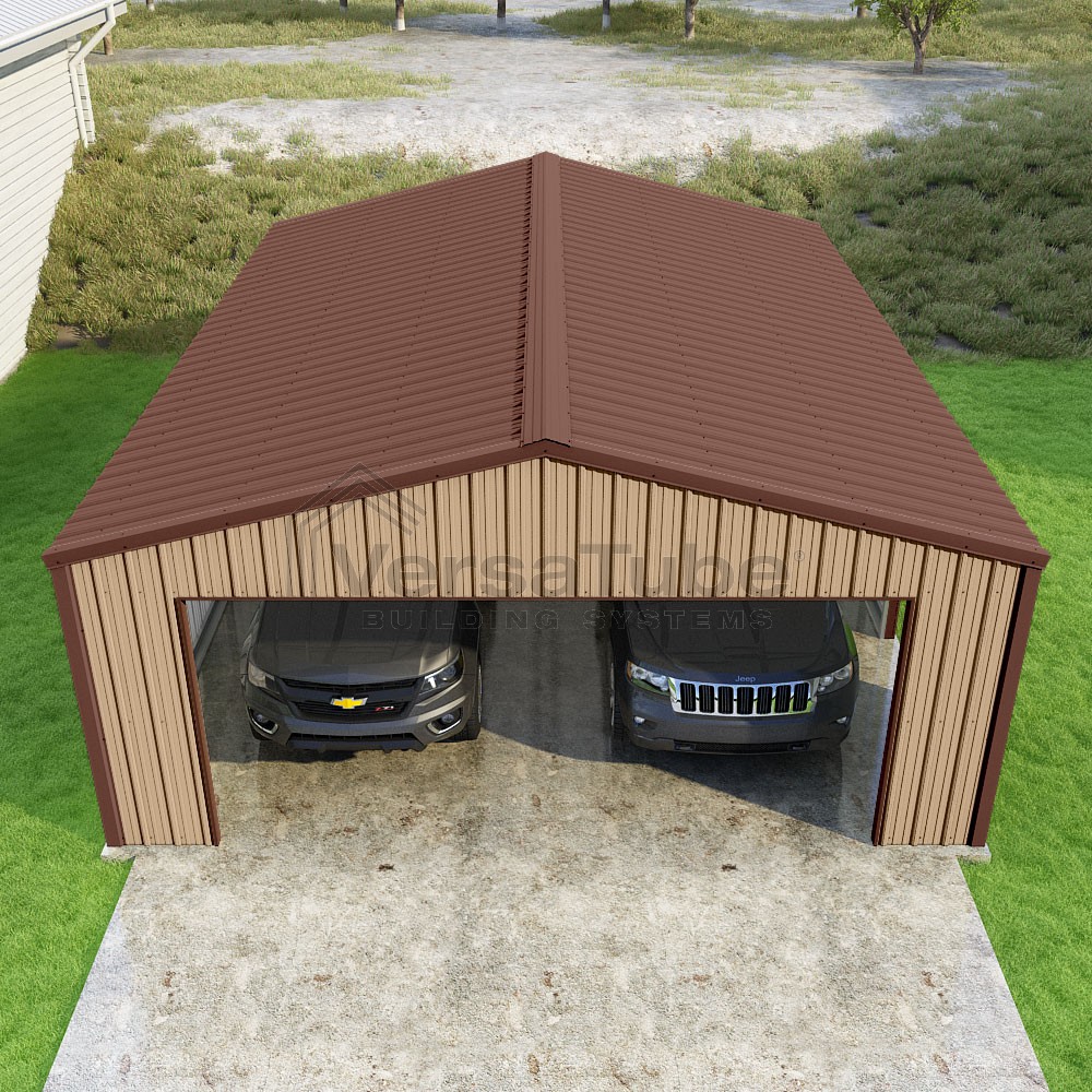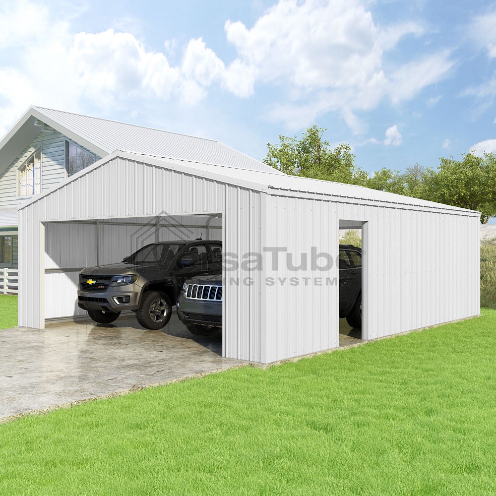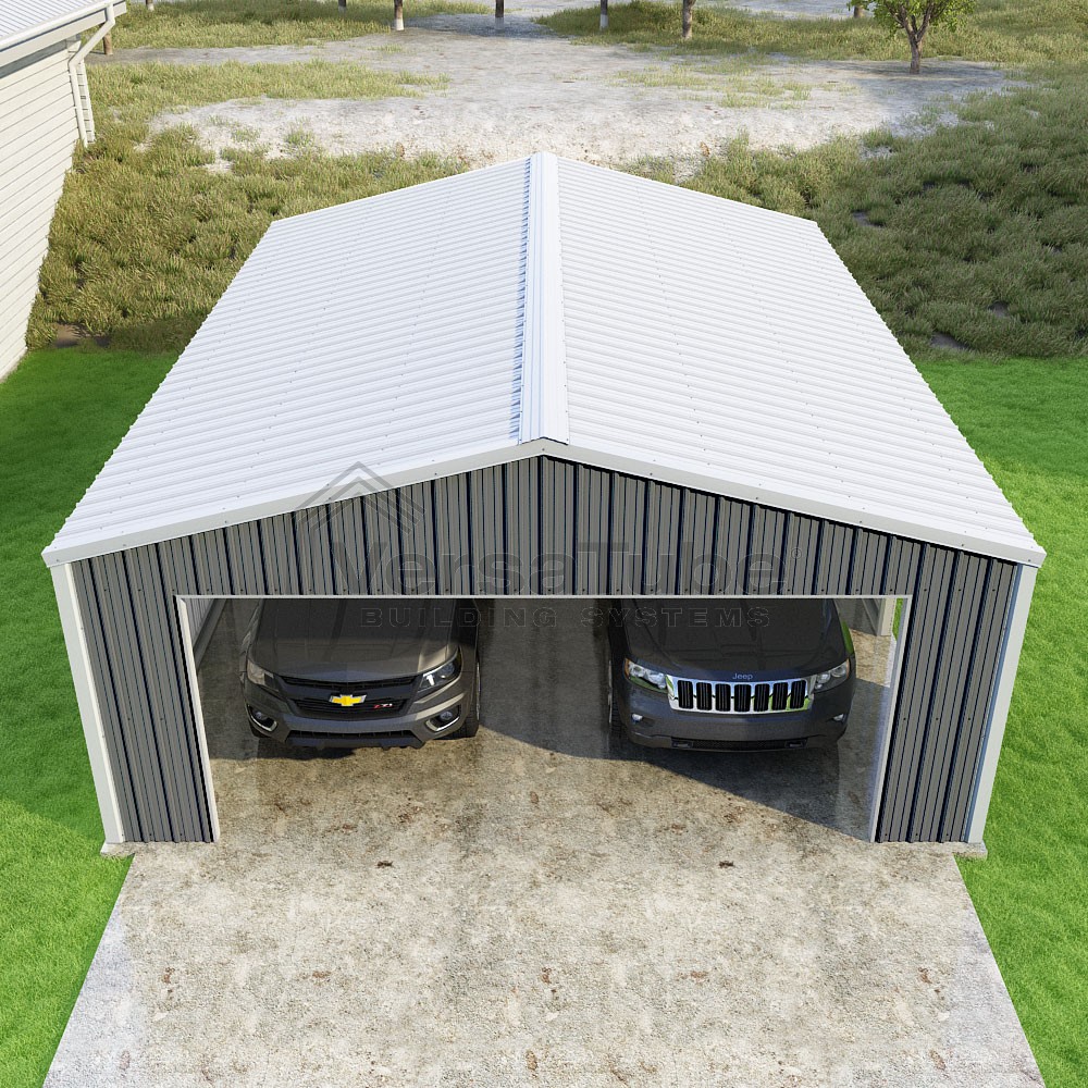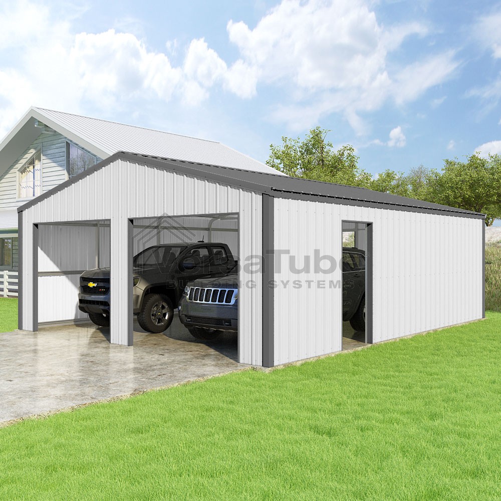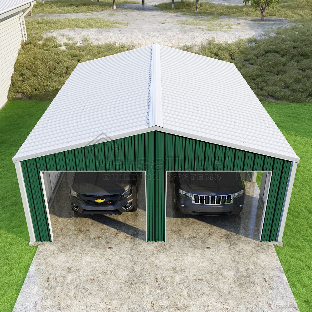 Summit Series DIY garage kit features vertical sheet metal roof and siding panels for a consistent look.