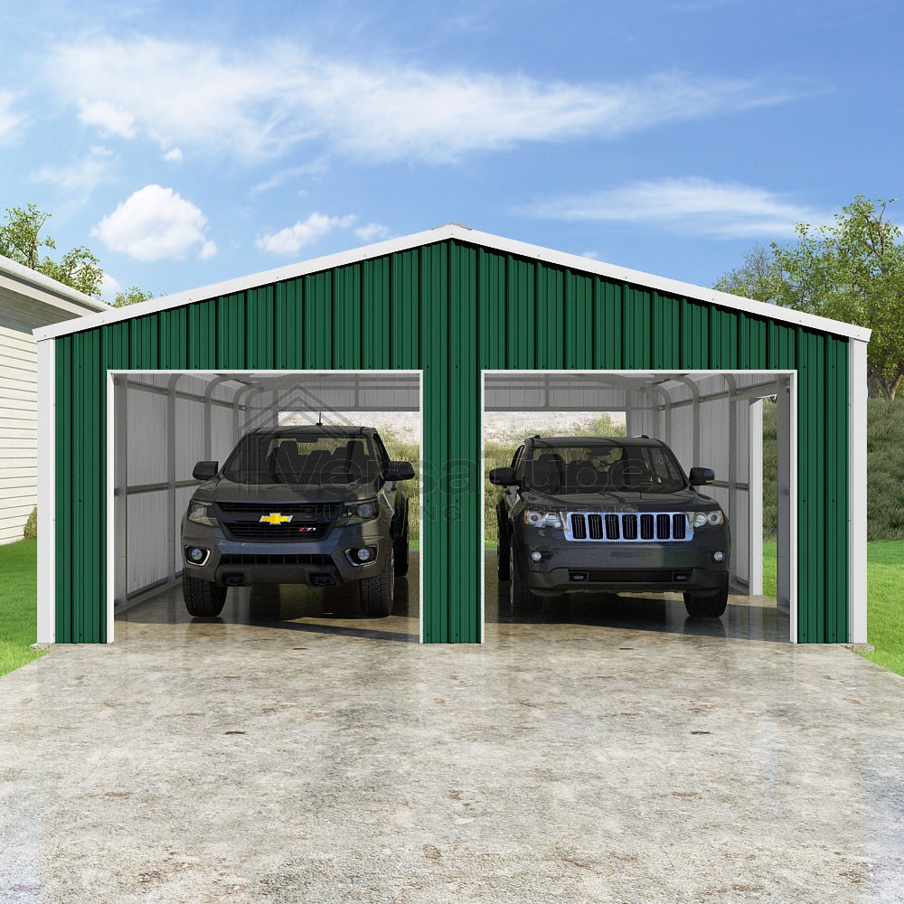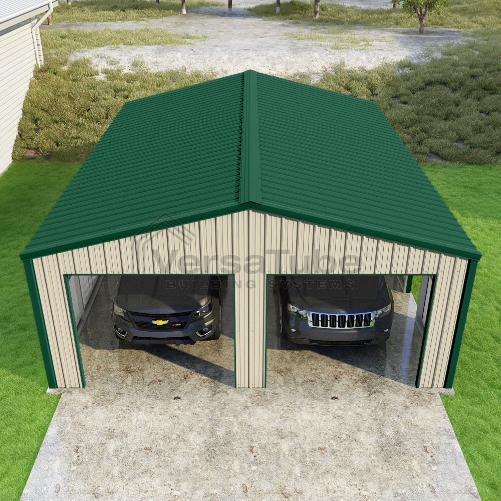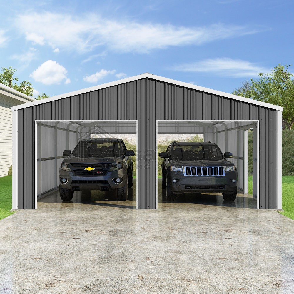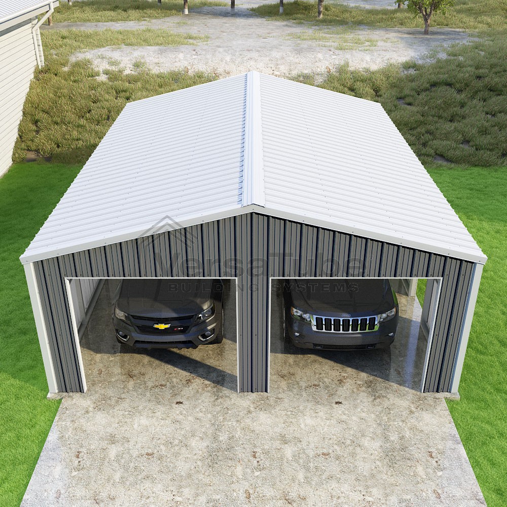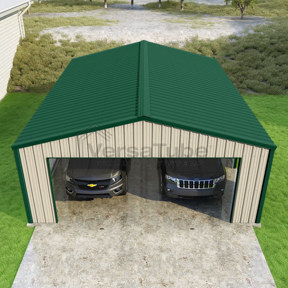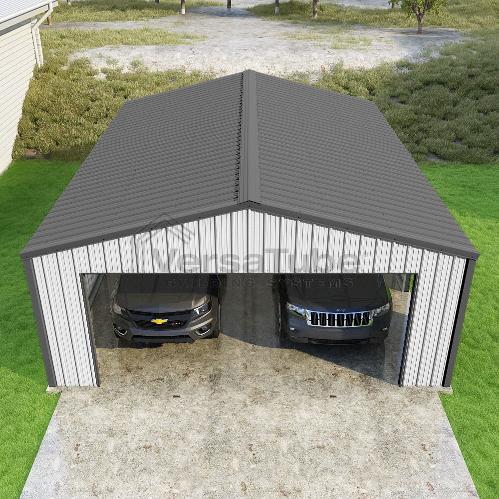 Summit Series DIY garage kit features vertical sheet metal roof and siding panels for a consistent look.