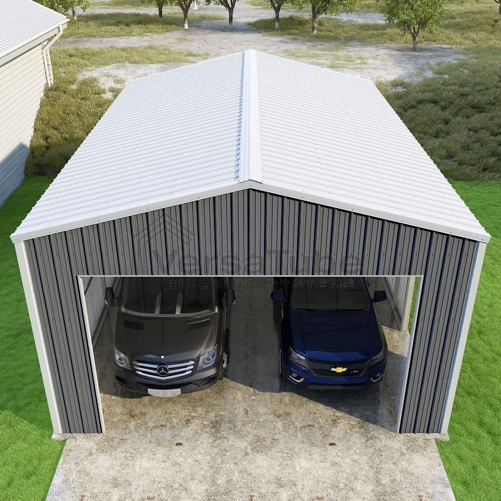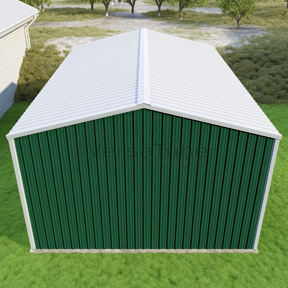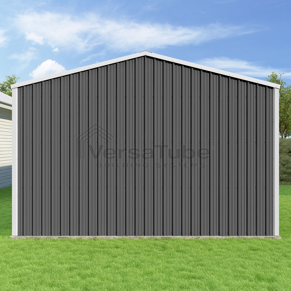 Summit Series DIY garage kit features vertical sheet metal roof and siding panels for a consistent look.
