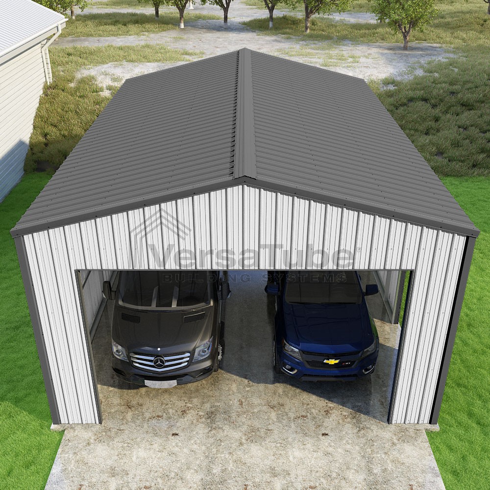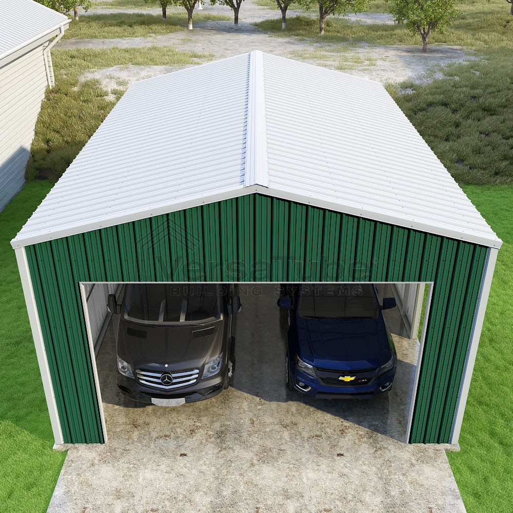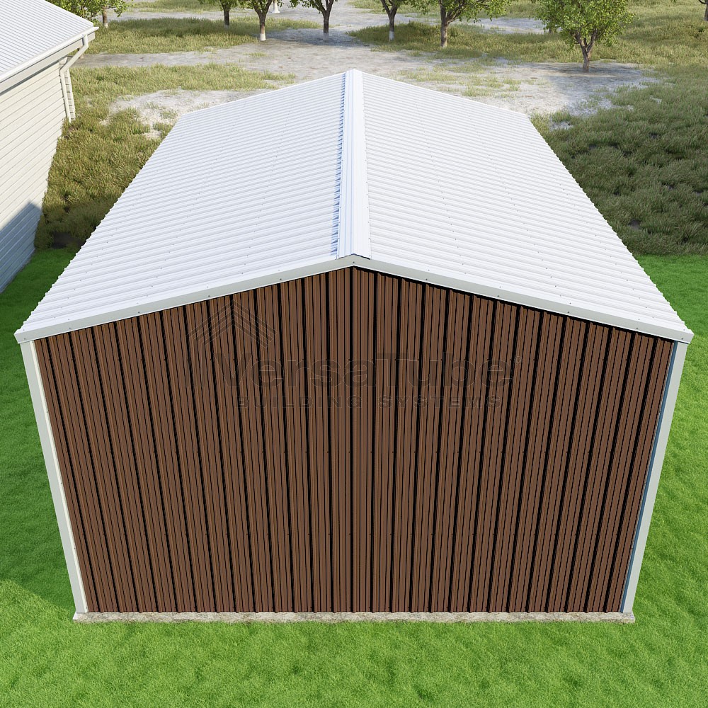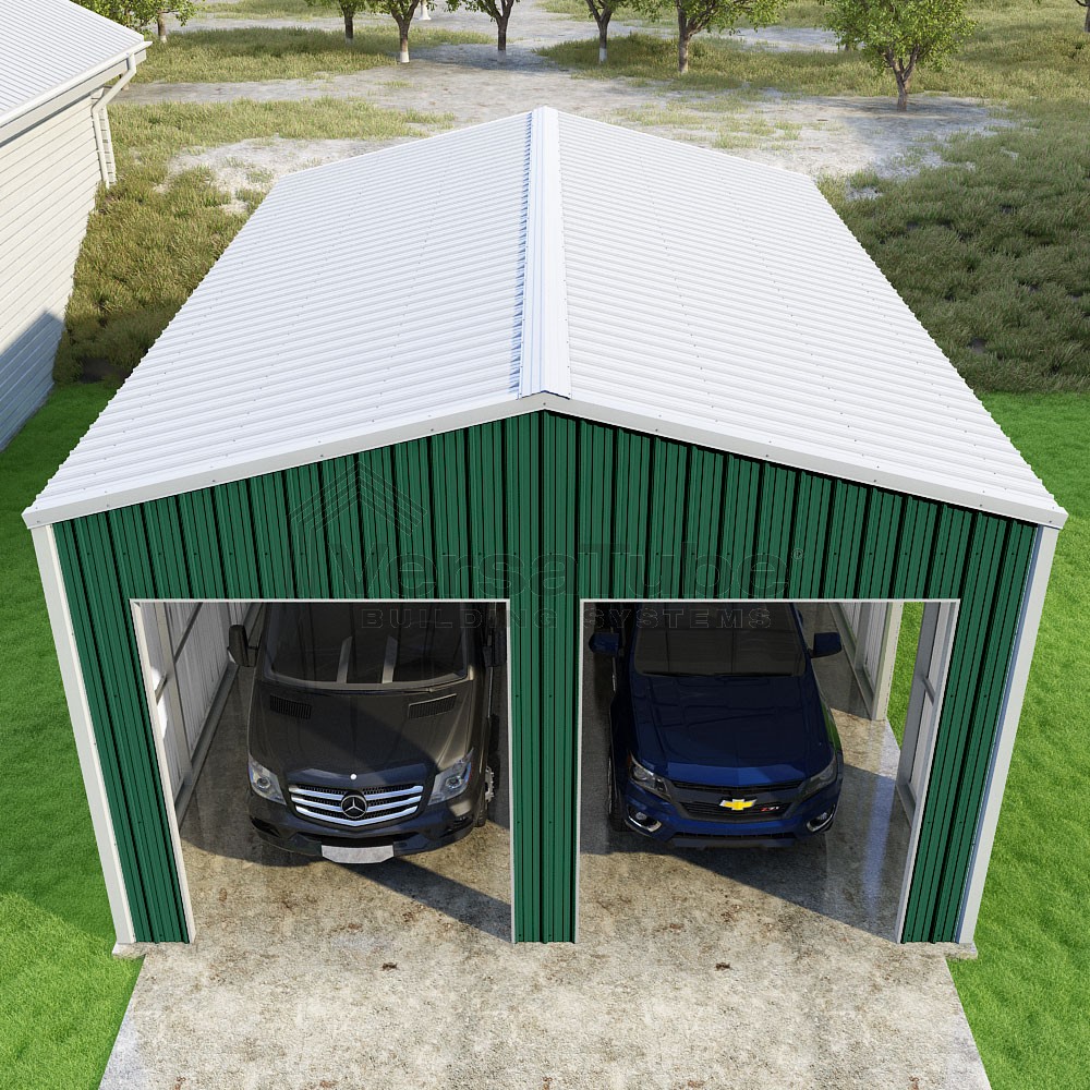 Summit Series DIY garage kit features vertical sheet metal roof and siding panels for a consistent look.