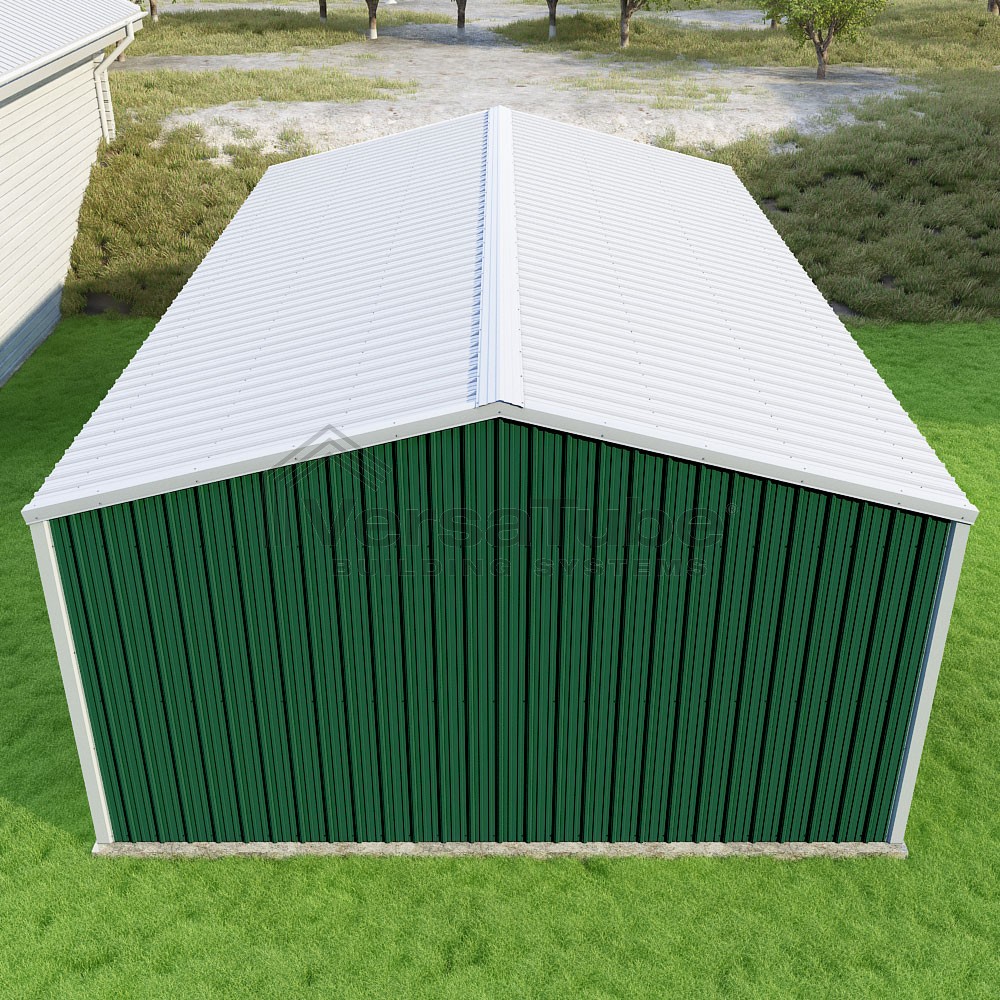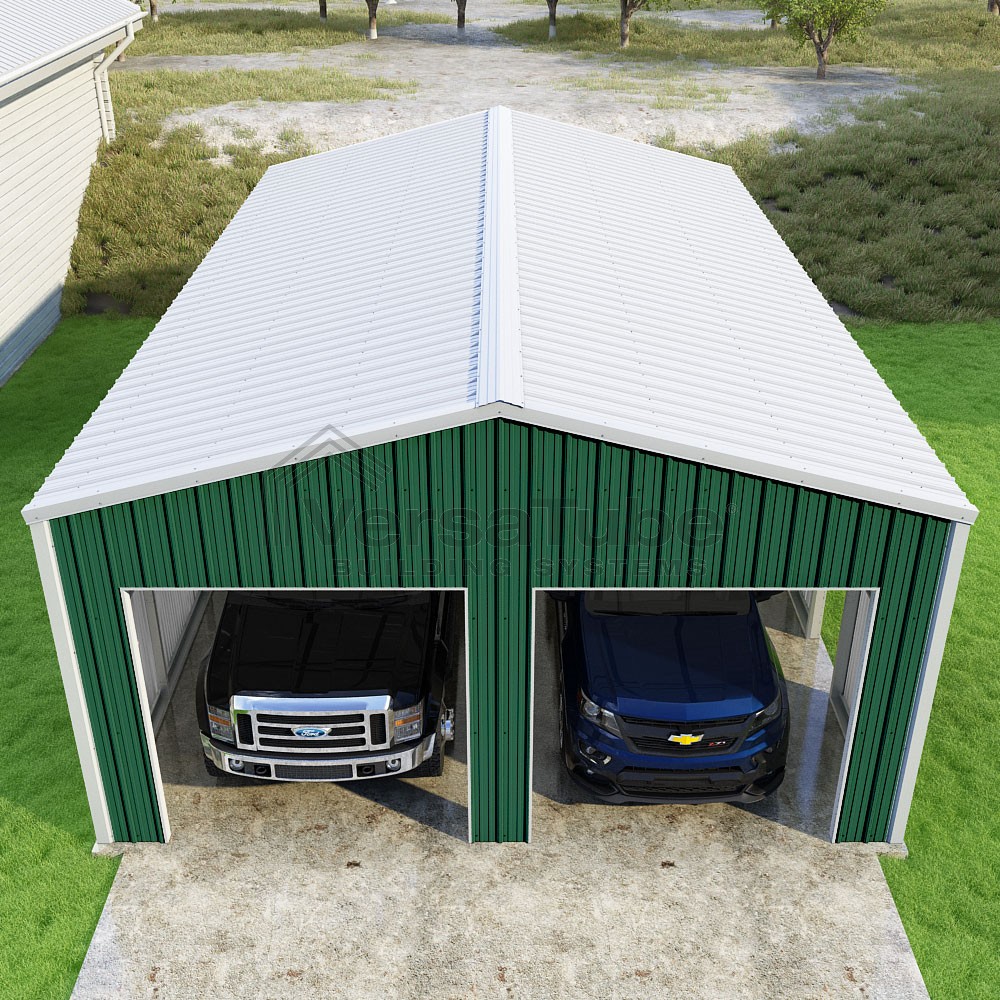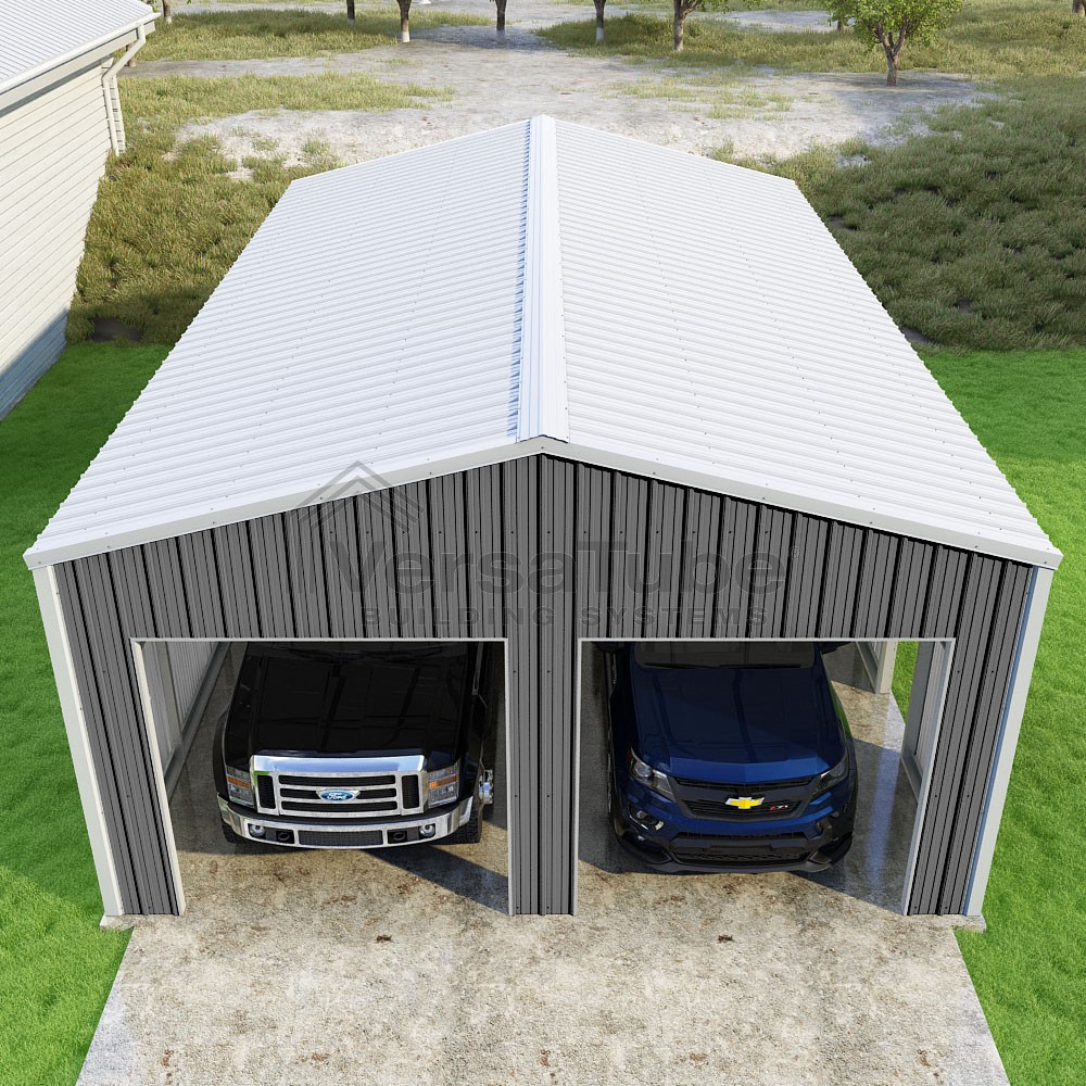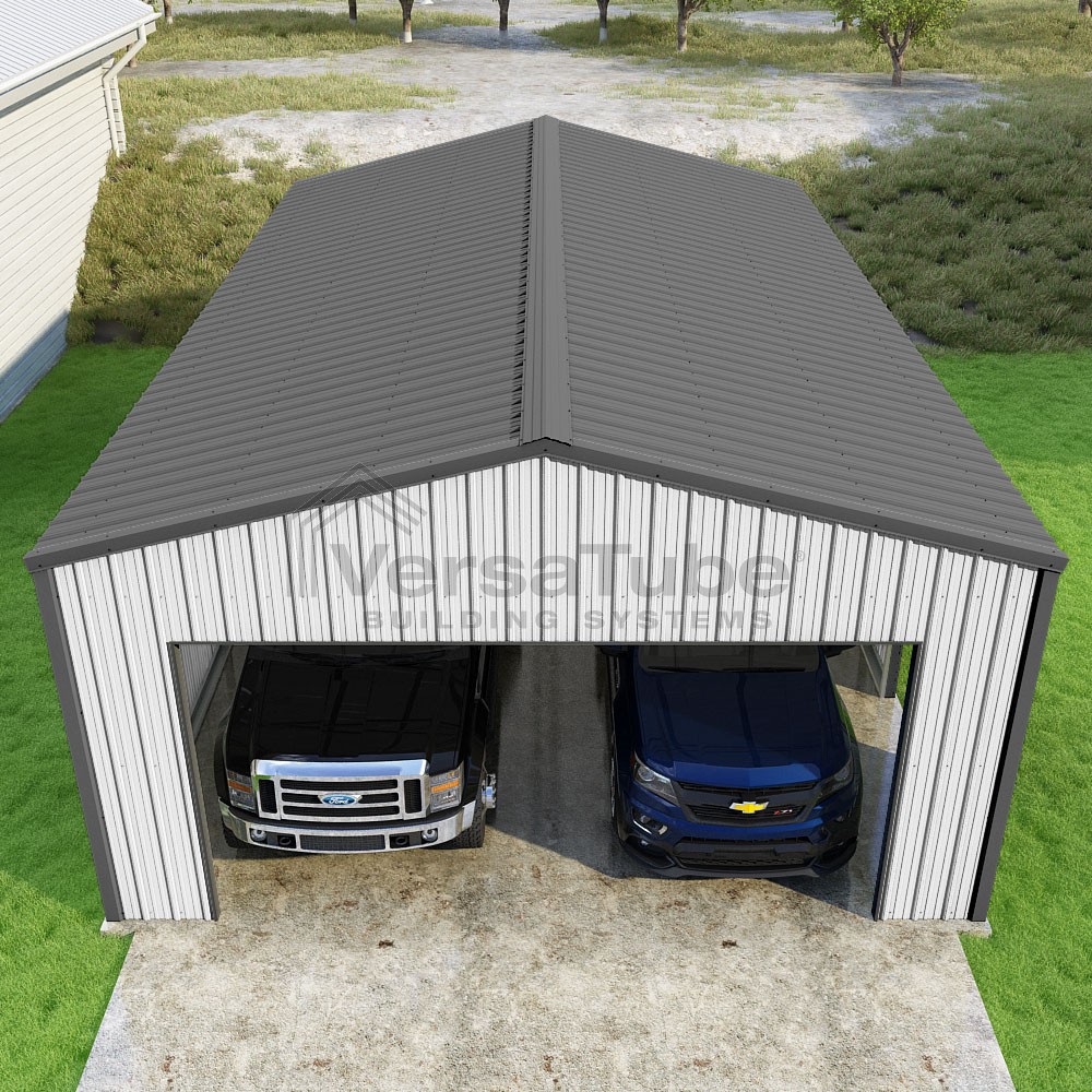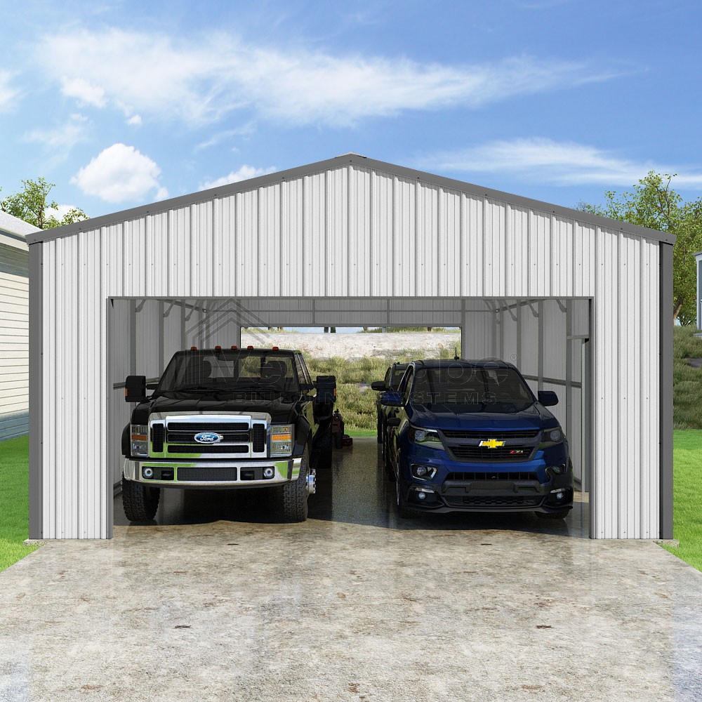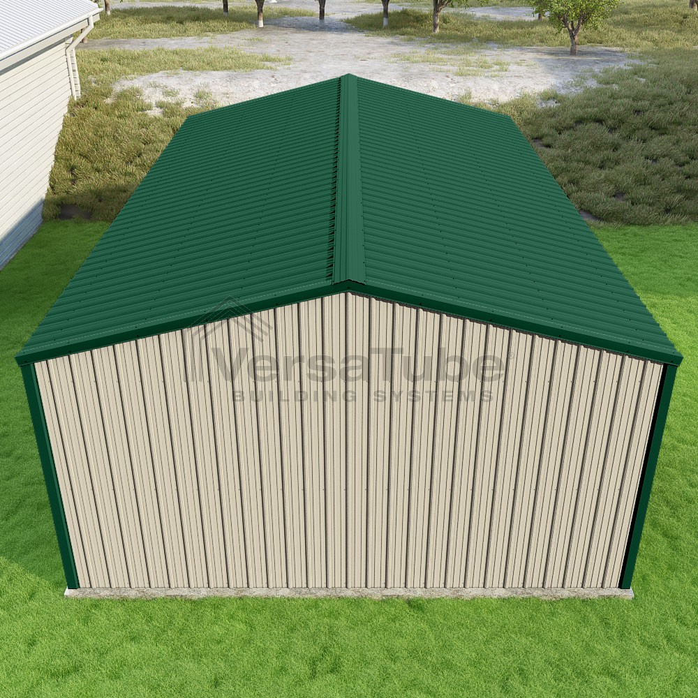 Summit Series DIY garage kit features vertical sheet metal roof and siding panels for a consistent look.