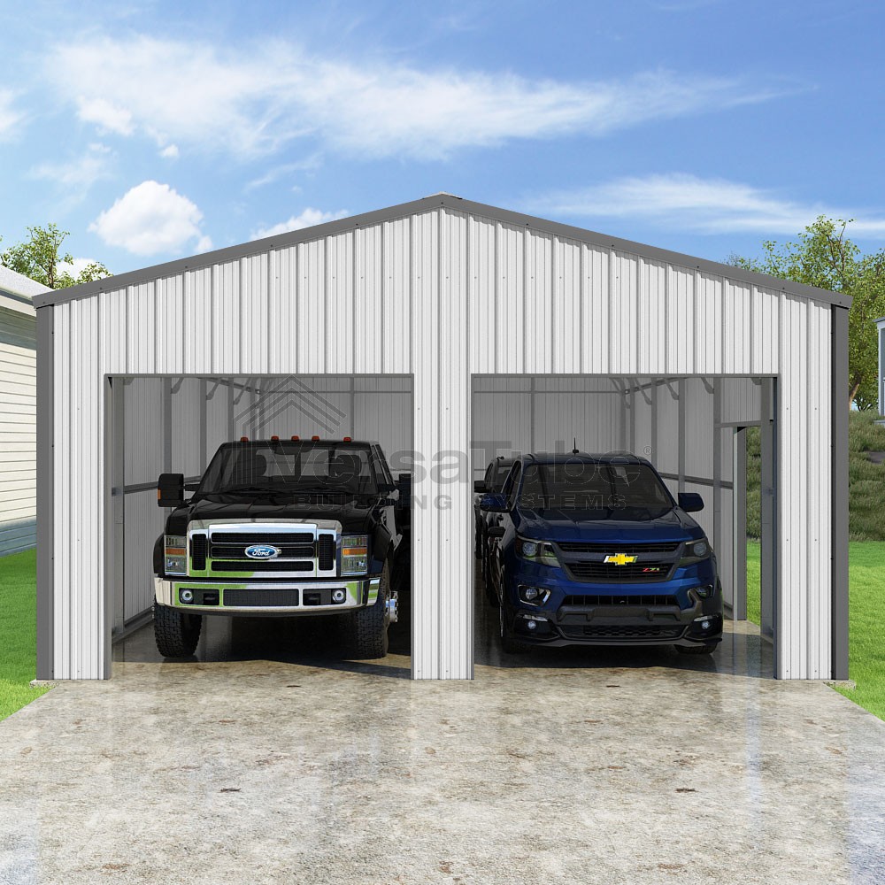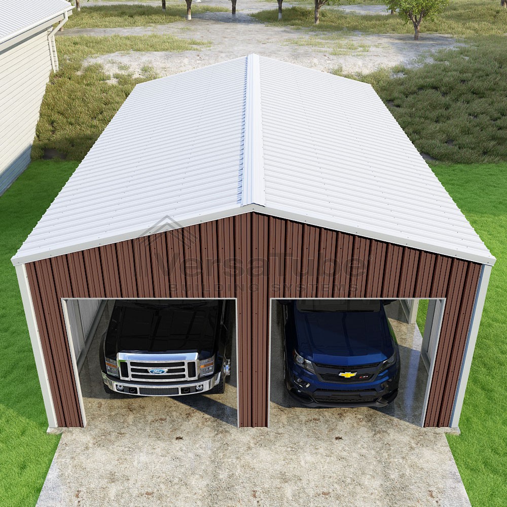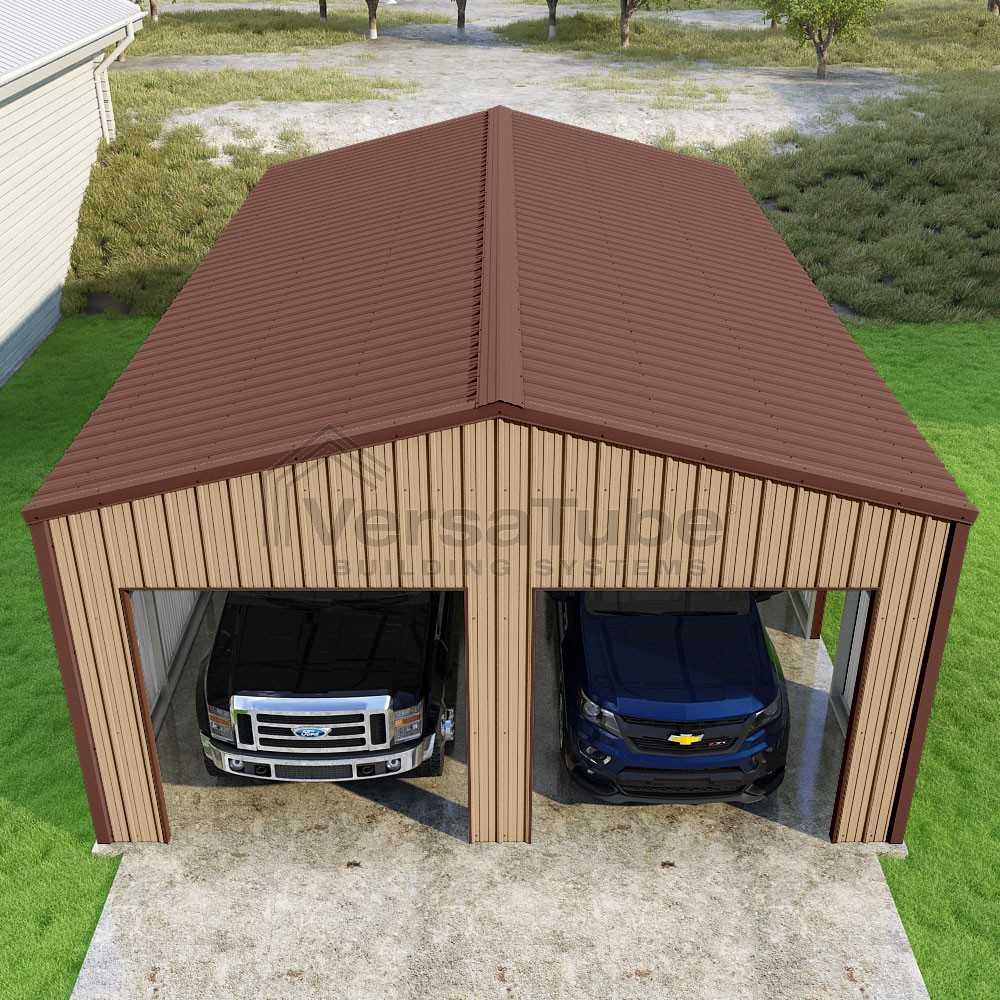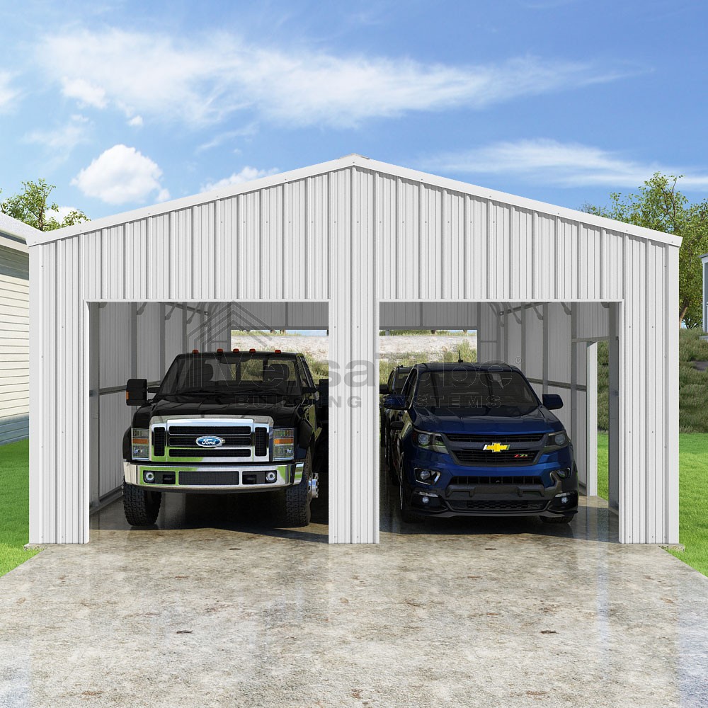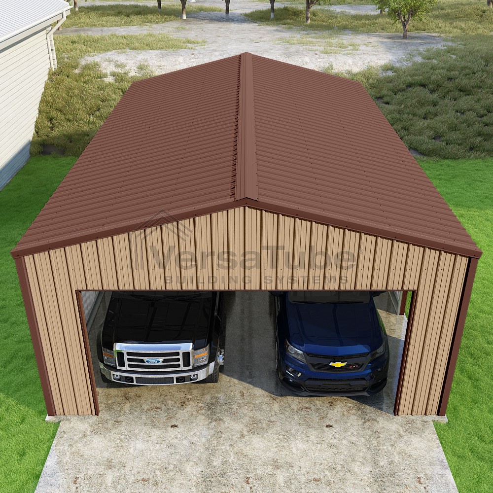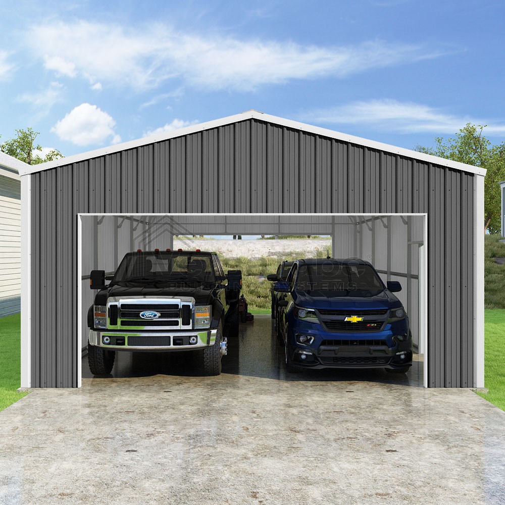 Summit Series DIY garage kit features vertical sheet metal roof and siding panels for a consistent look.