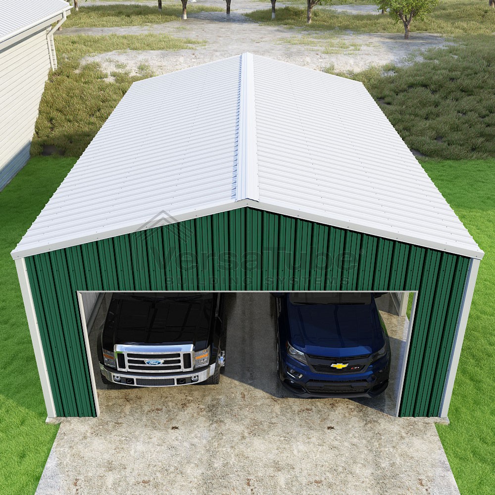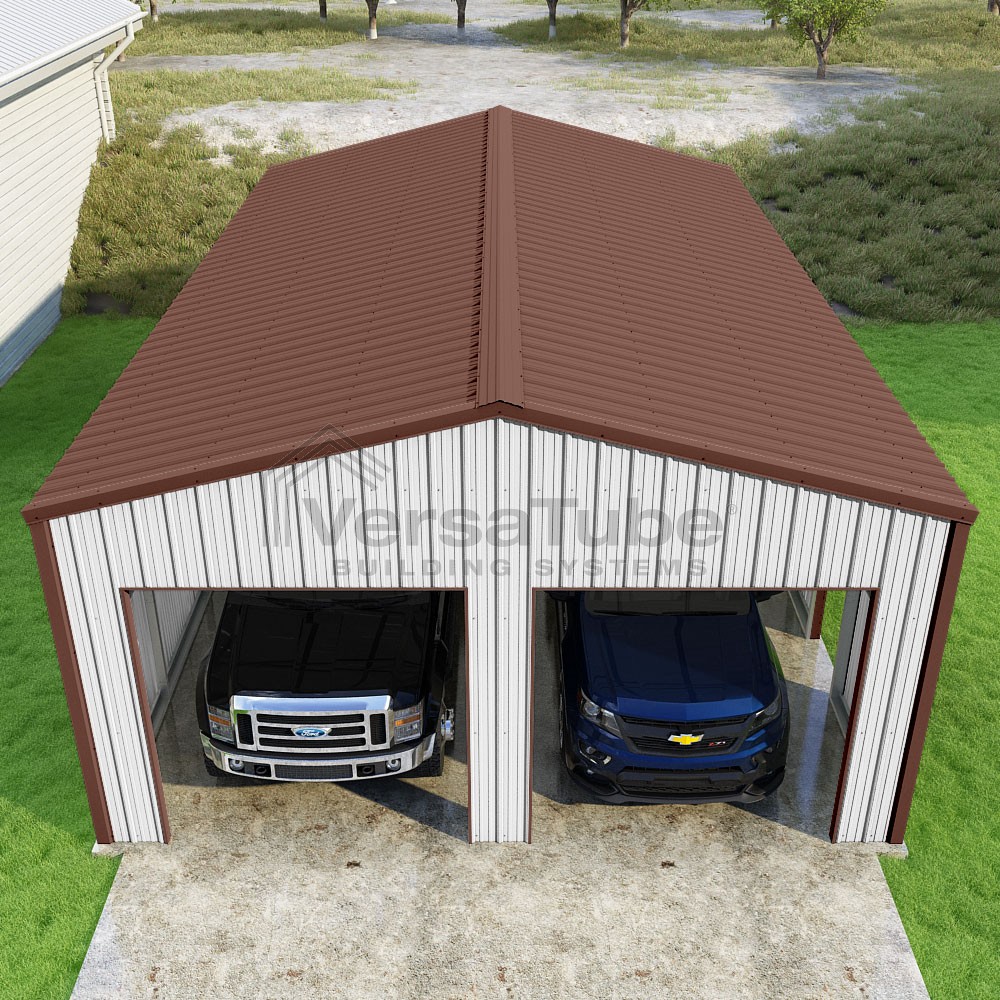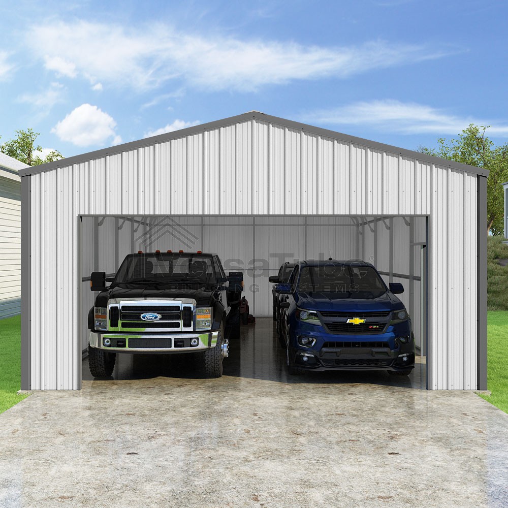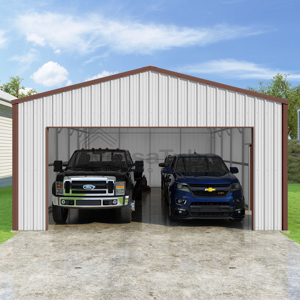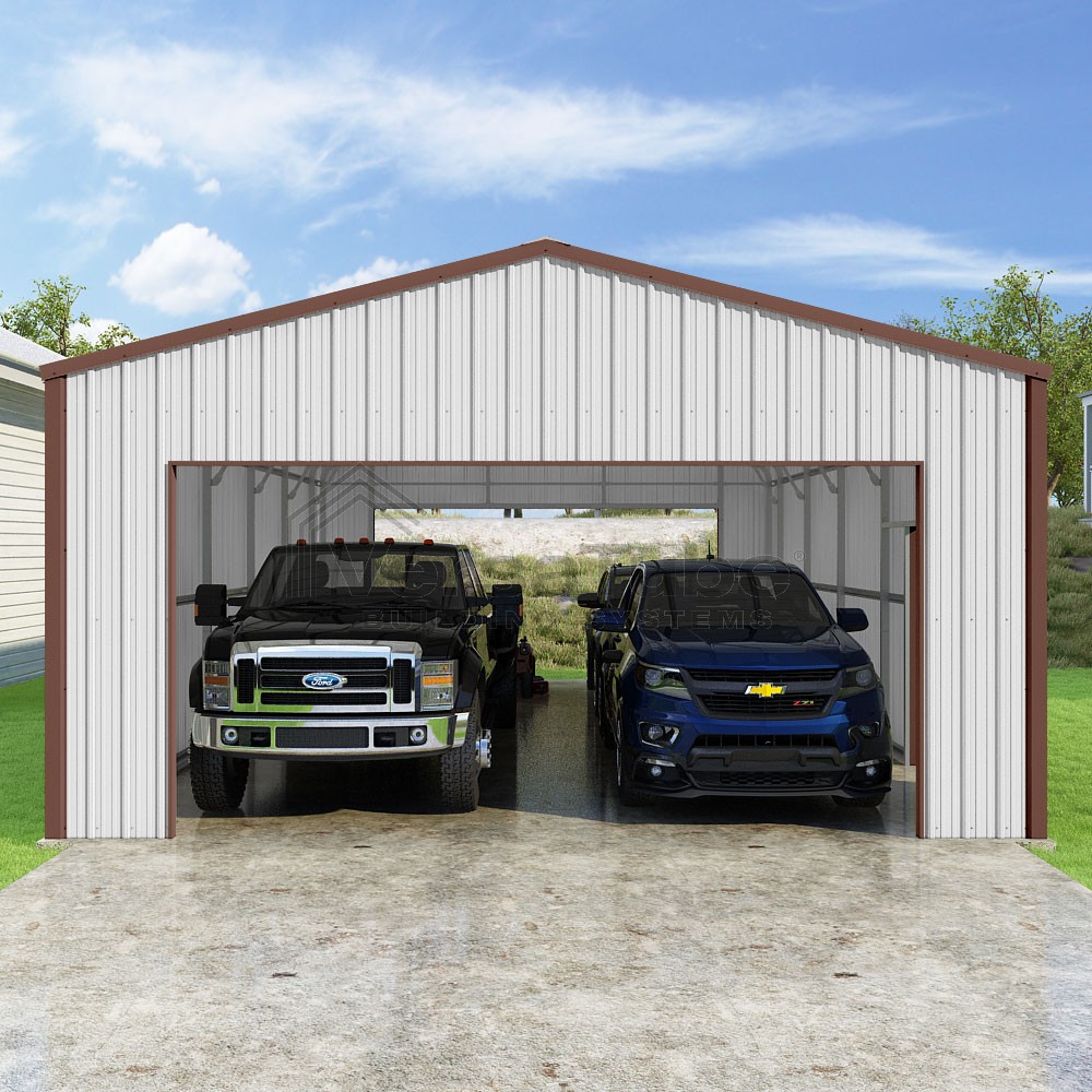 Summit Series DIY garage kit features vertical sheet metal roof and siding panels for a consistent look.