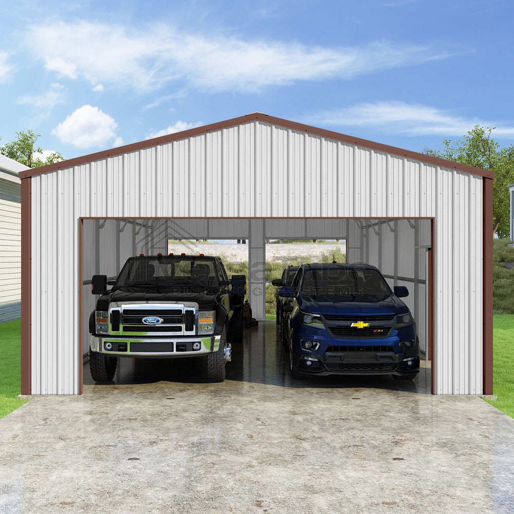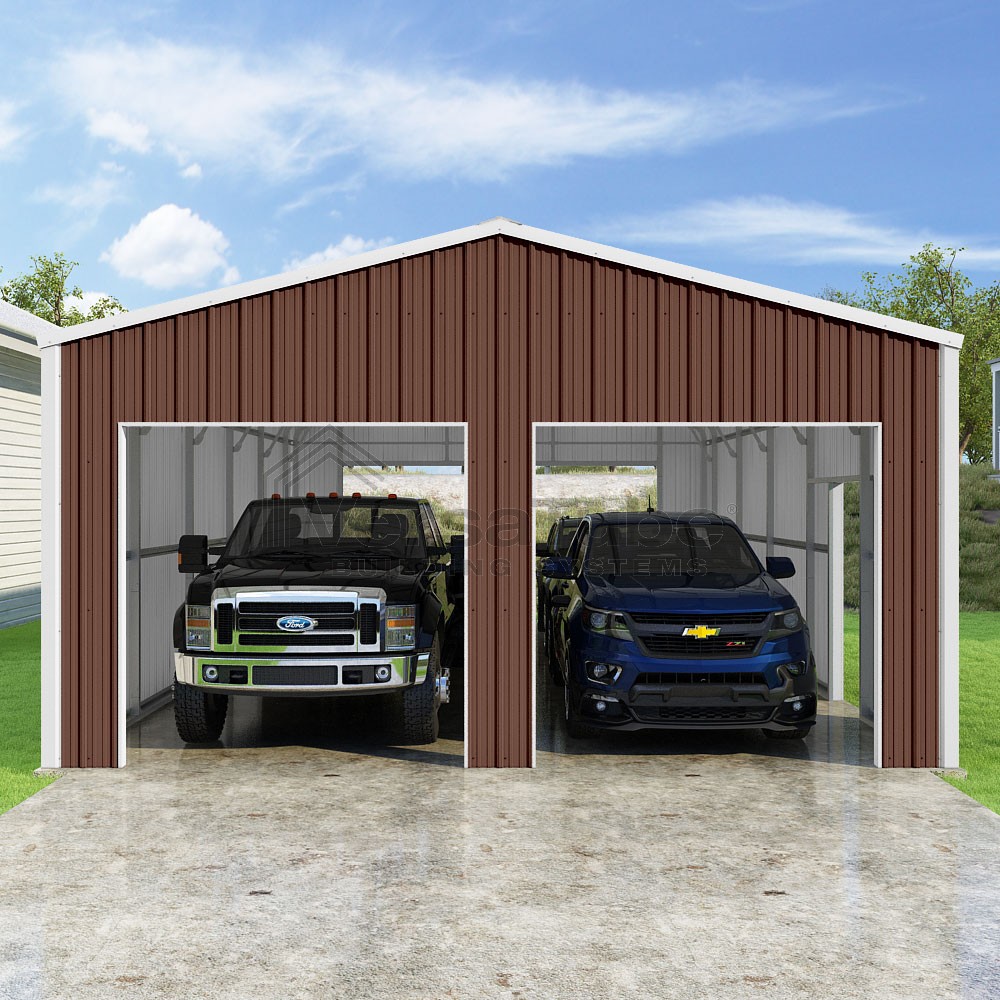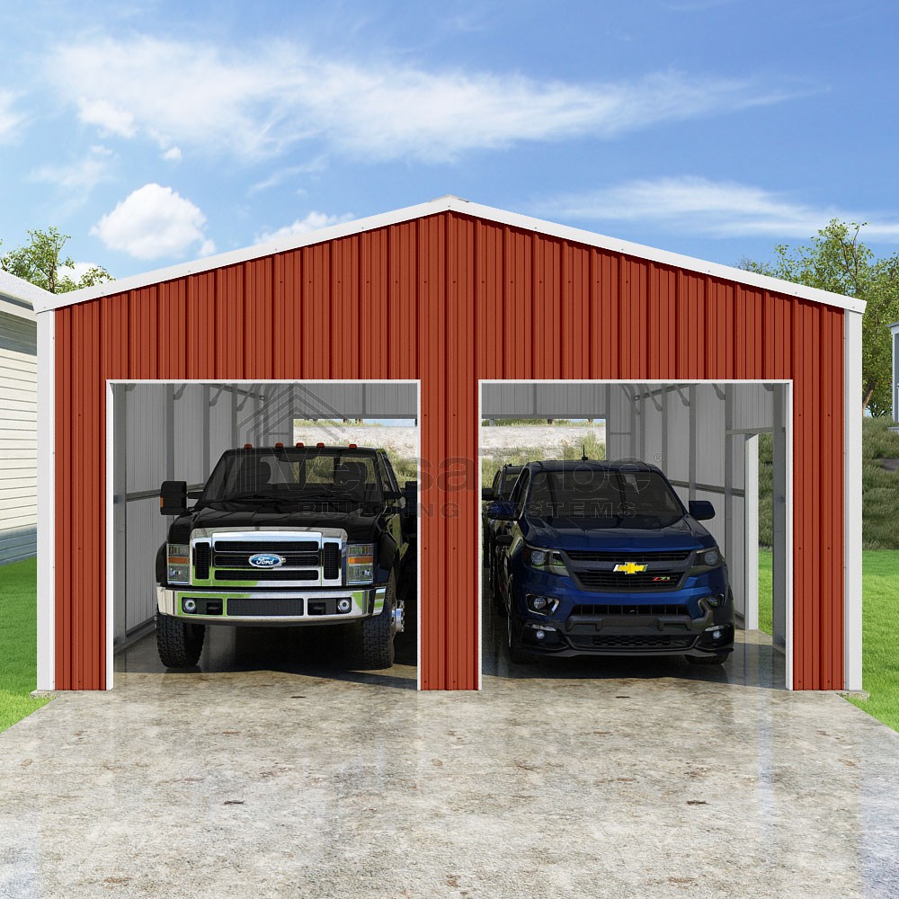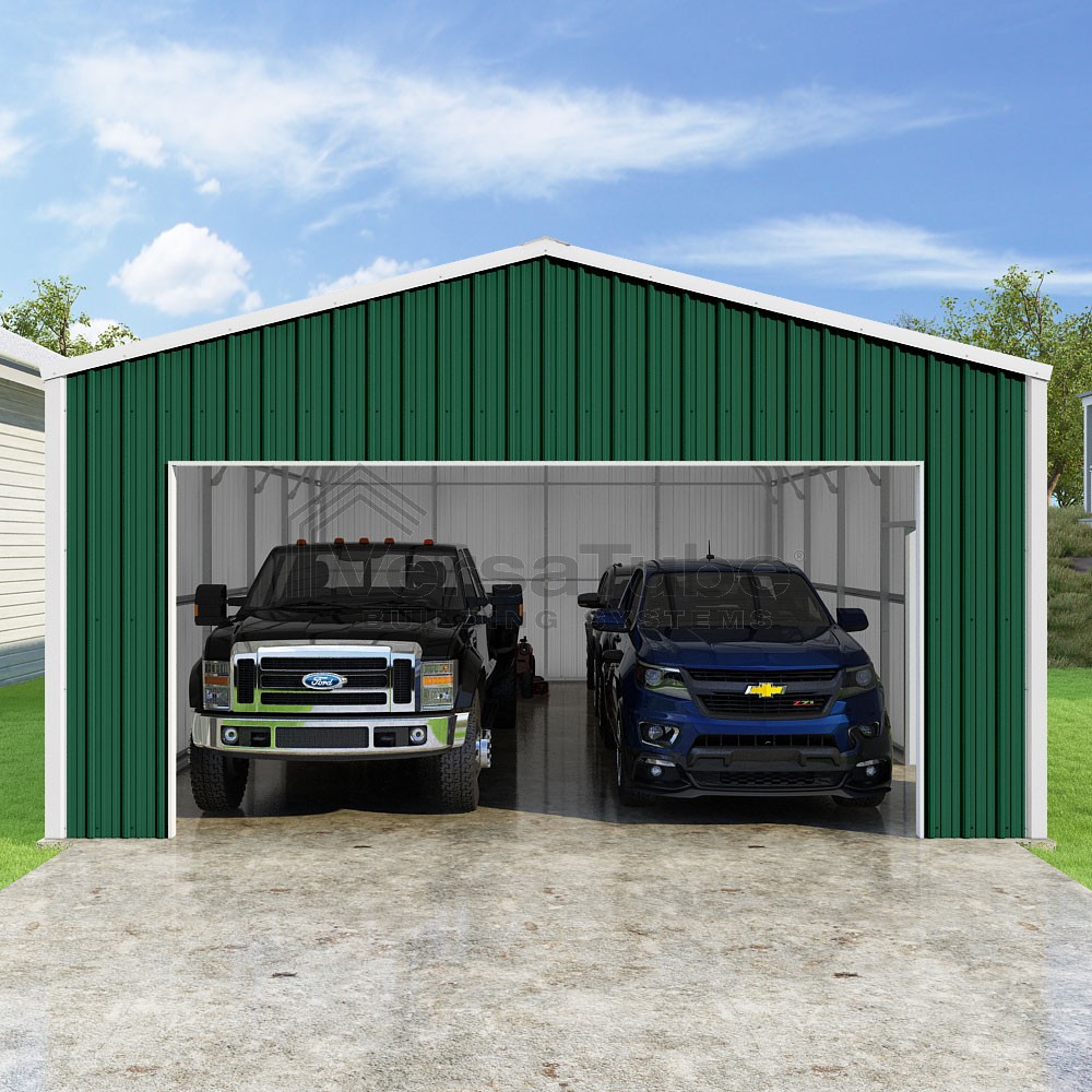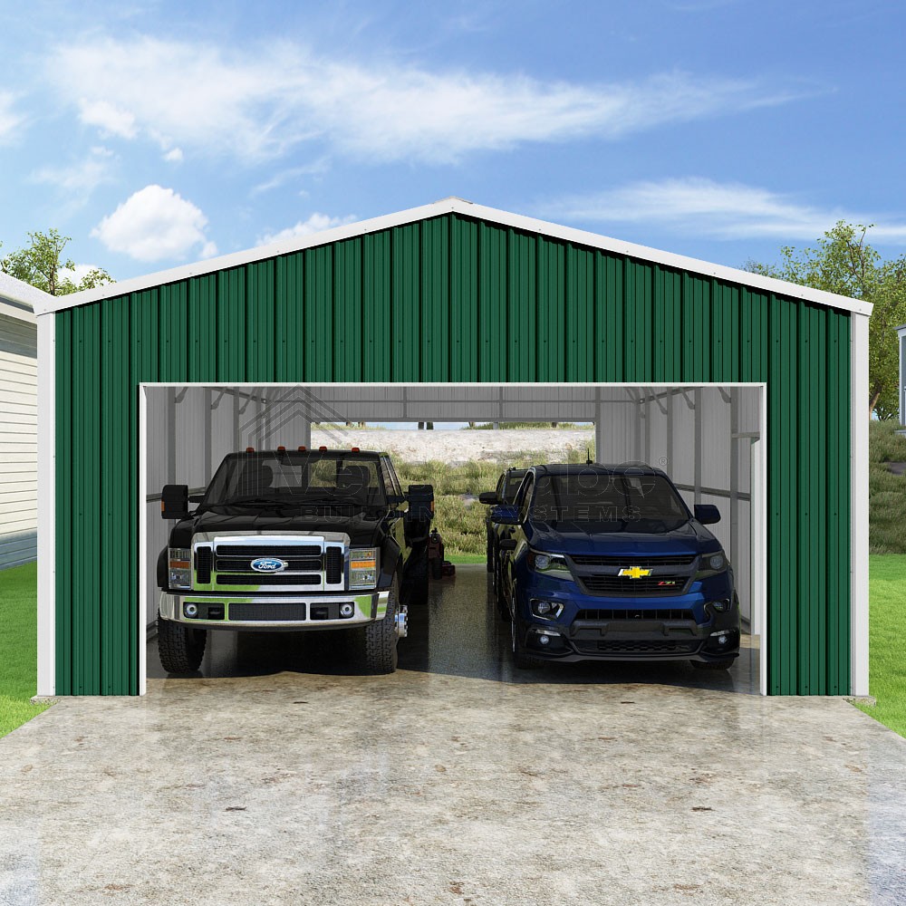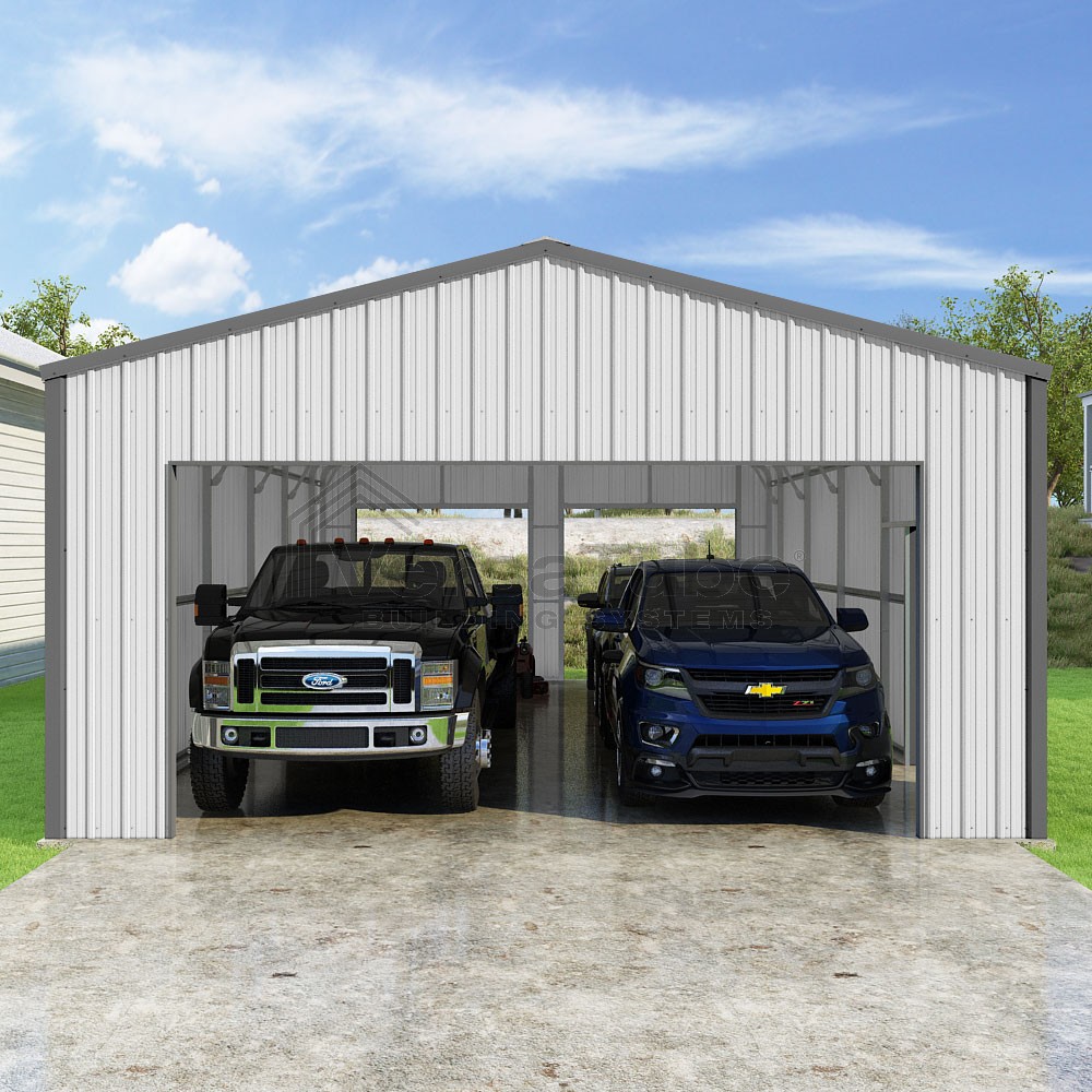 Summit Series DIY garage kit features vertical sheet metal roof and siding panels for a consistent look.