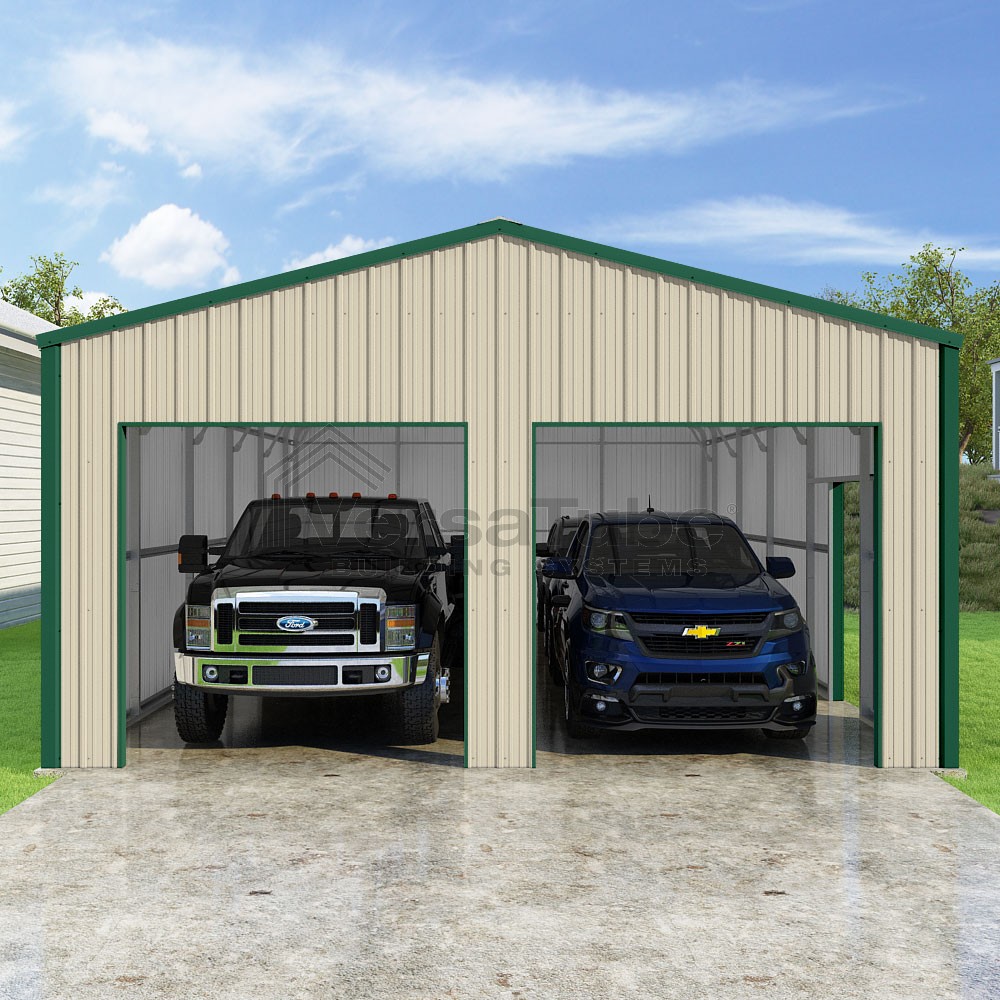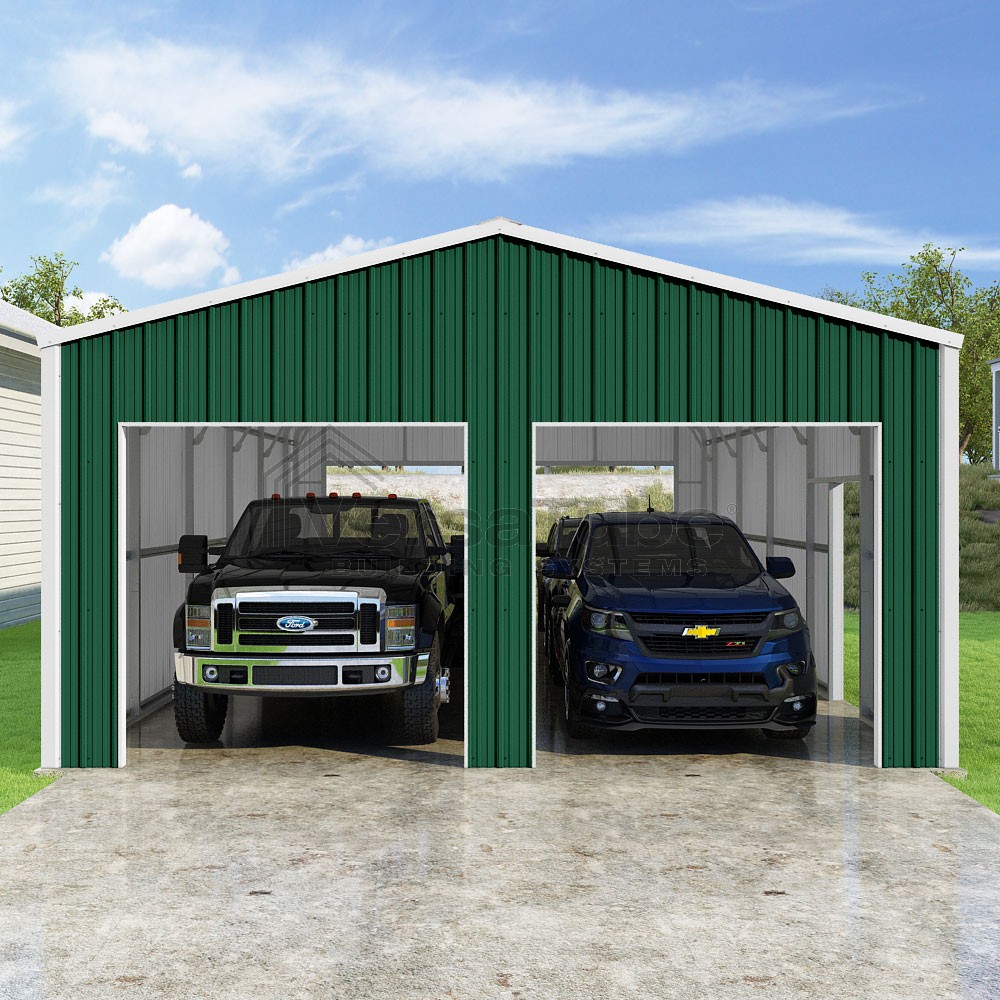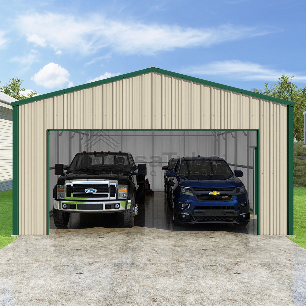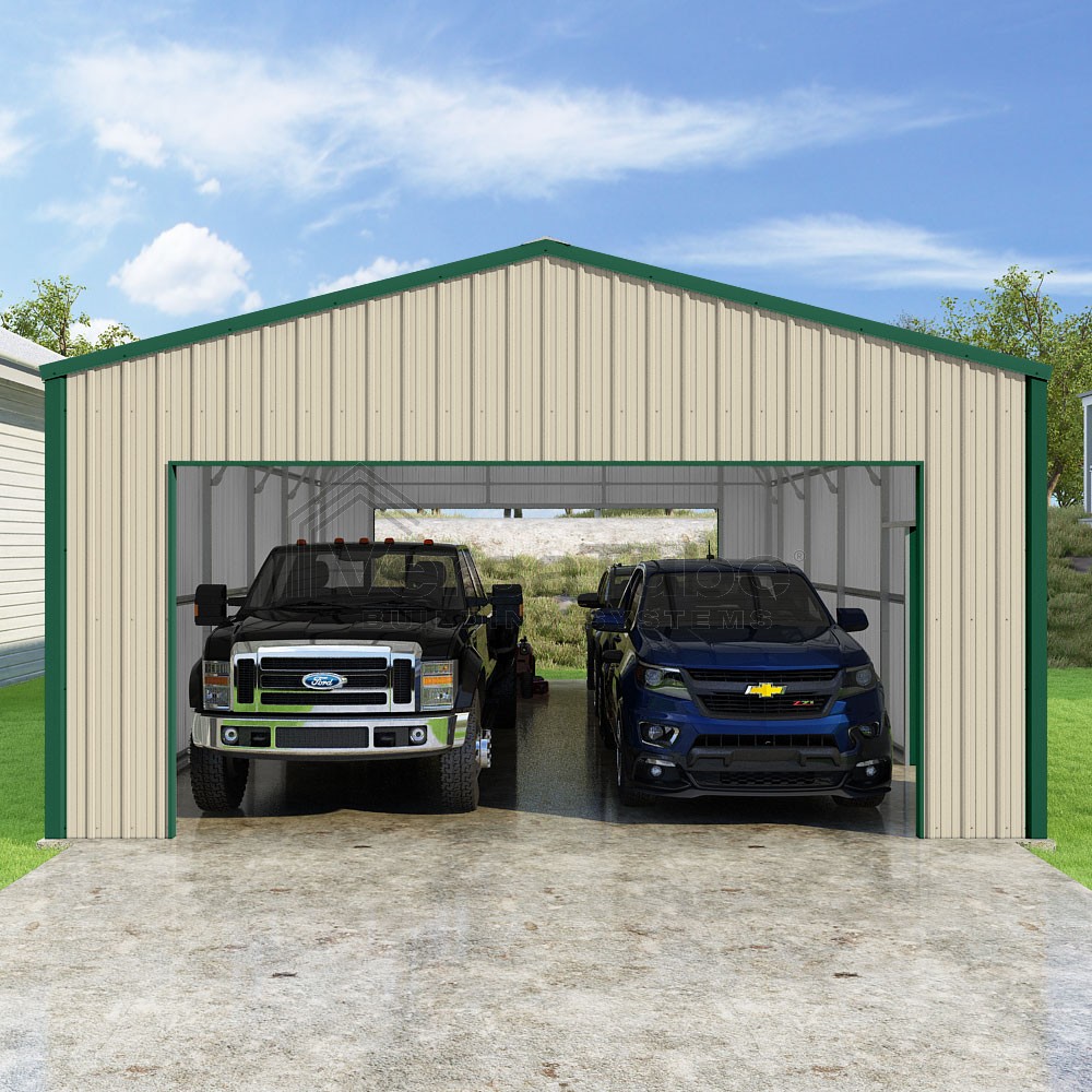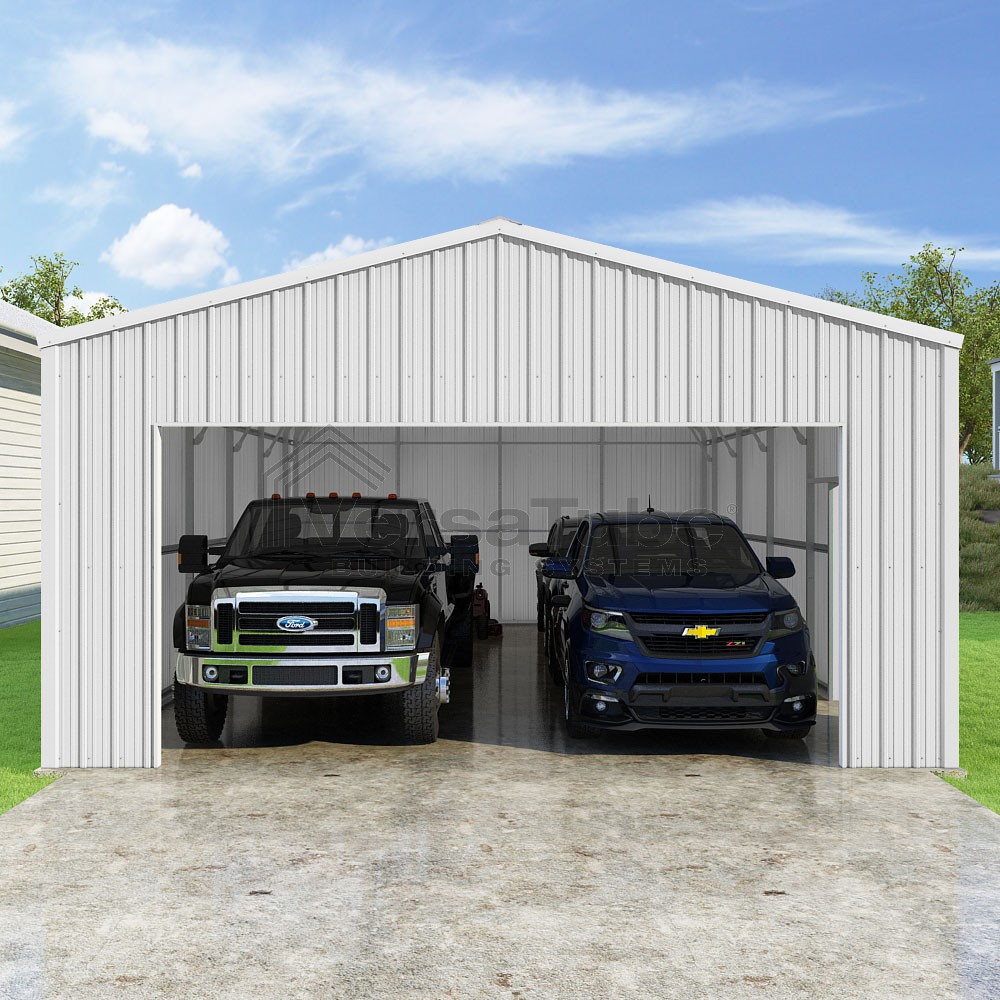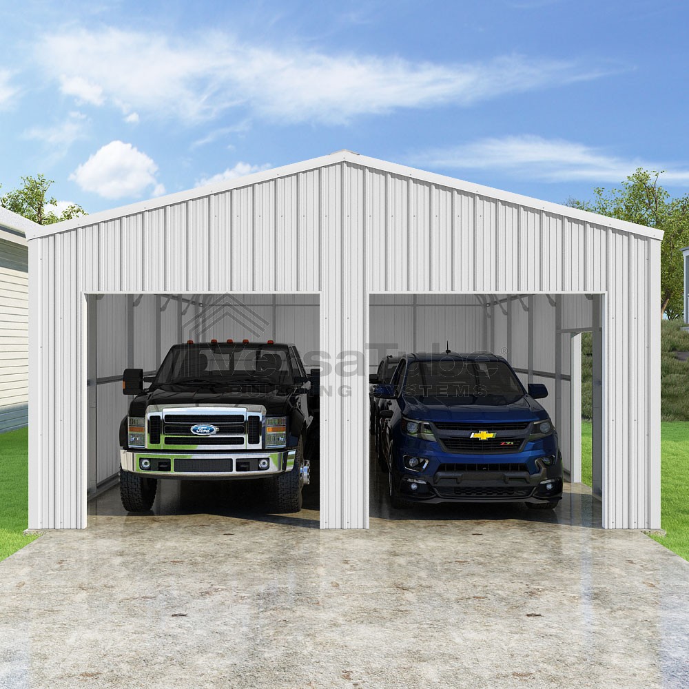 Summit Series DIY garage kit features vertical sheet metal roof and siding panels for a consistent look.