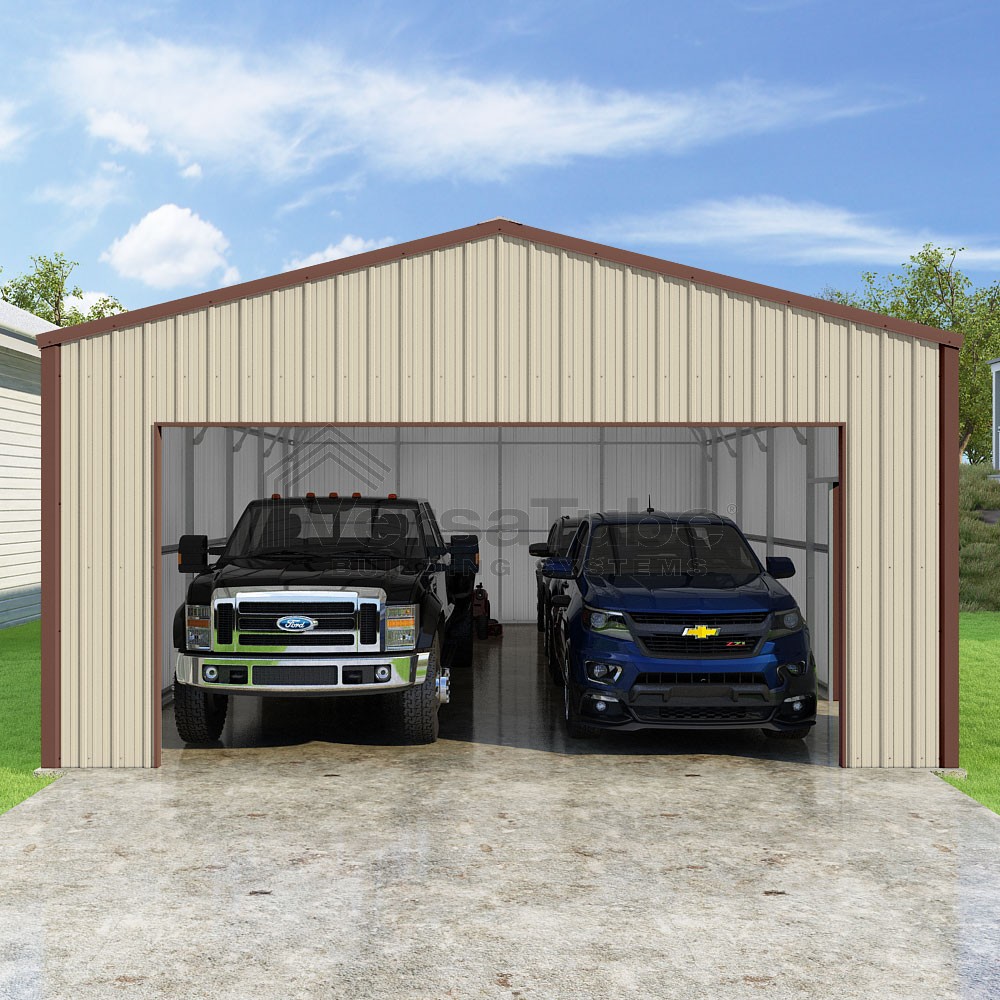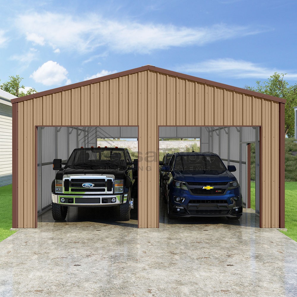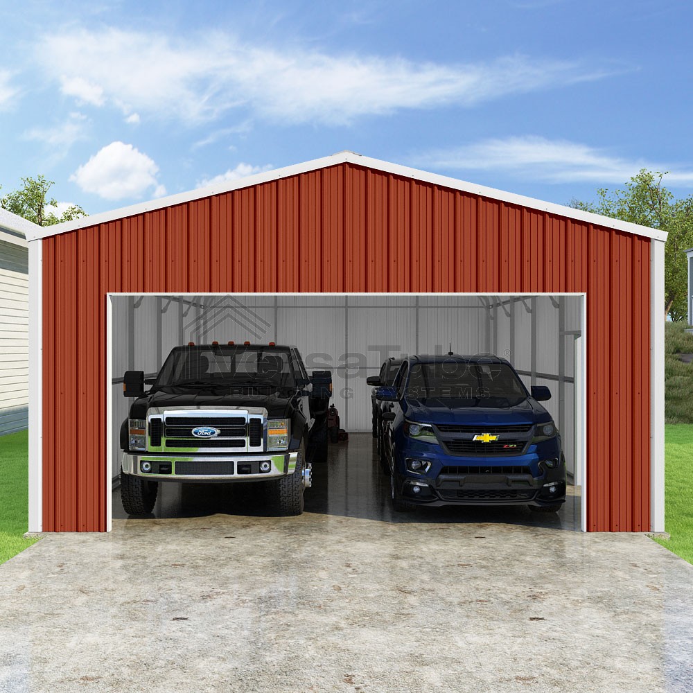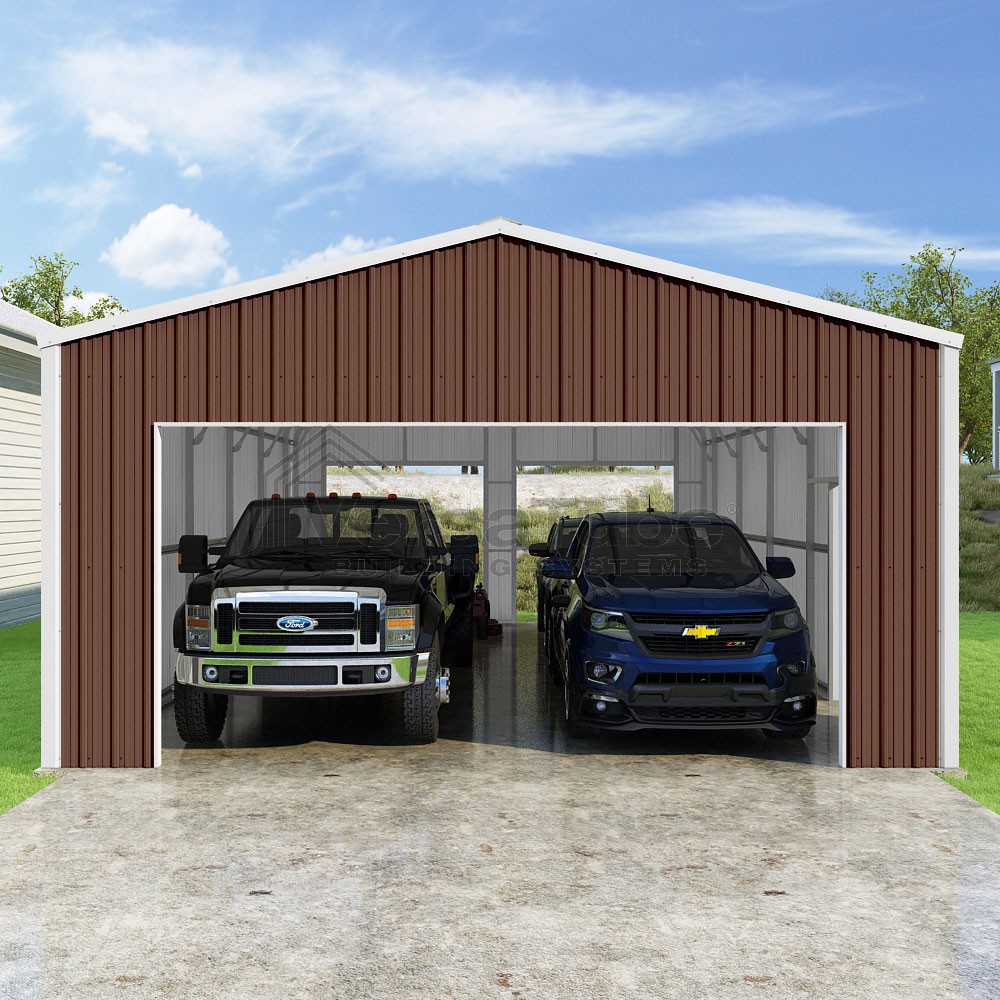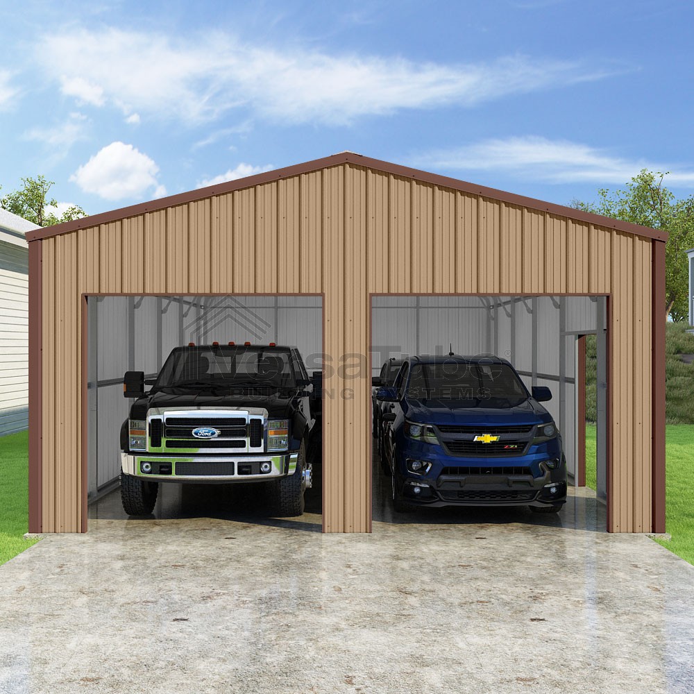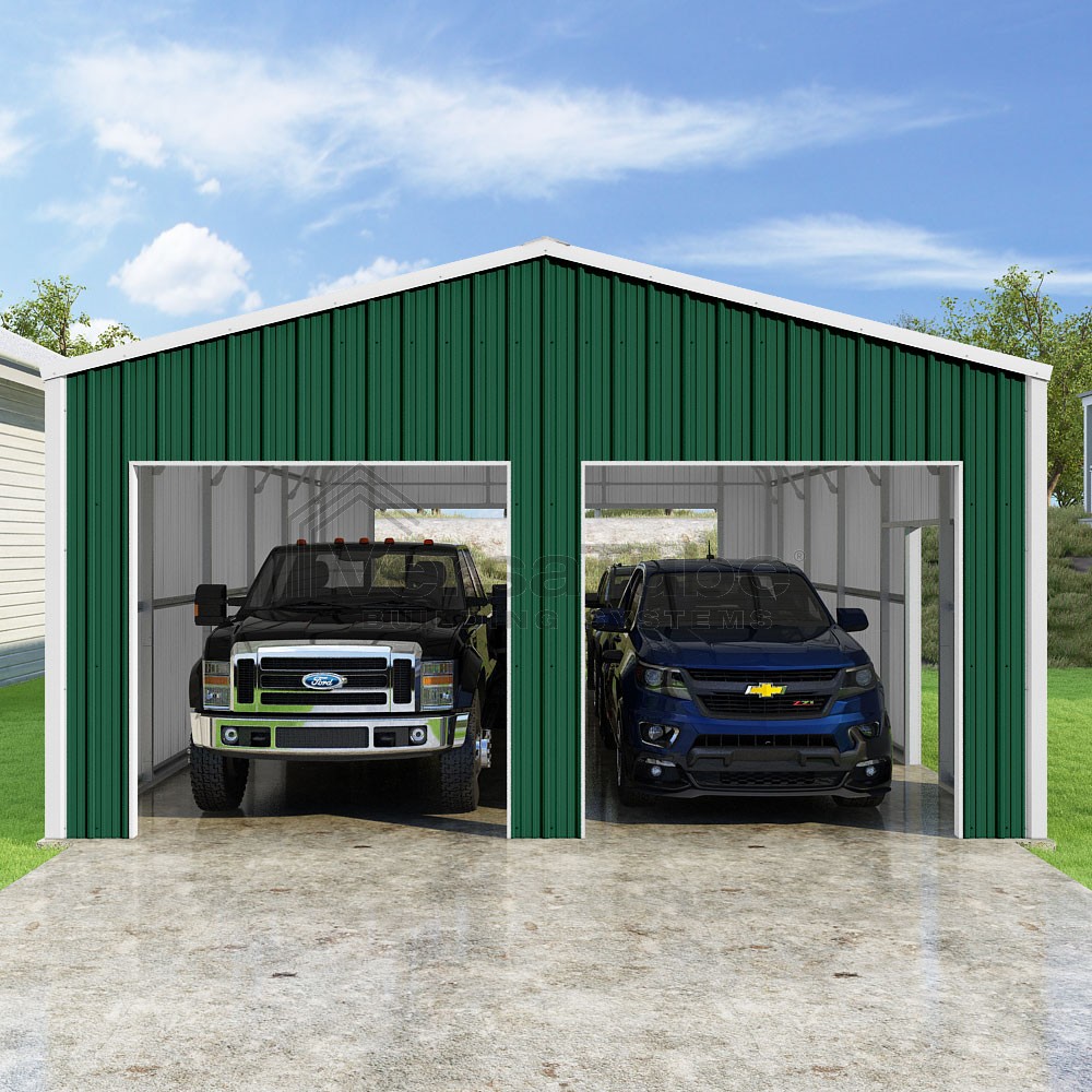 Summit Series DIY garage kit features vertical sheet metal roof and siding panels for a consistent look.
