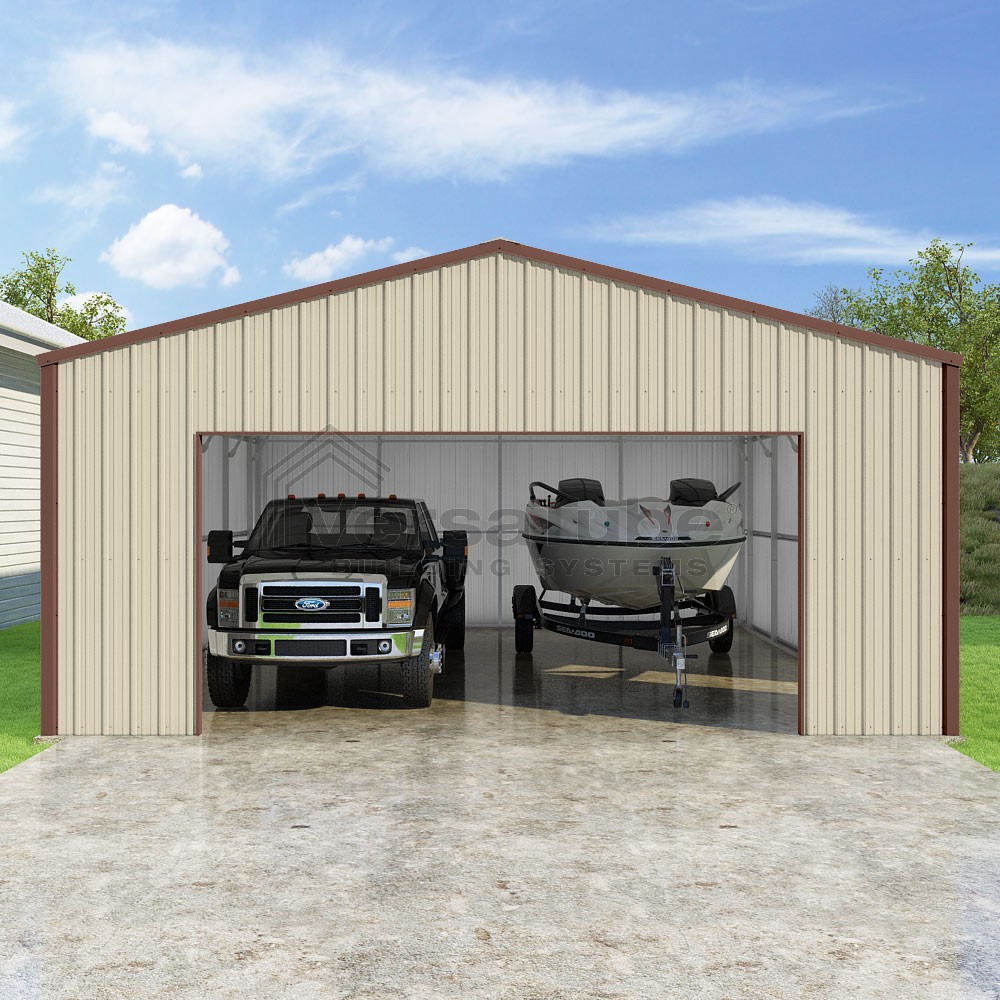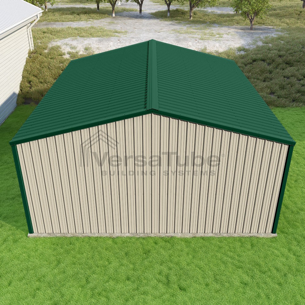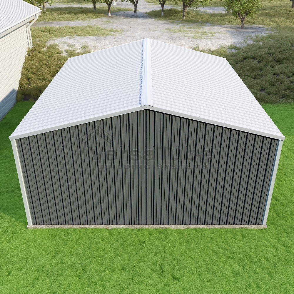 Summit Series DIY garage kit features vertical sheet metal roof and siding panels for a consistent look.