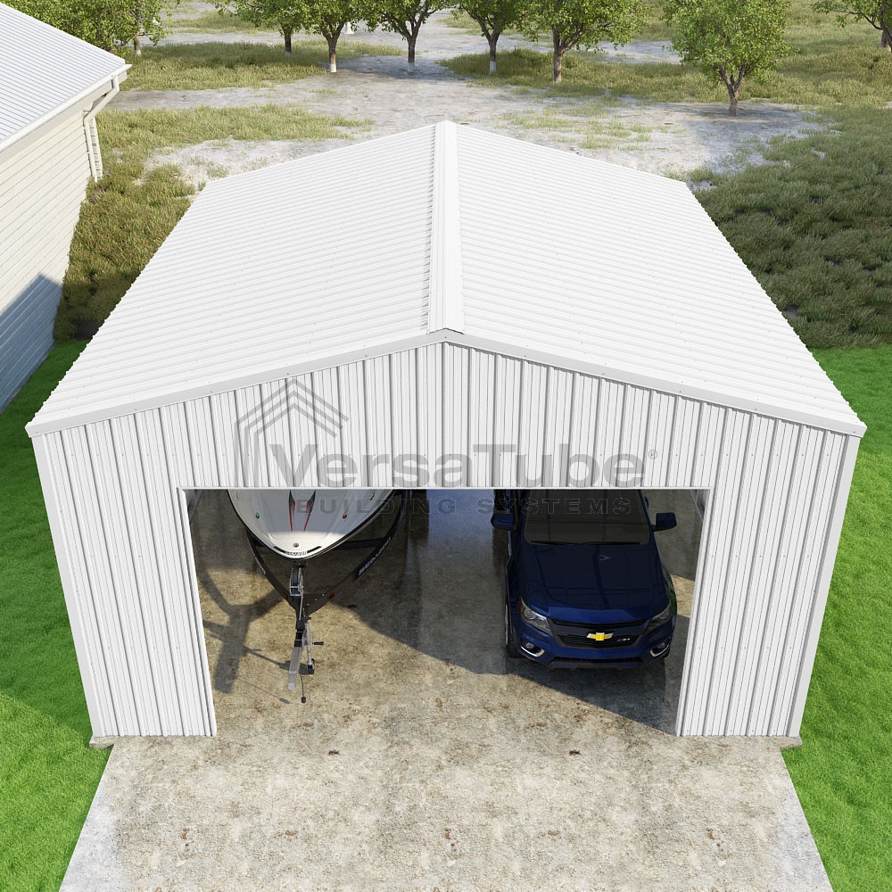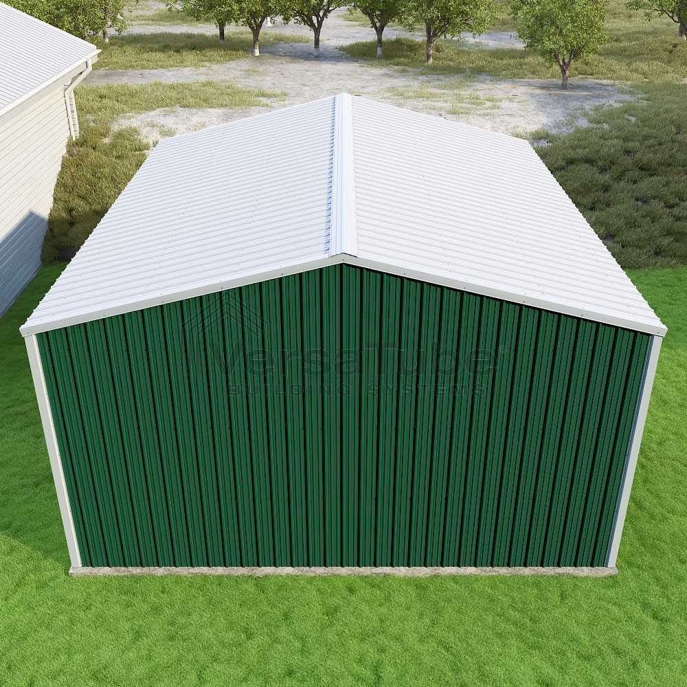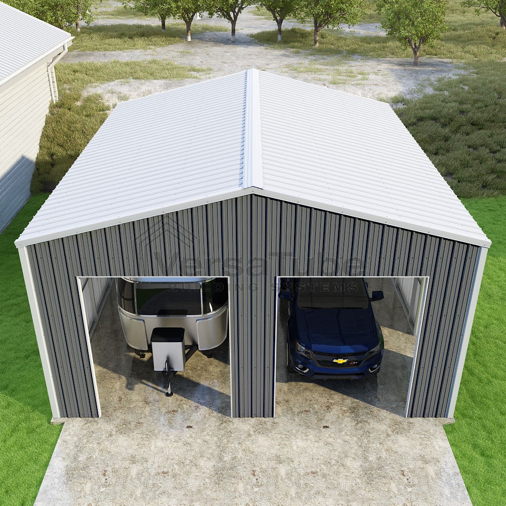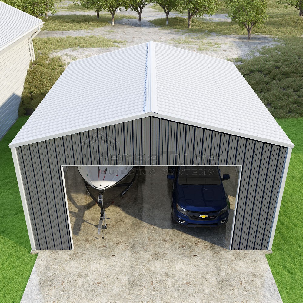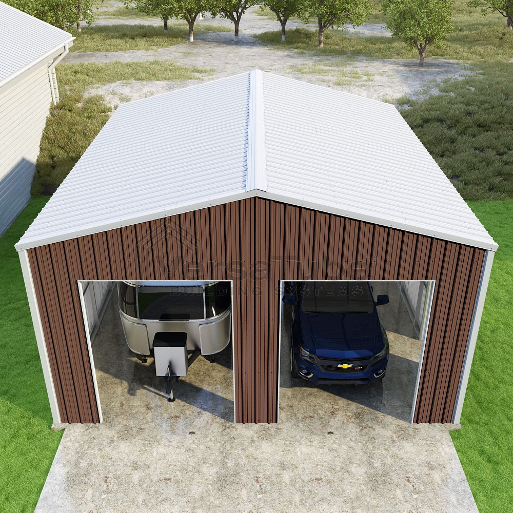 Summit Series DIY garage kit features vertical sheet metal roof and siding panels for a consistent look.