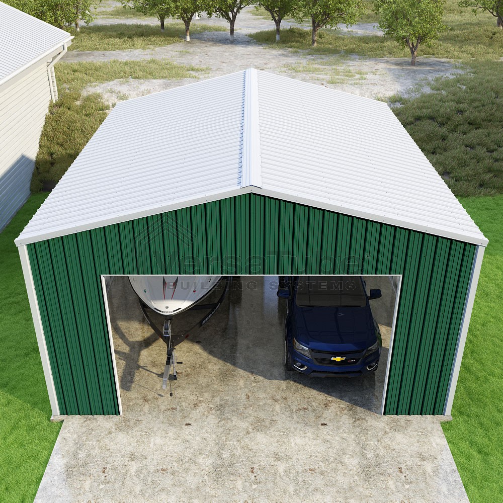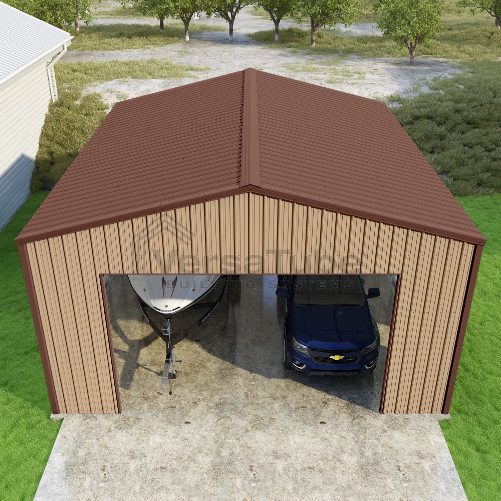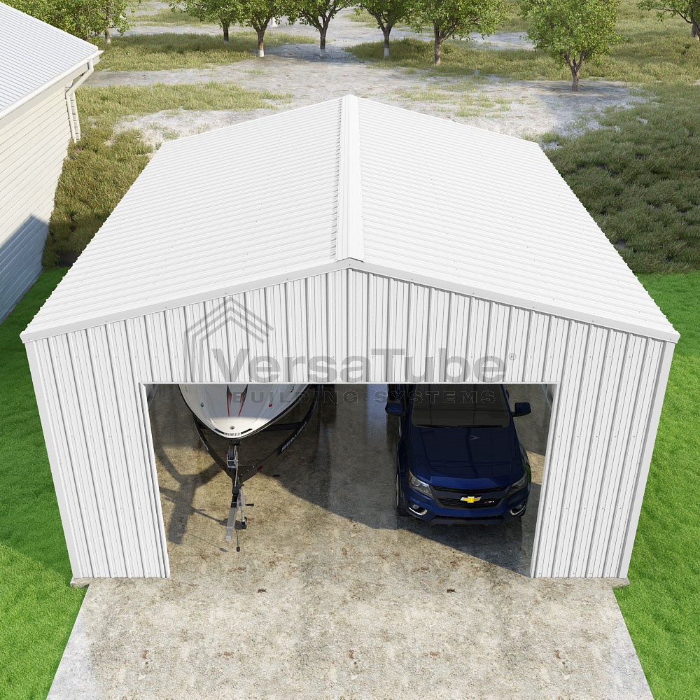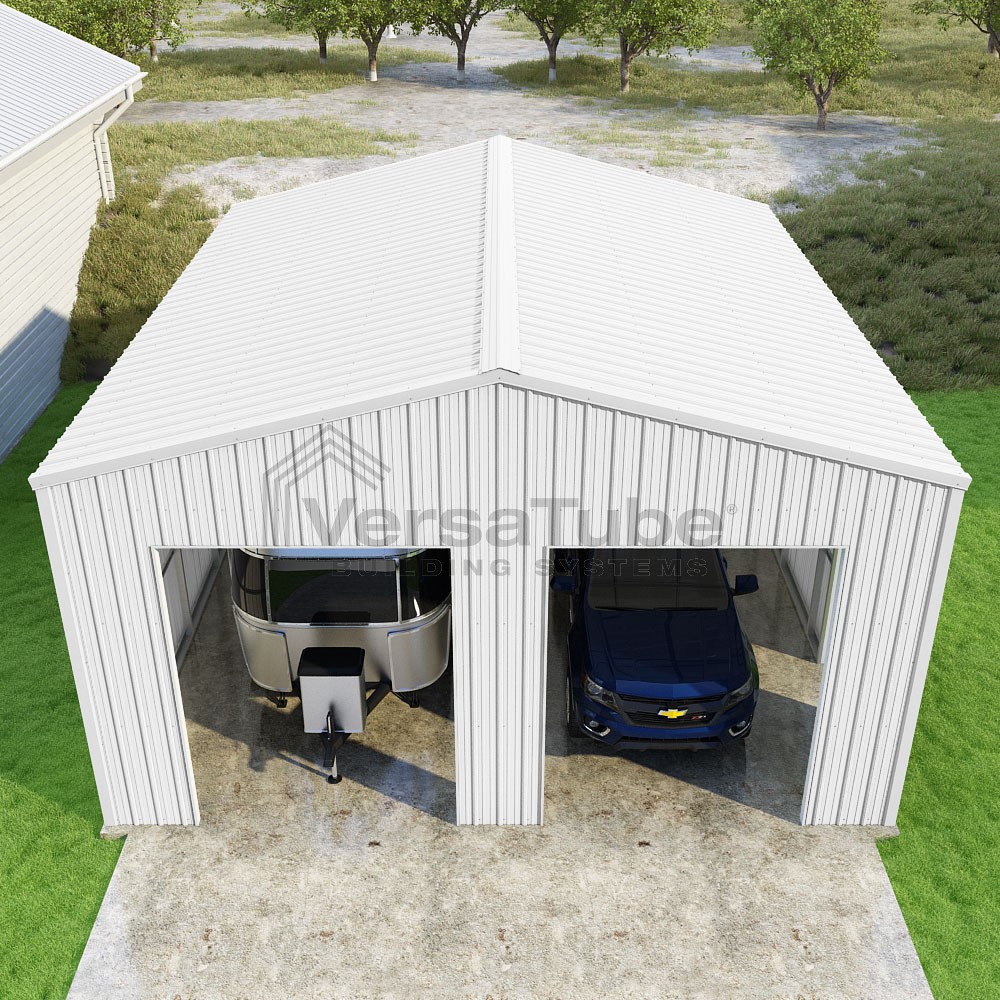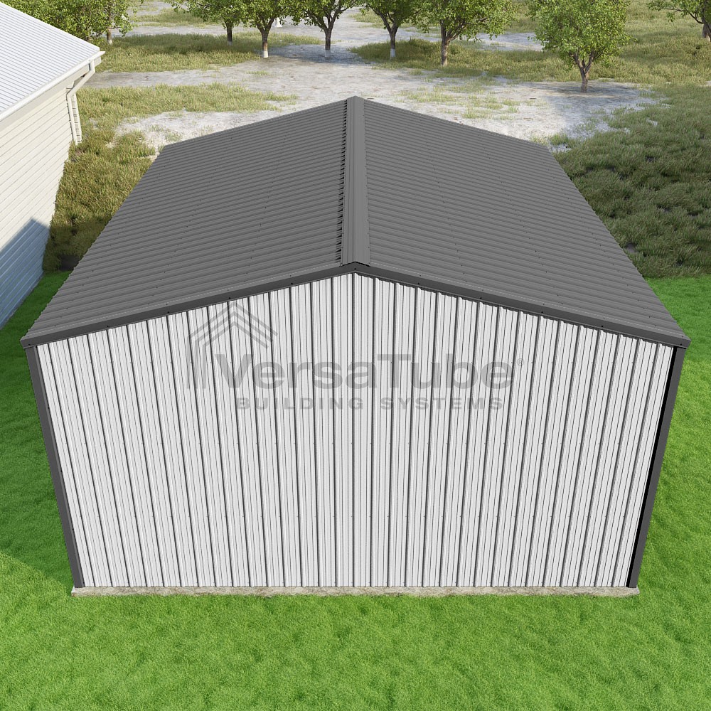 Summit Series DIY garage kit features vertical sheet metal roof and siding panels for a consistent look.