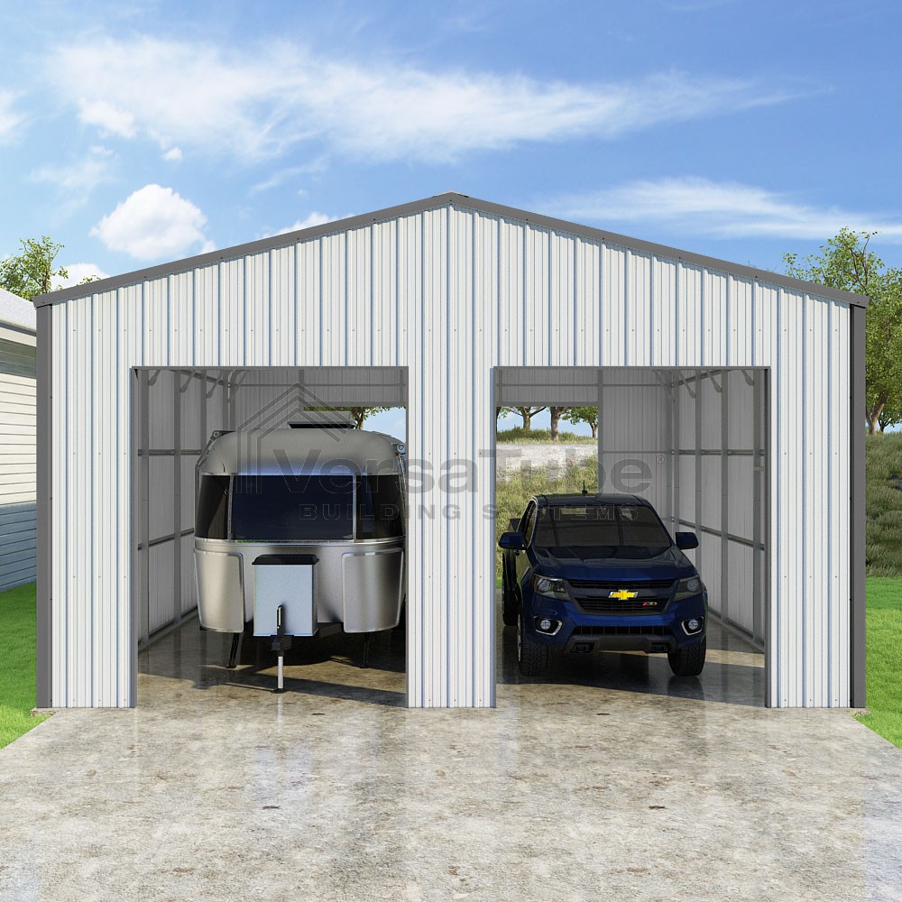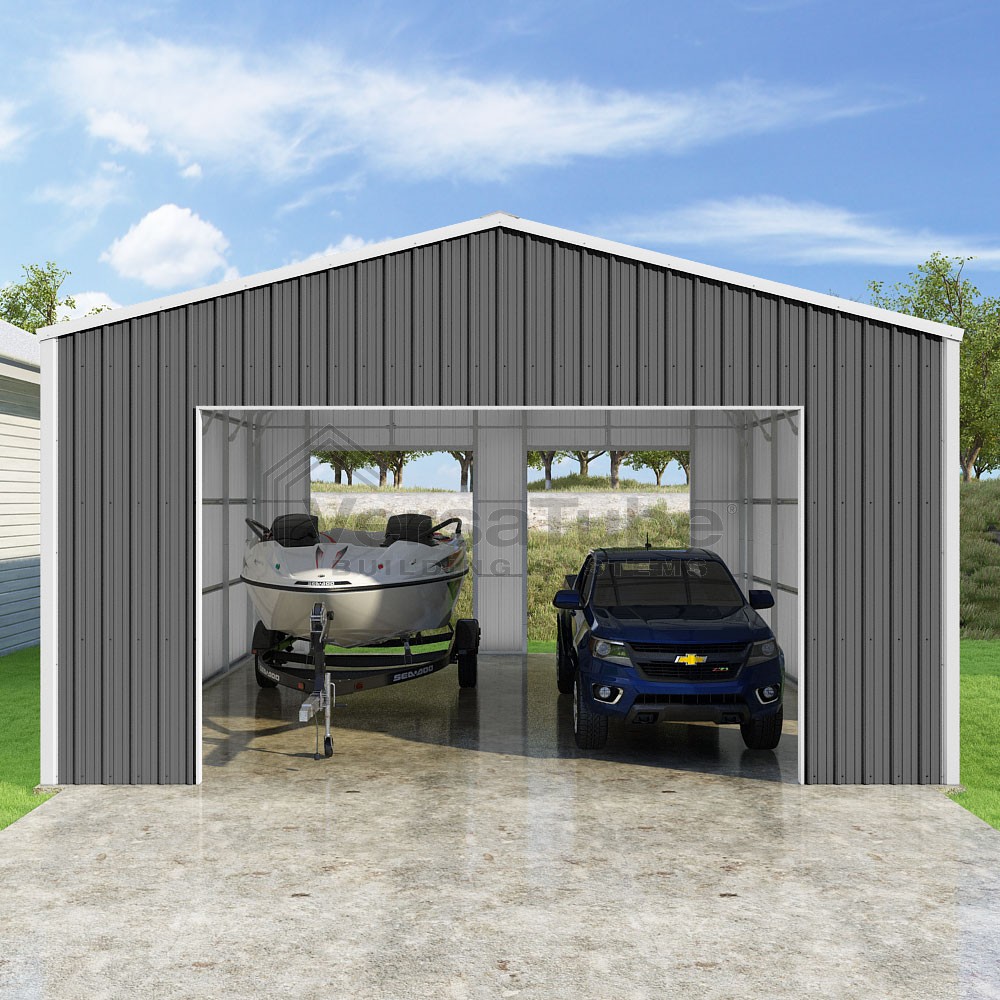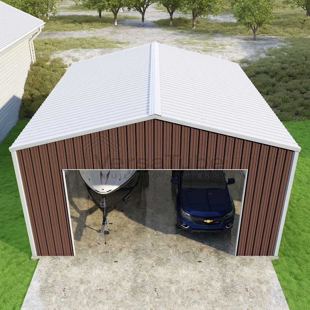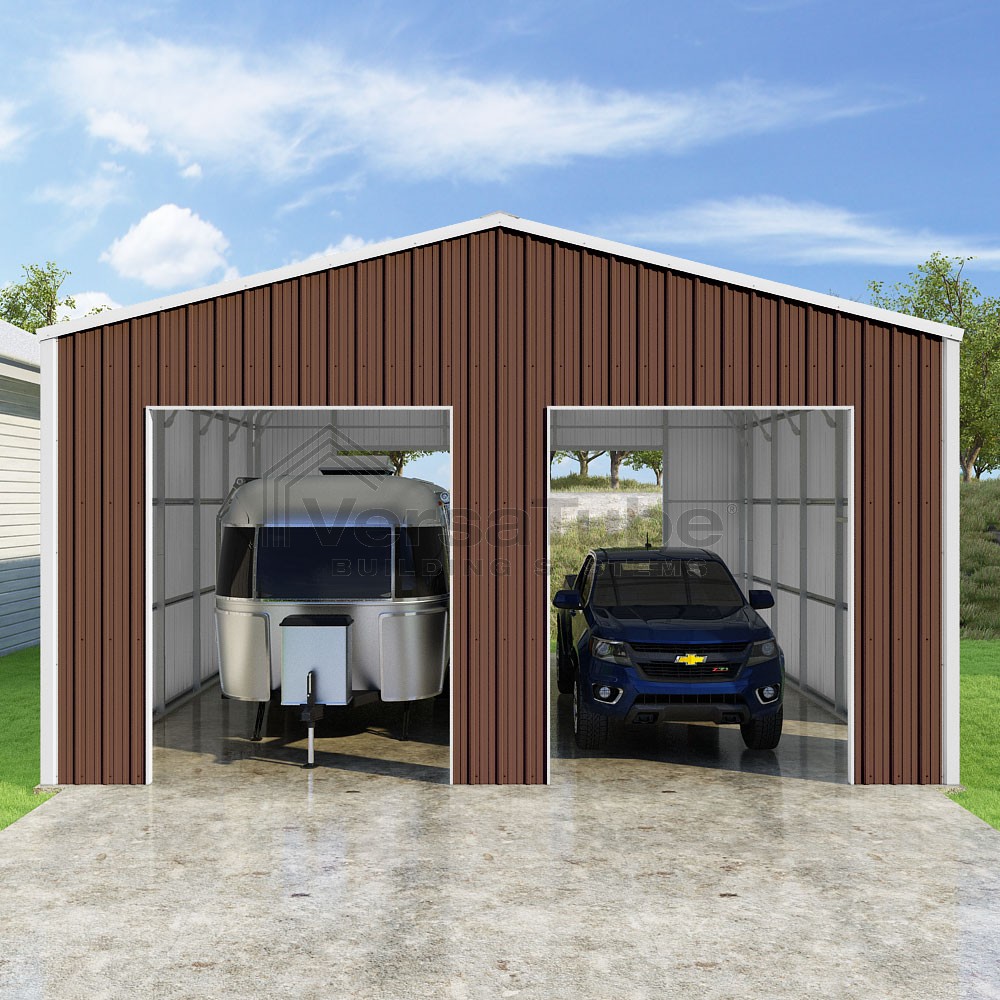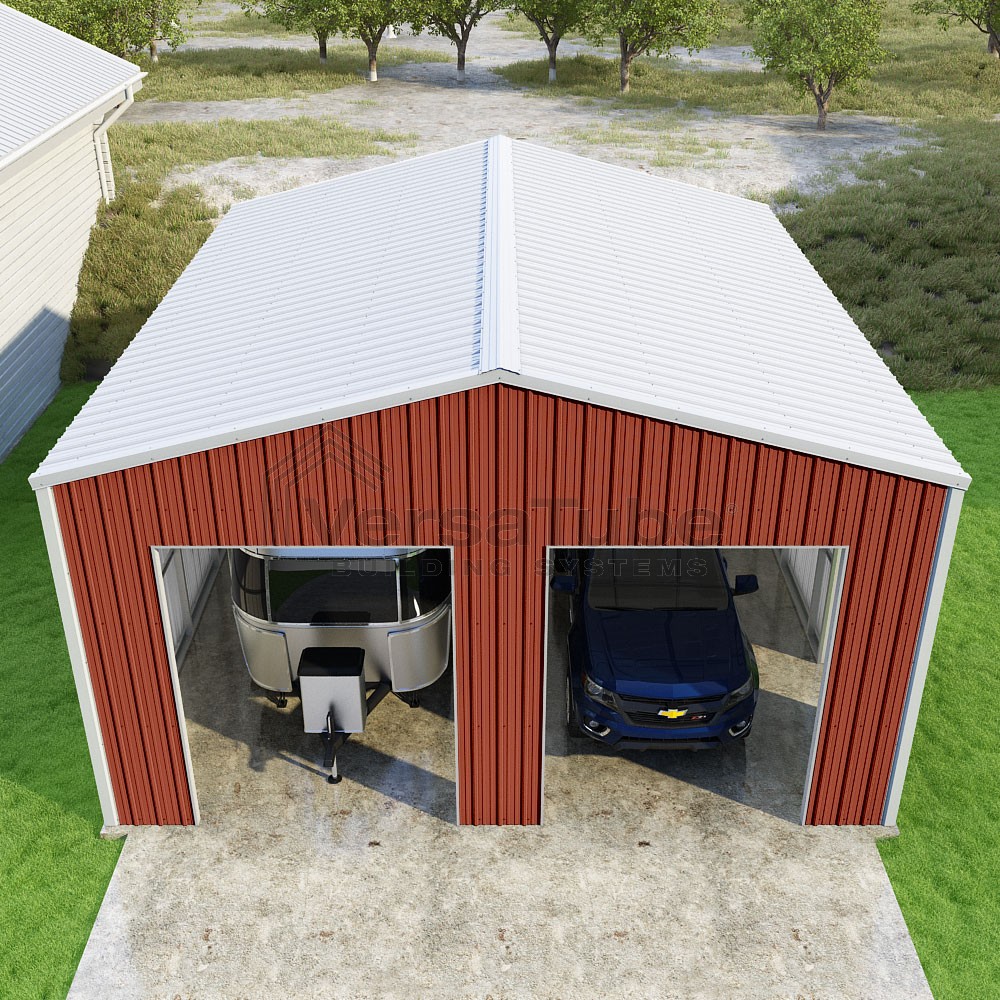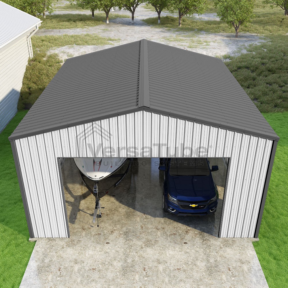 Summit Series DIY garage kit features vertical sheet metal roof and siding panels for a consistent look.