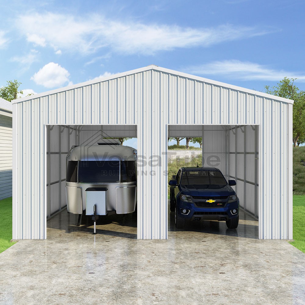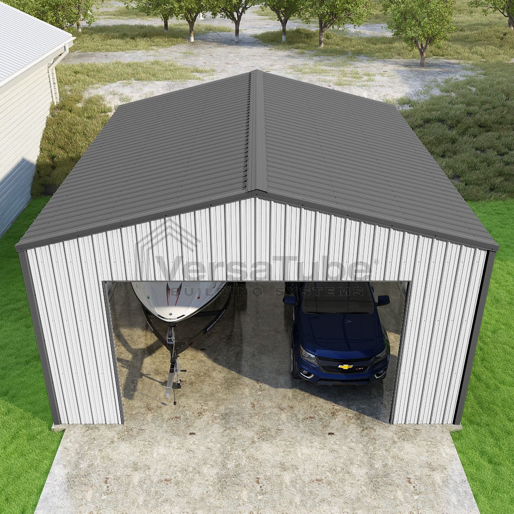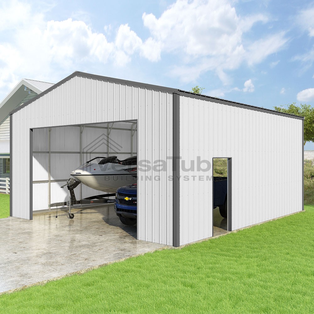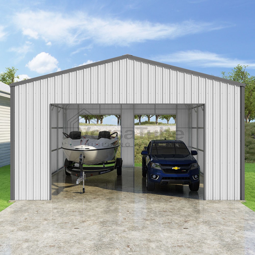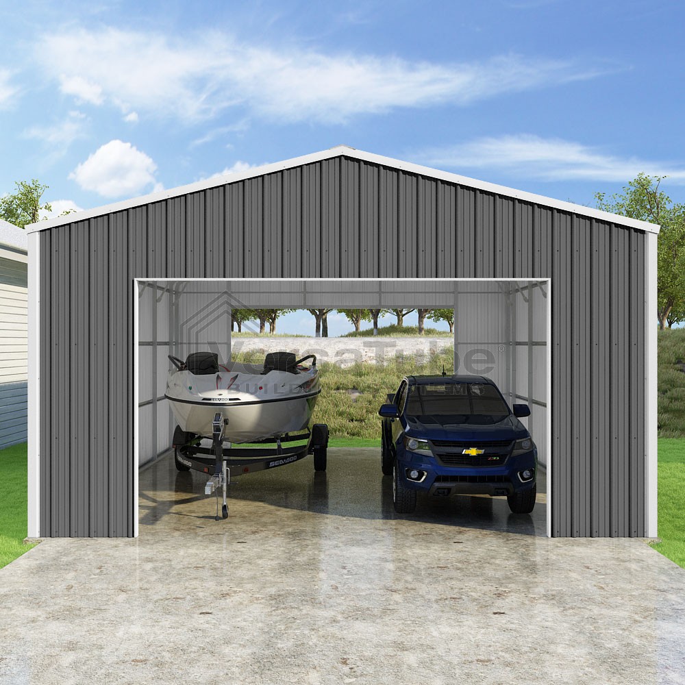 Summit Series DIY garage kit features vertical sheet metal roof and siding panels for a consistent look.