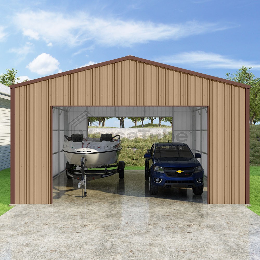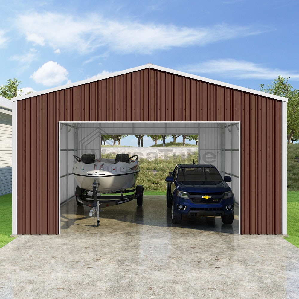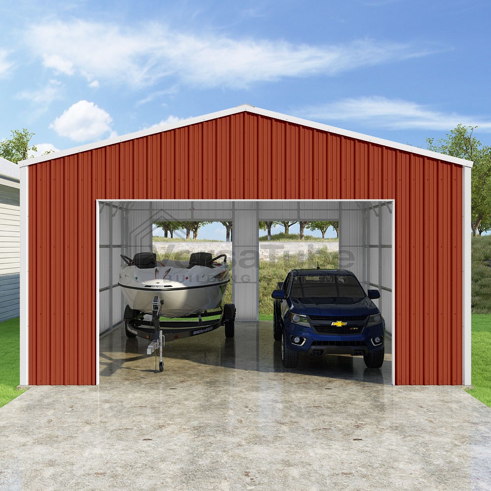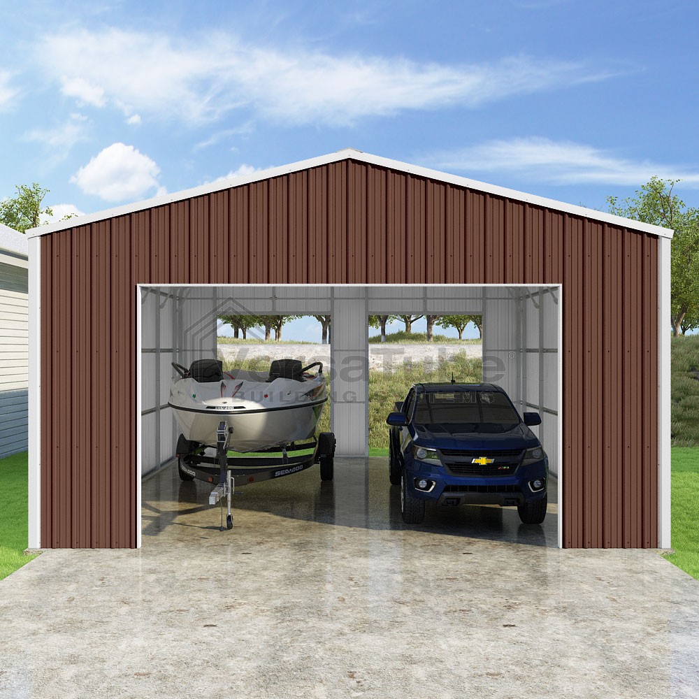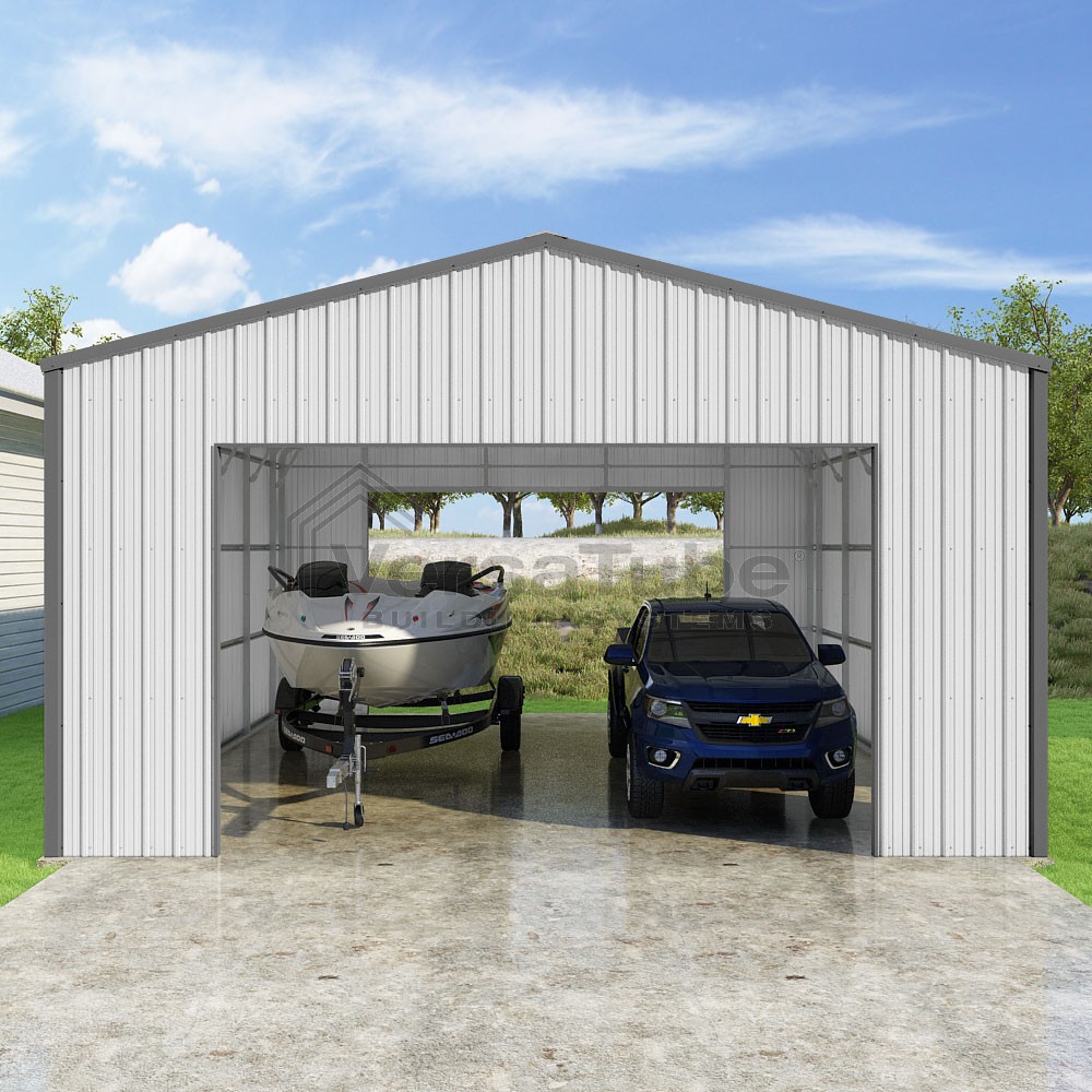 Summit Series DIY garage kit features vertical sheet metal roof and siding panels for a consistent look.