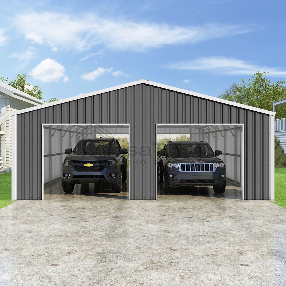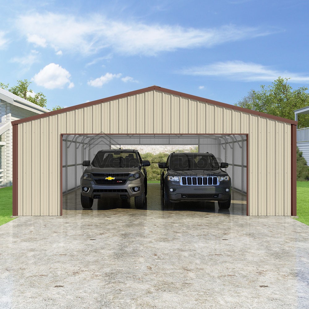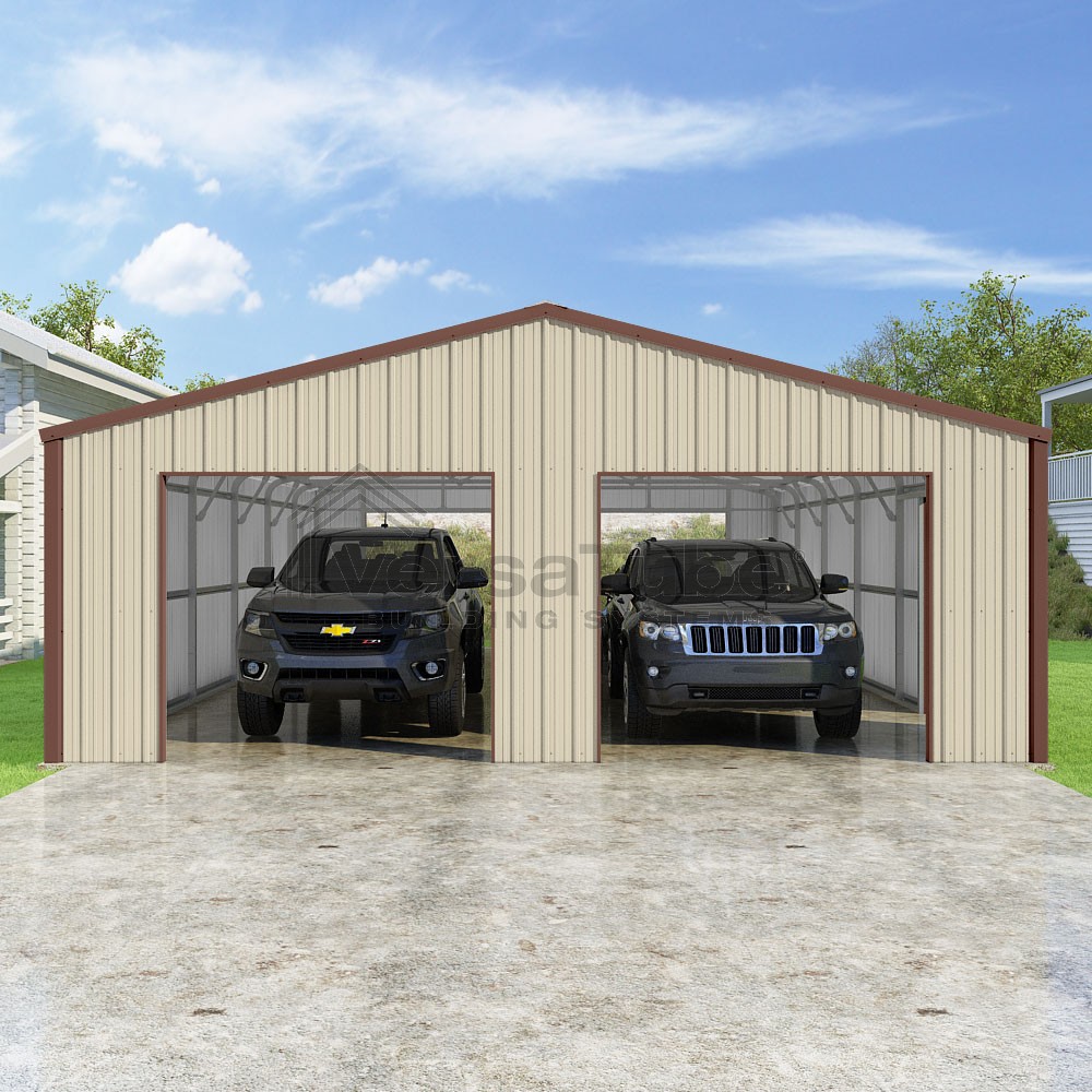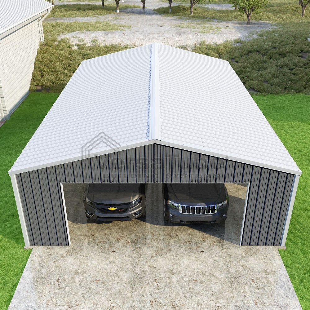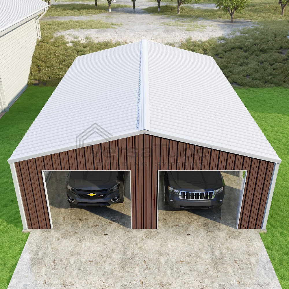 Summit Series DIY garage kit features vertical sheet metal roof and siding panels for a consistent look.