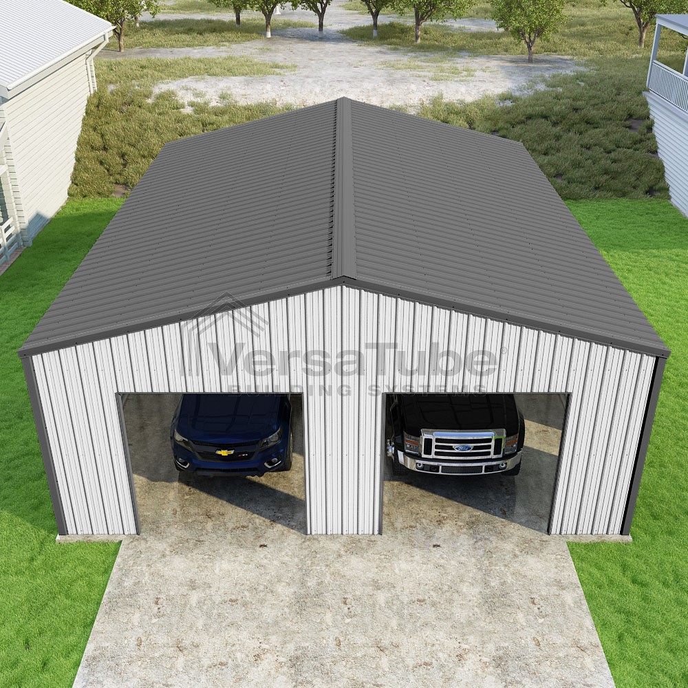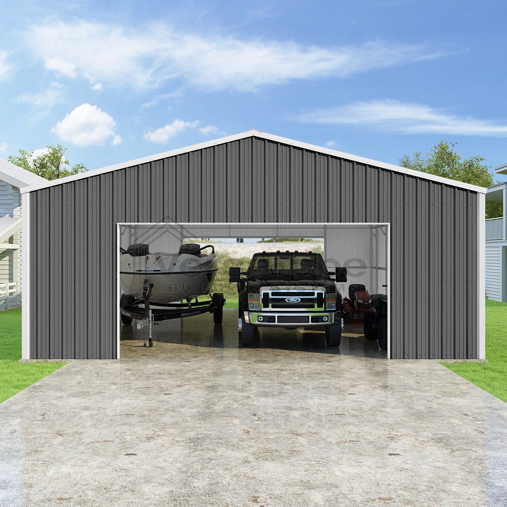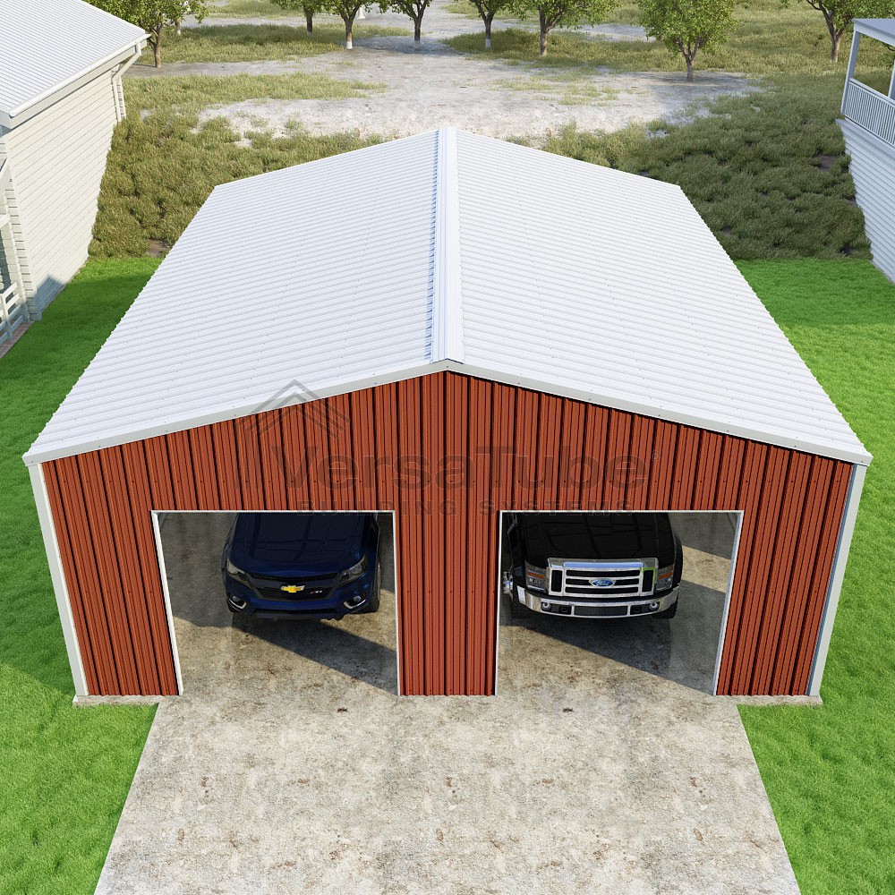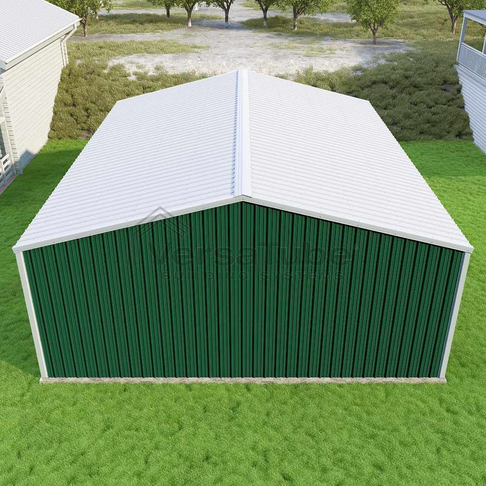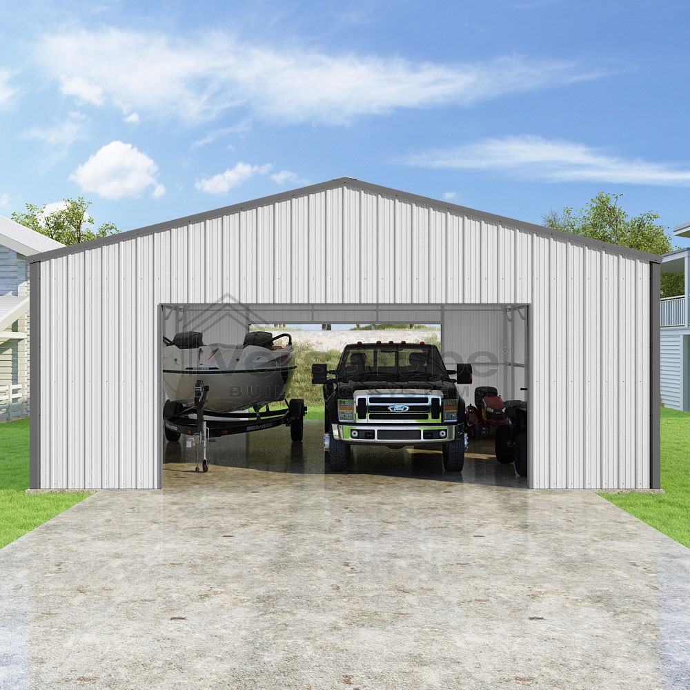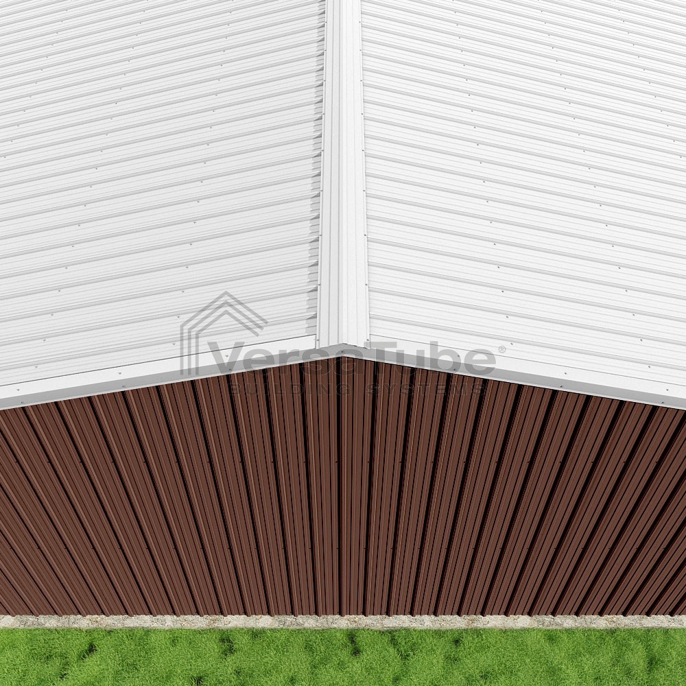 Summit Series DIY garage kit features vertical sheet metal roof and siding panels for a consistent look.