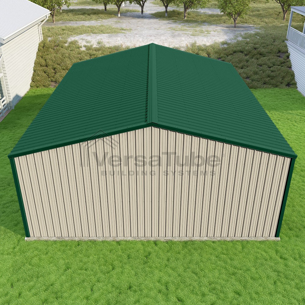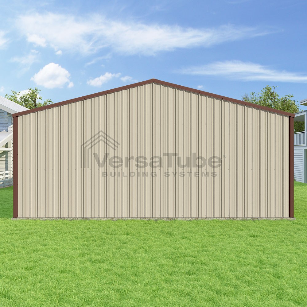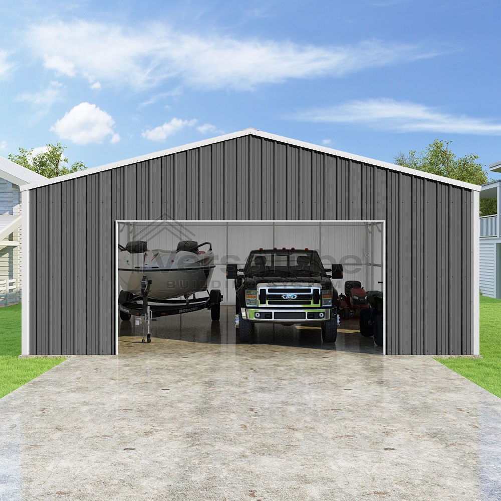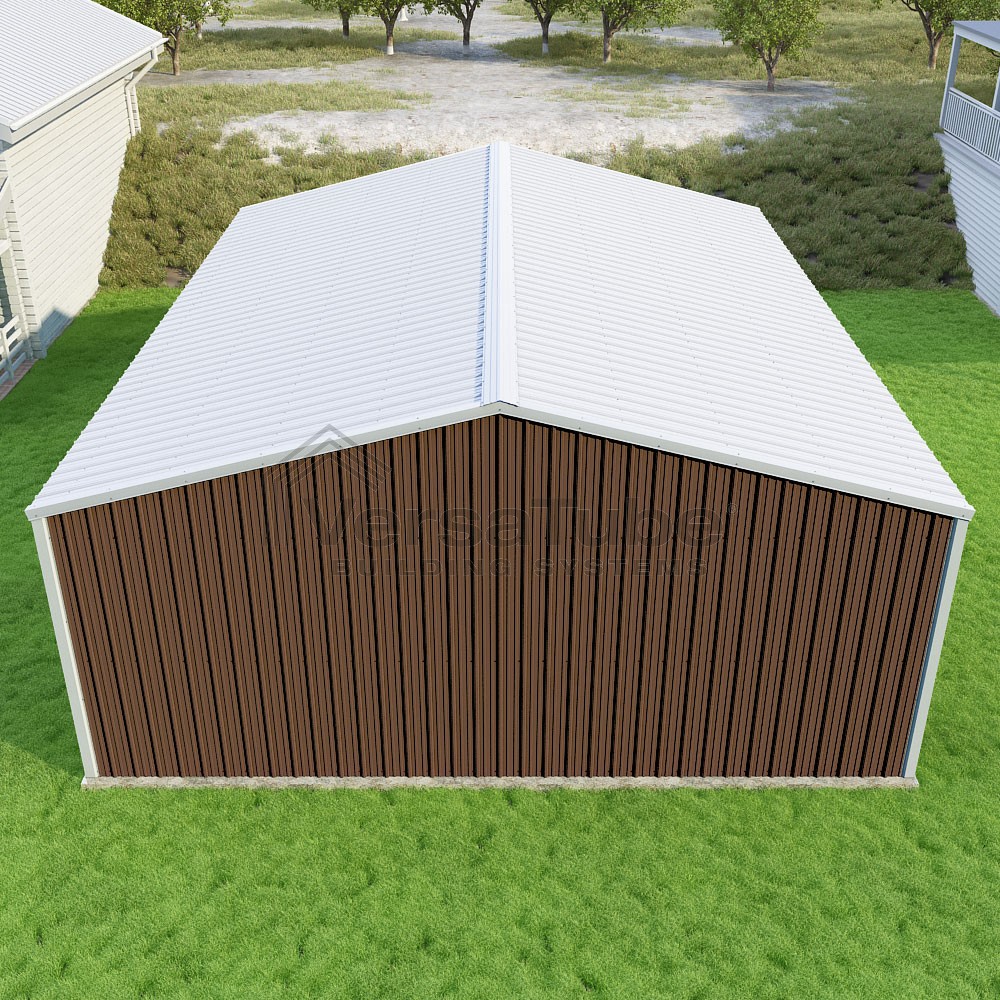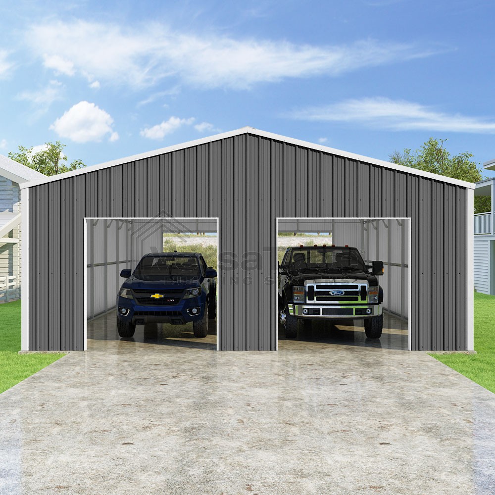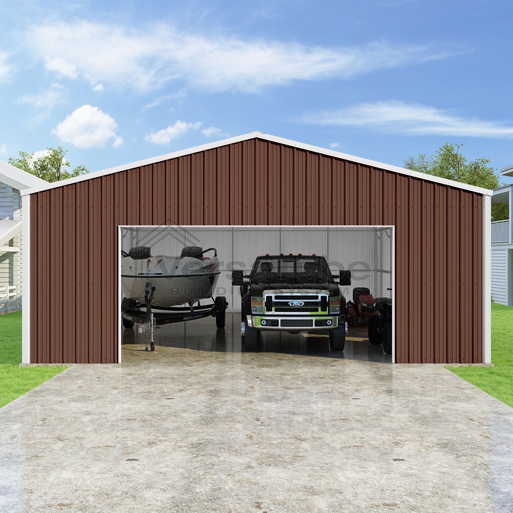 Summit Series DIY garage kit features vertical sheet metal roof and siding panels for a consistent look.