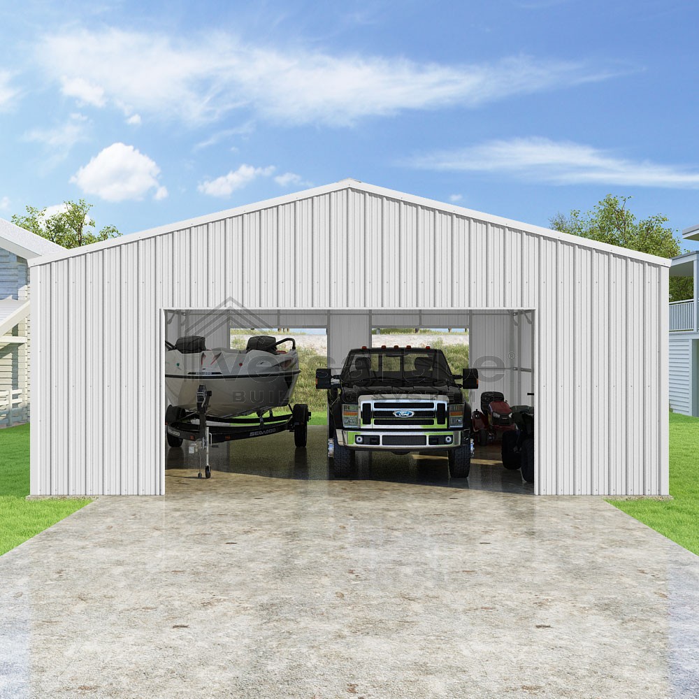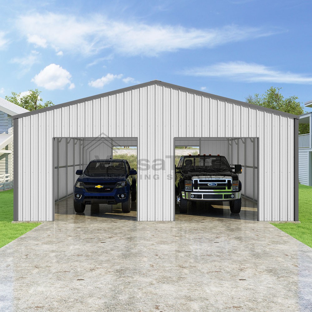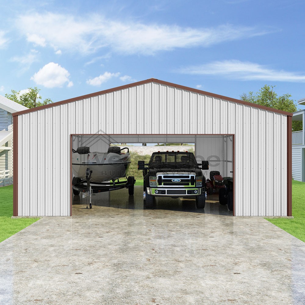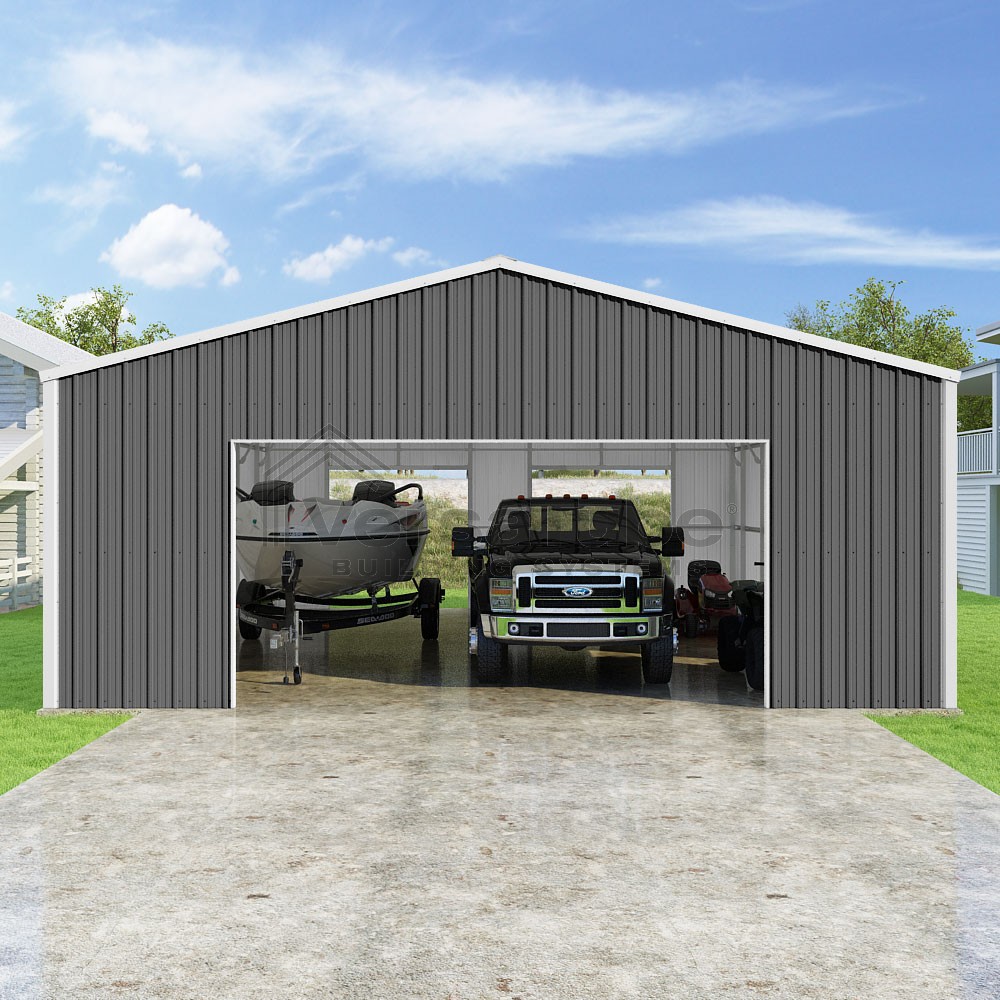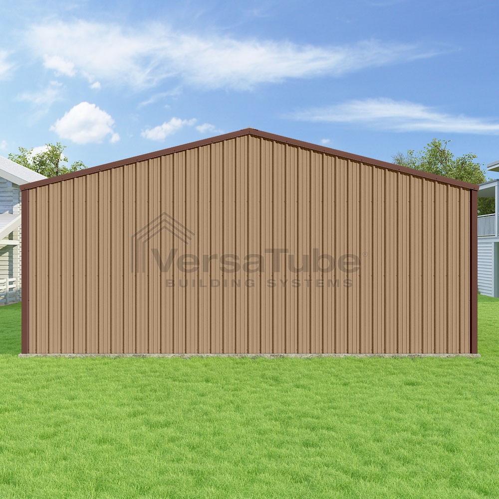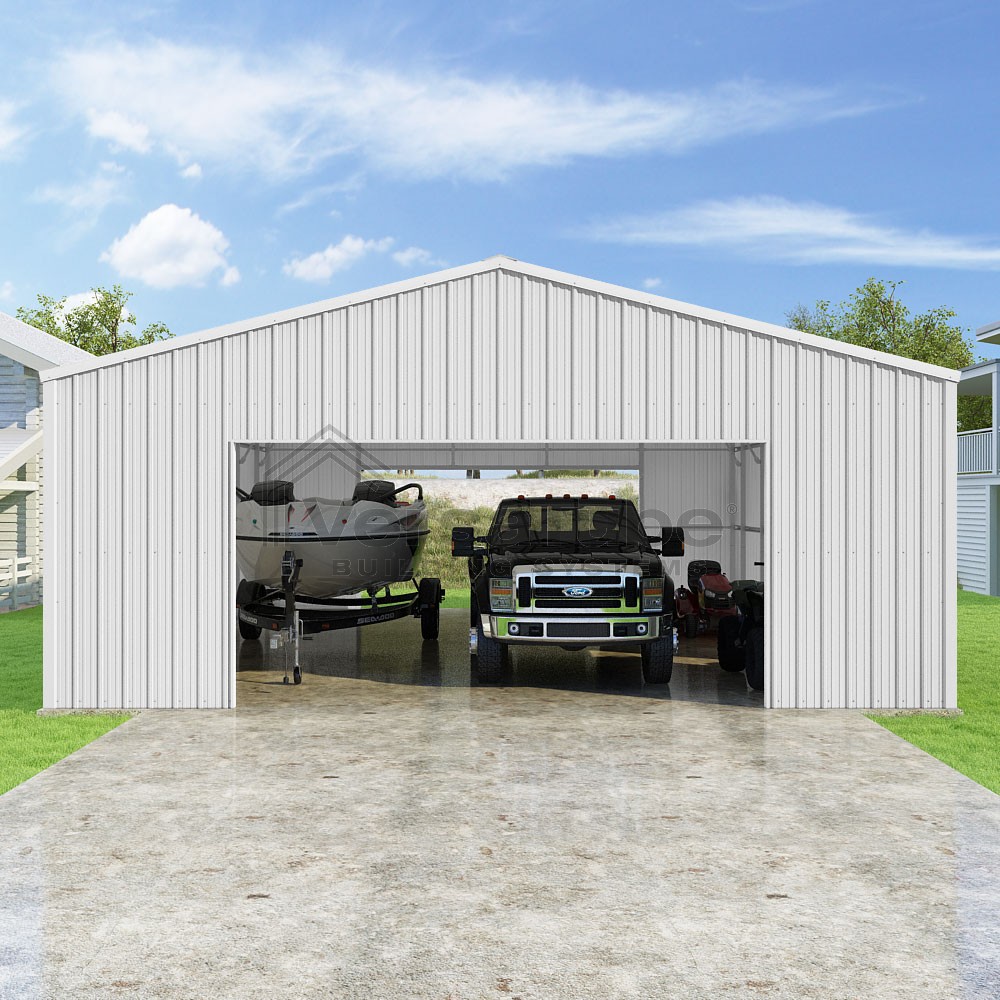 Summit Series DIY garage kit features vertical sheet metal roof and siding panels for a consistent look.