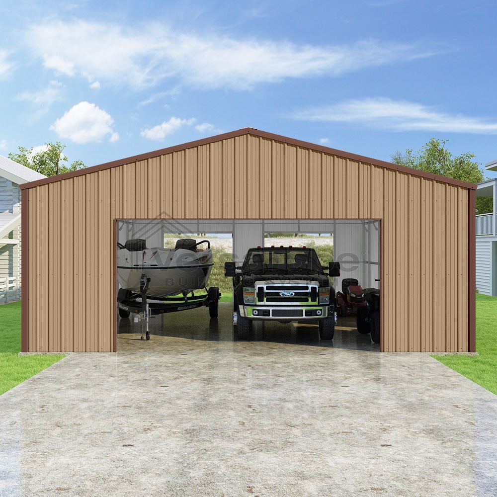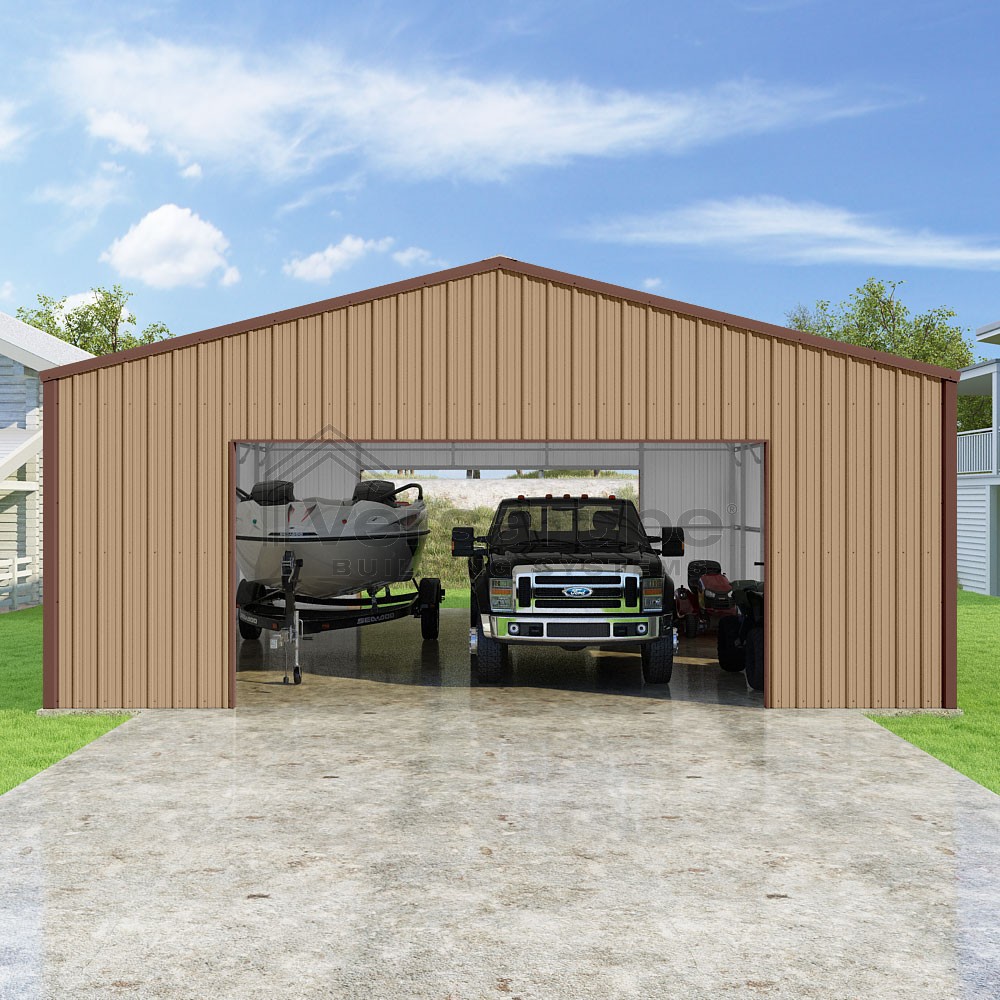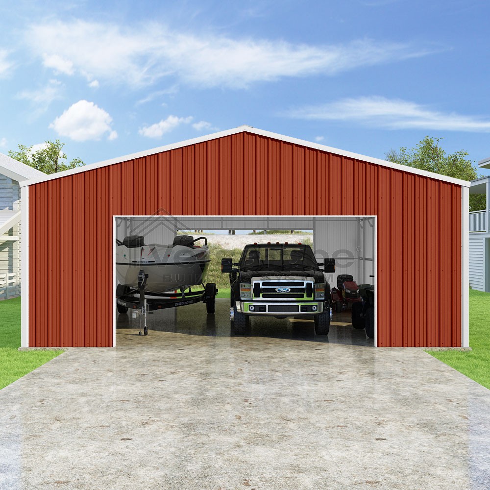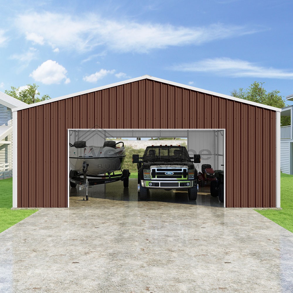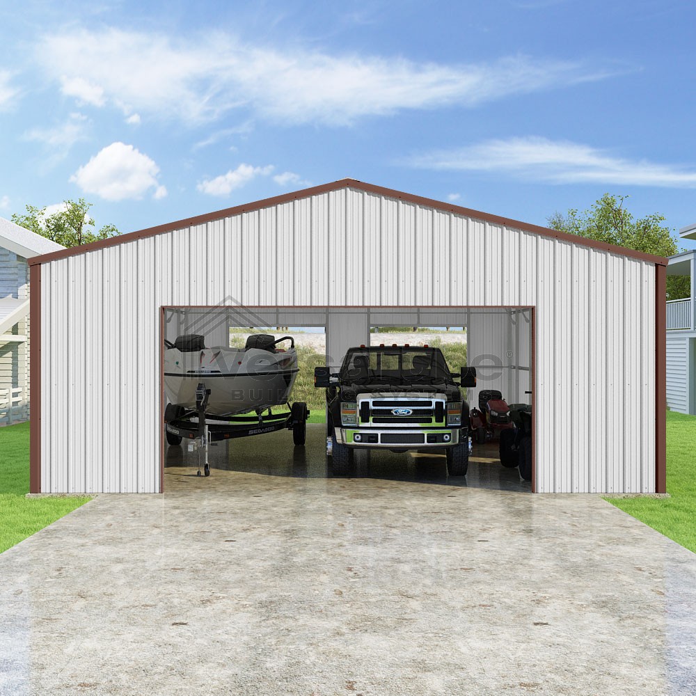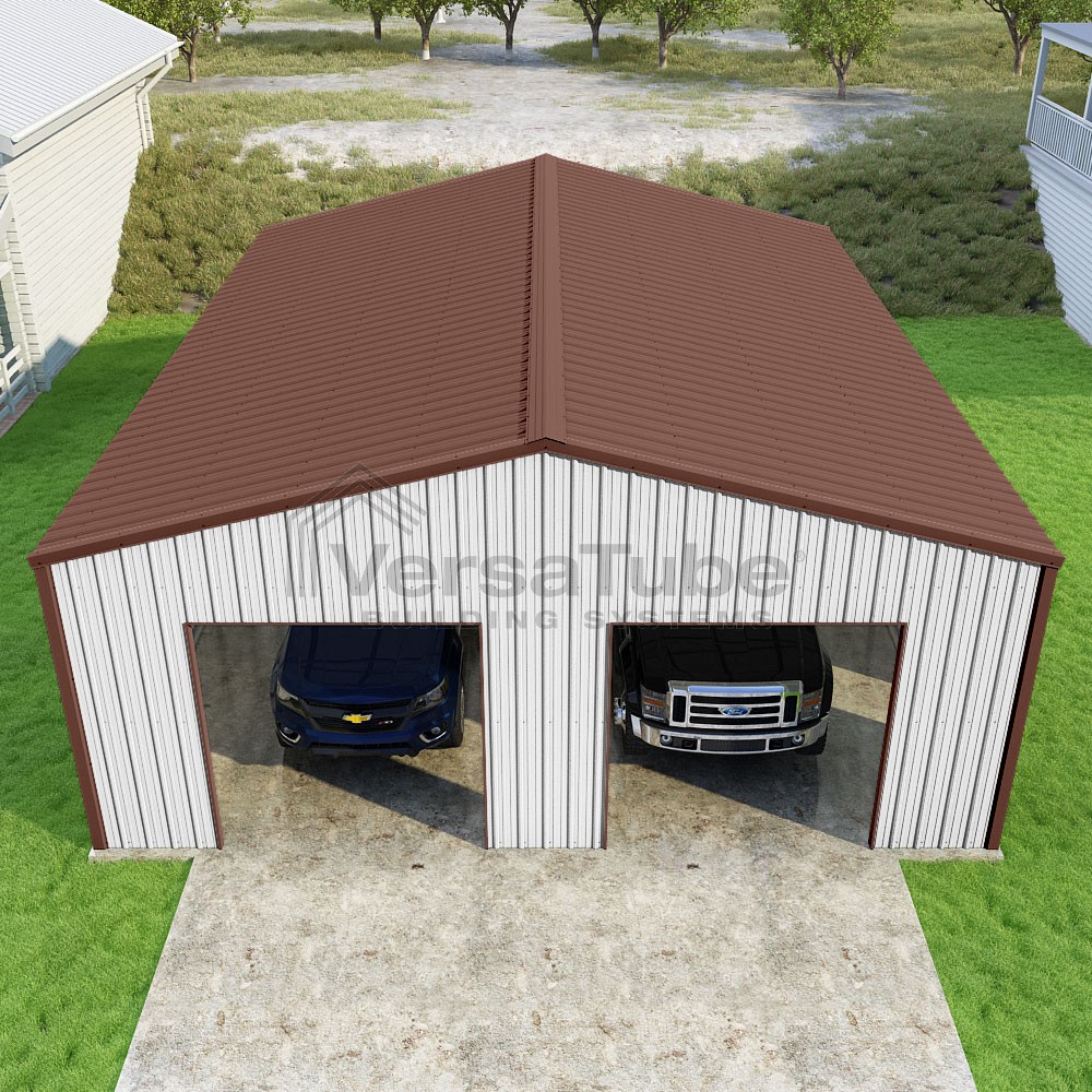 Summit Series DIY garage kit features vertical sheet metal roof and siding panels for a consistent look.