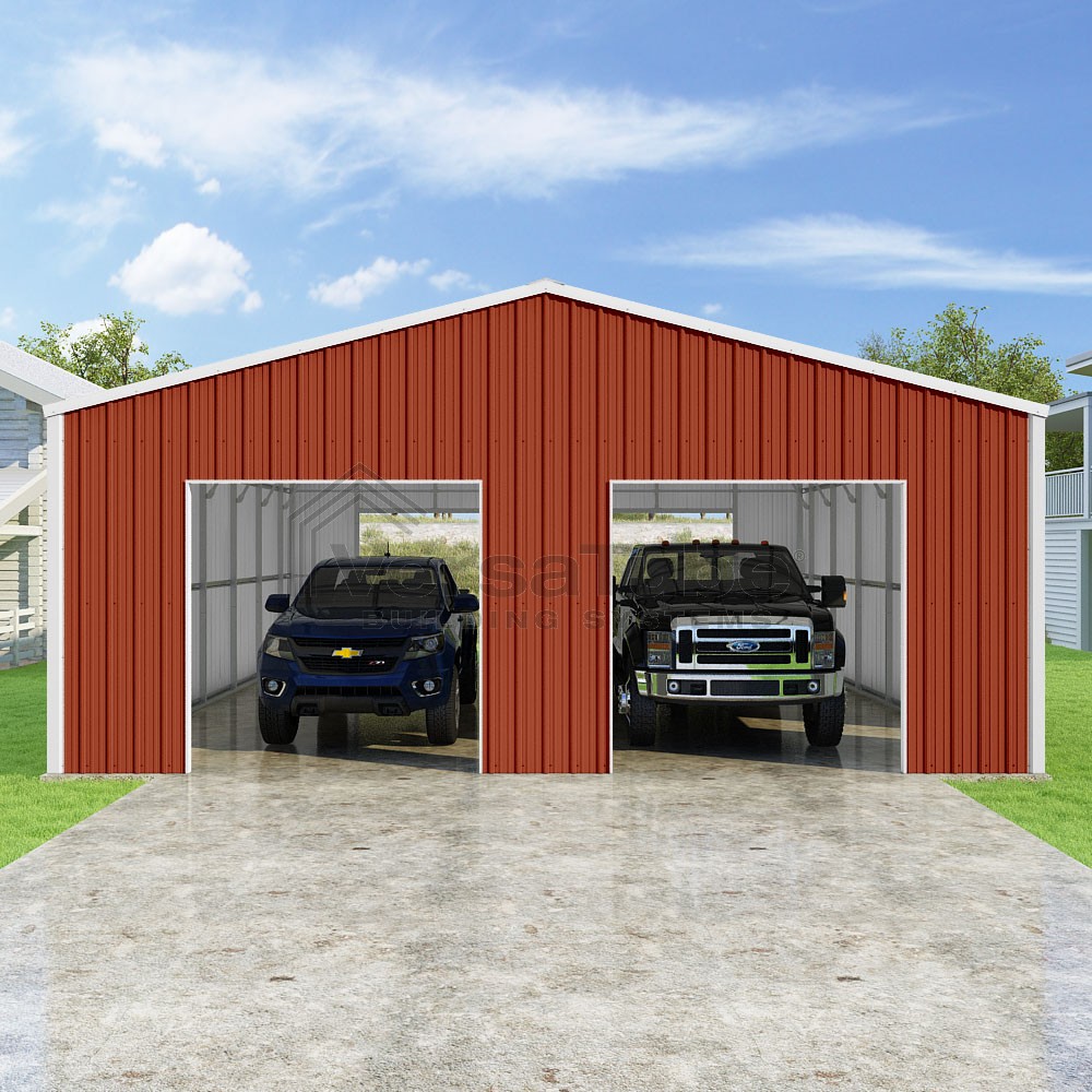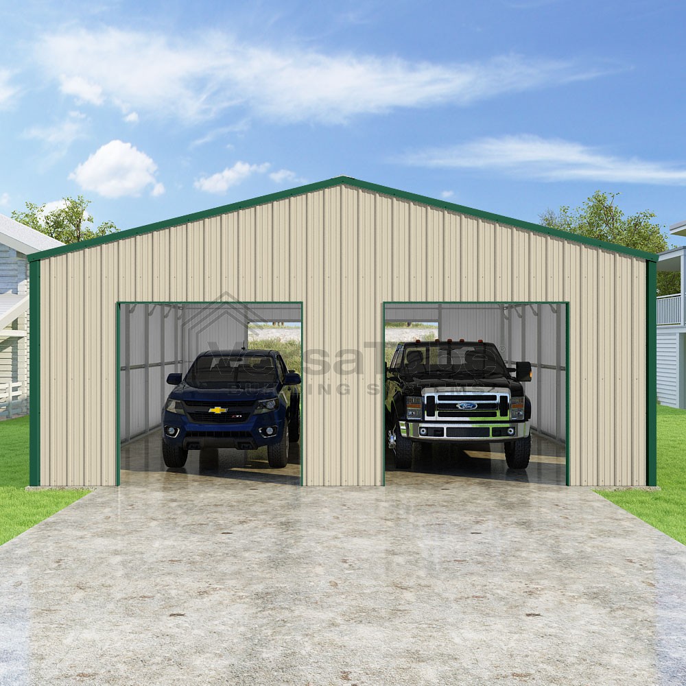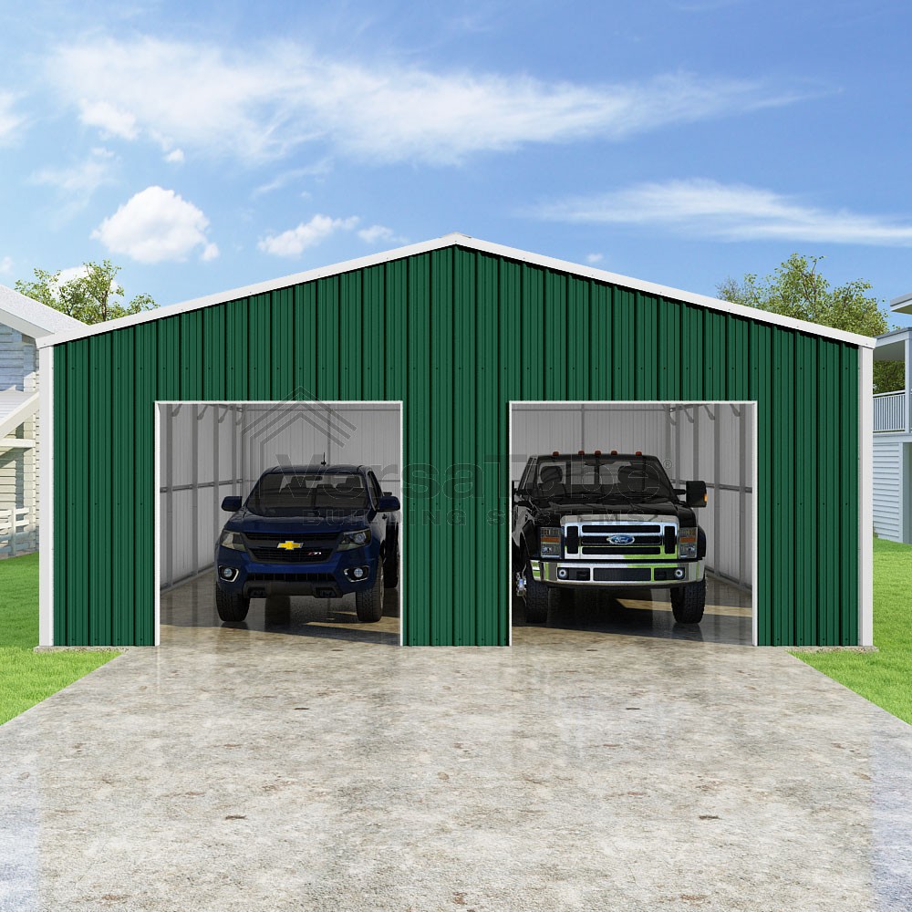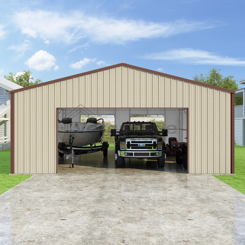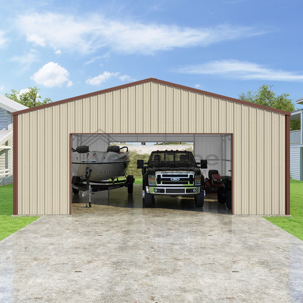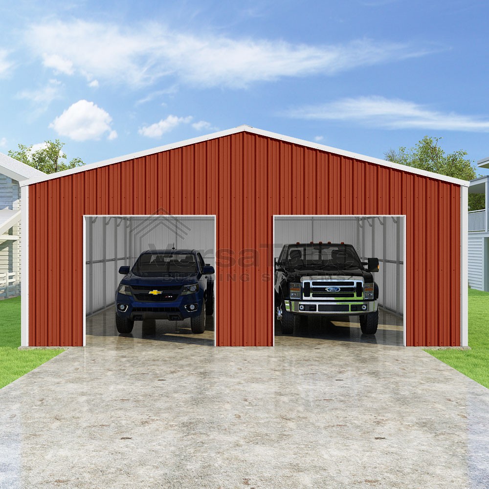 Summit Series DIY garage kit features vertical sheet metal roof and siding panels for a consistent look.