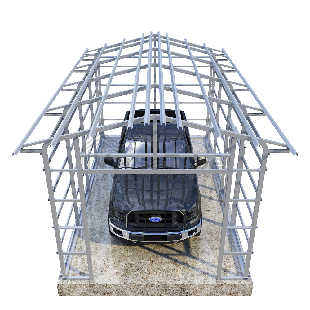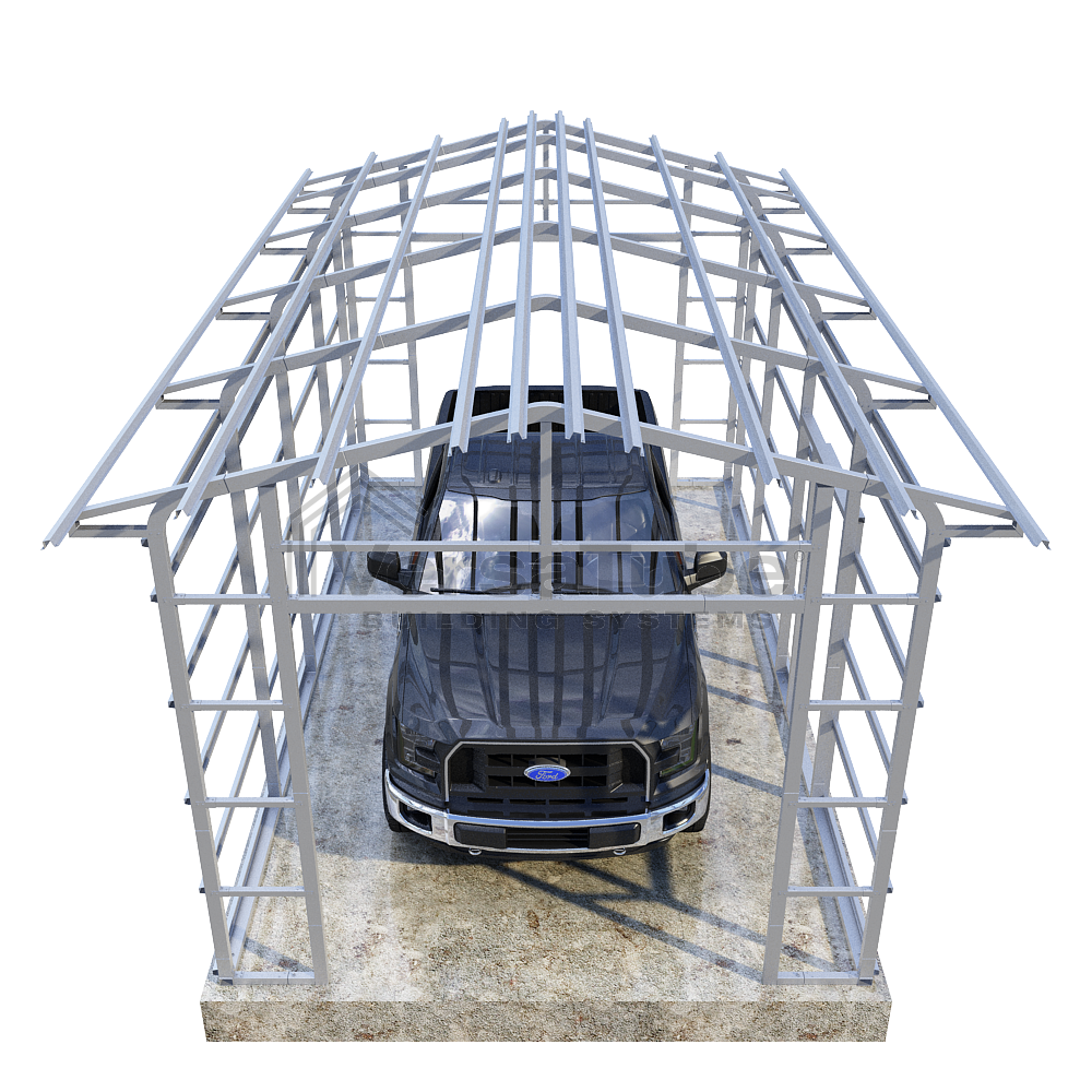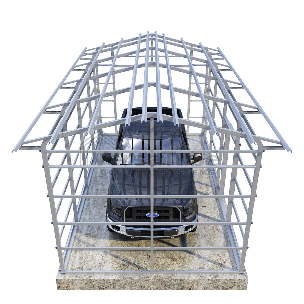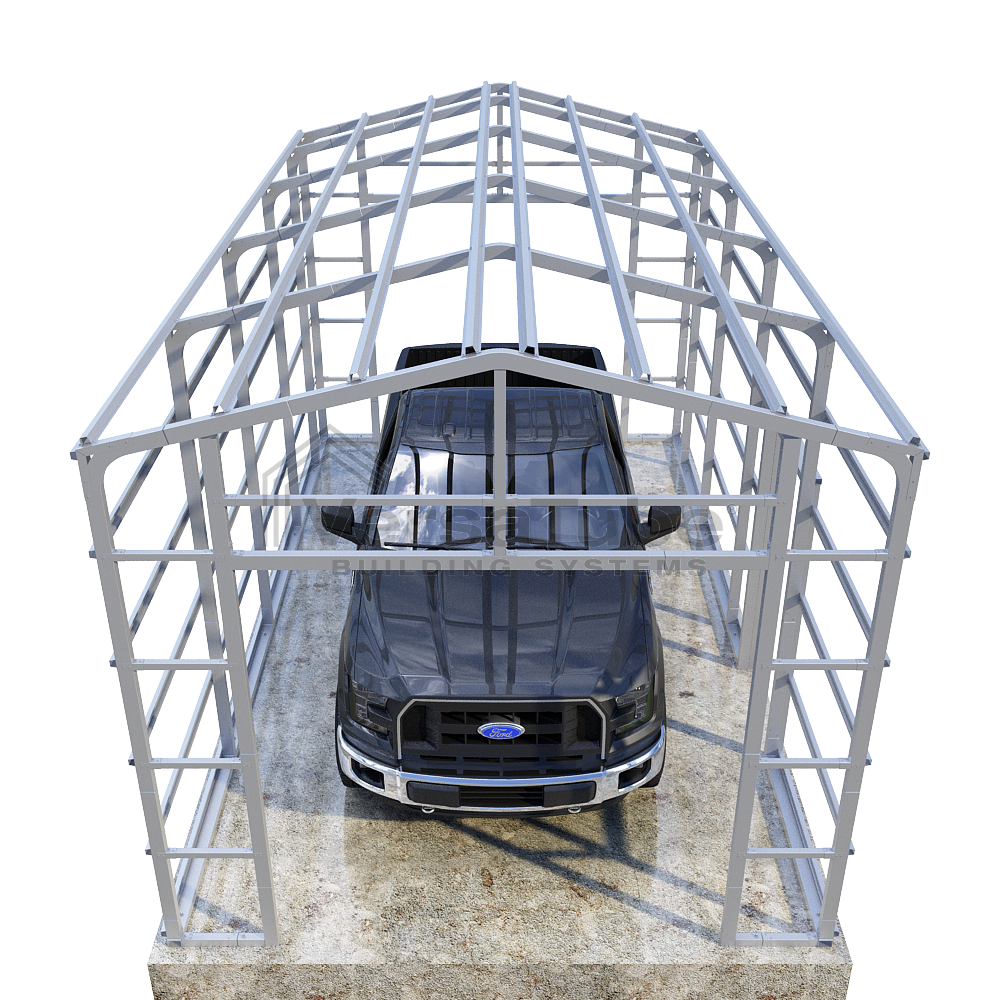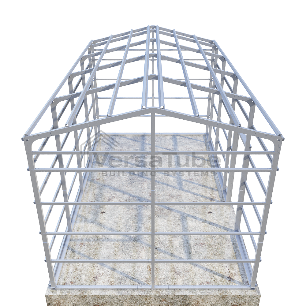 Summit Series DIY garage frame kit includes roof purlins and side girts for applying vertical sheet metal panels or other roofing or siding materials.