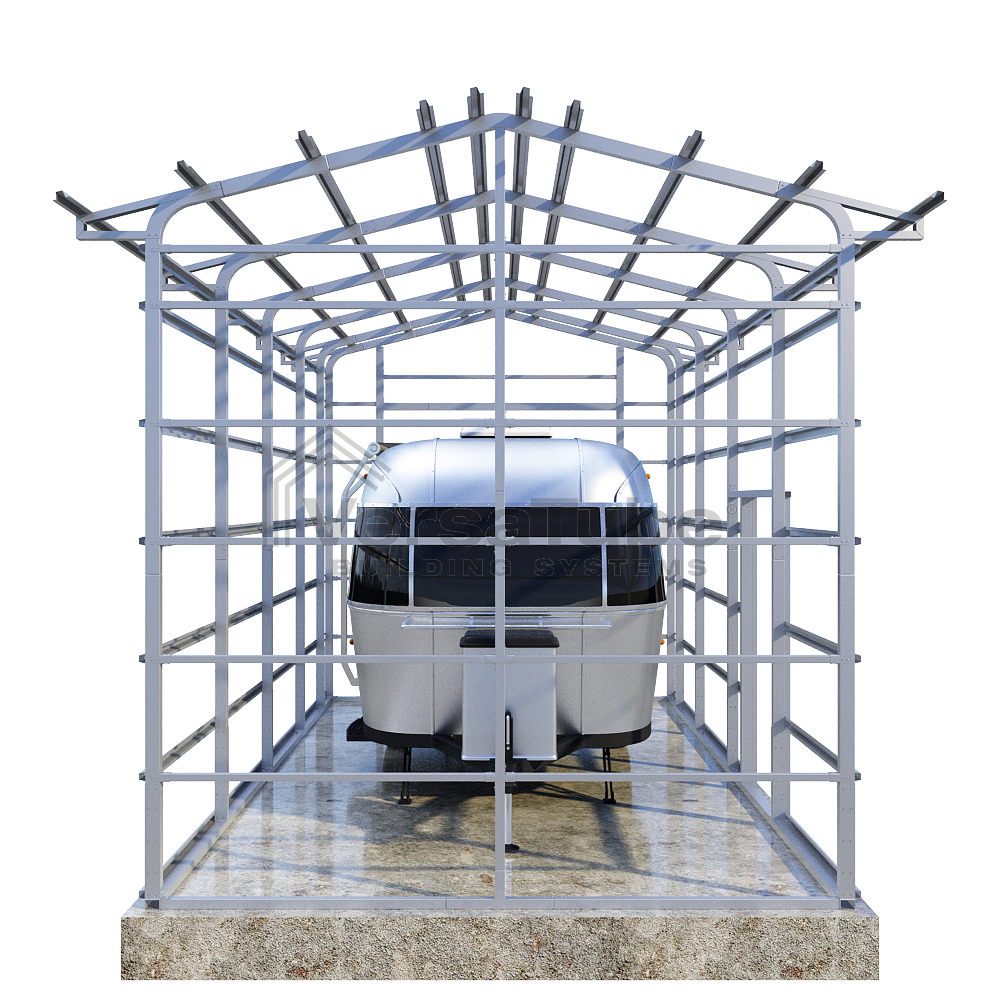 Summit Series DIY garage frame kit includes roof purlins and side girts for applying vertical sheet metal panels or other roofing or siding materials.