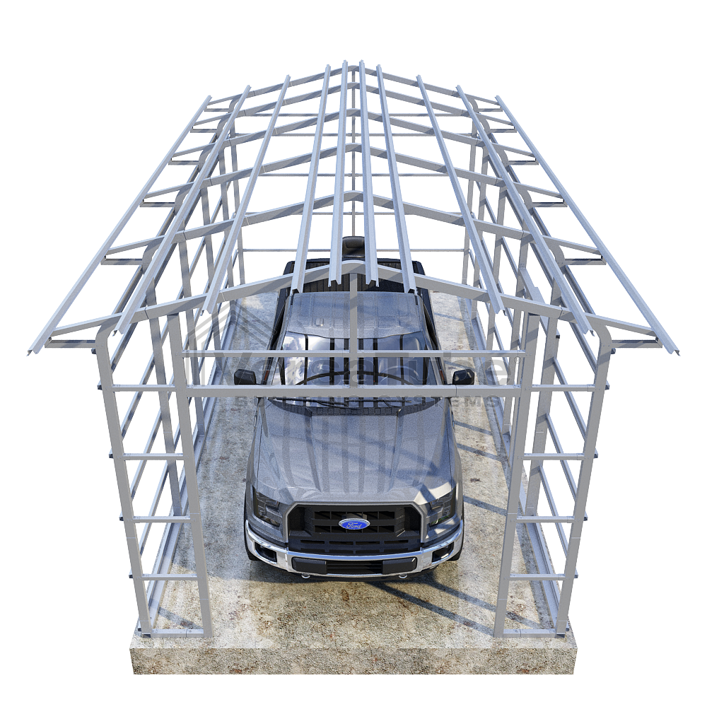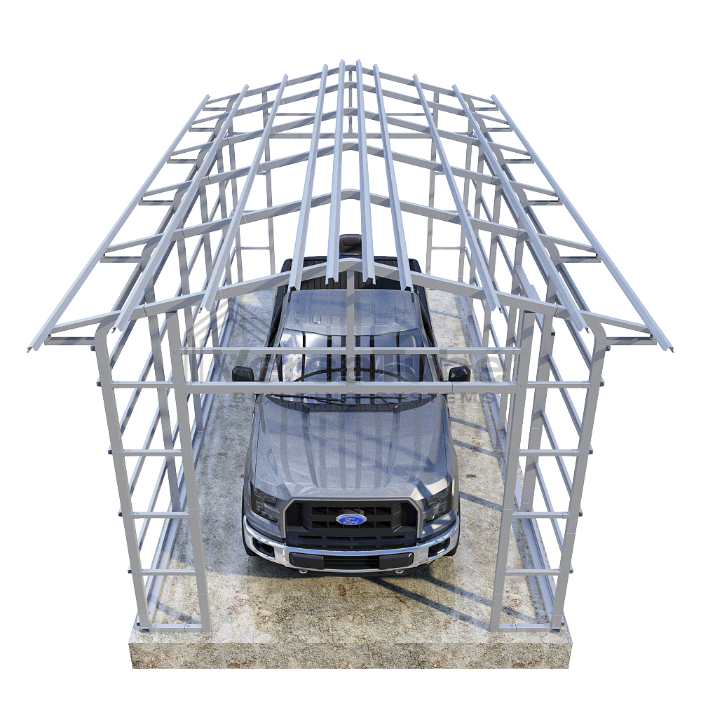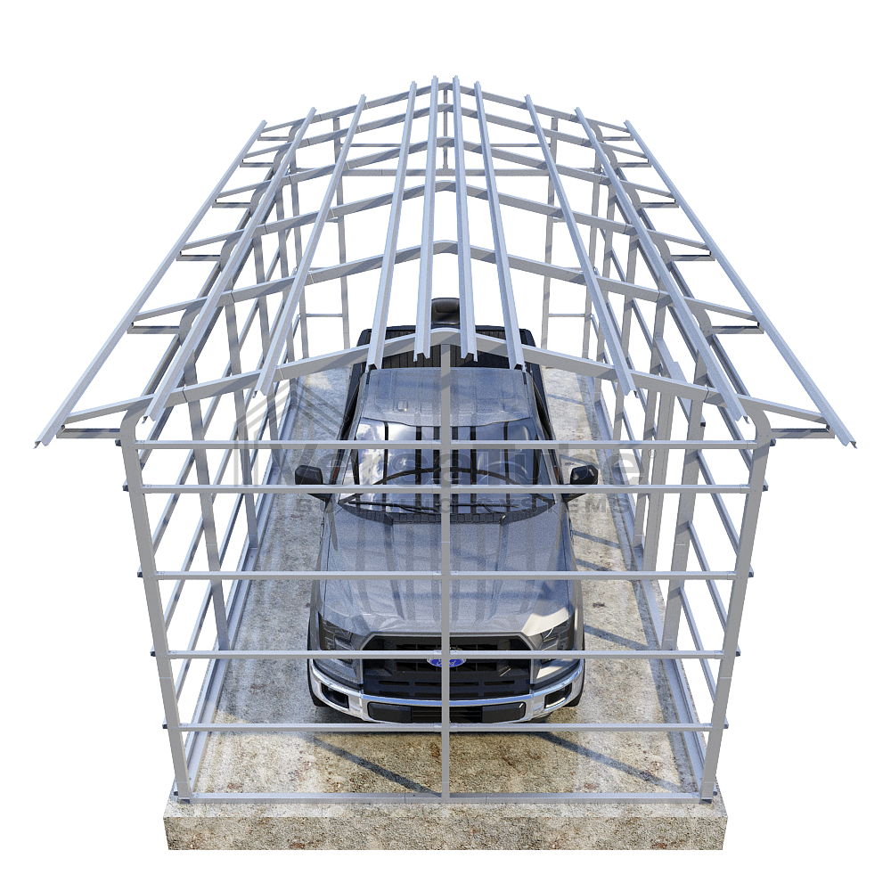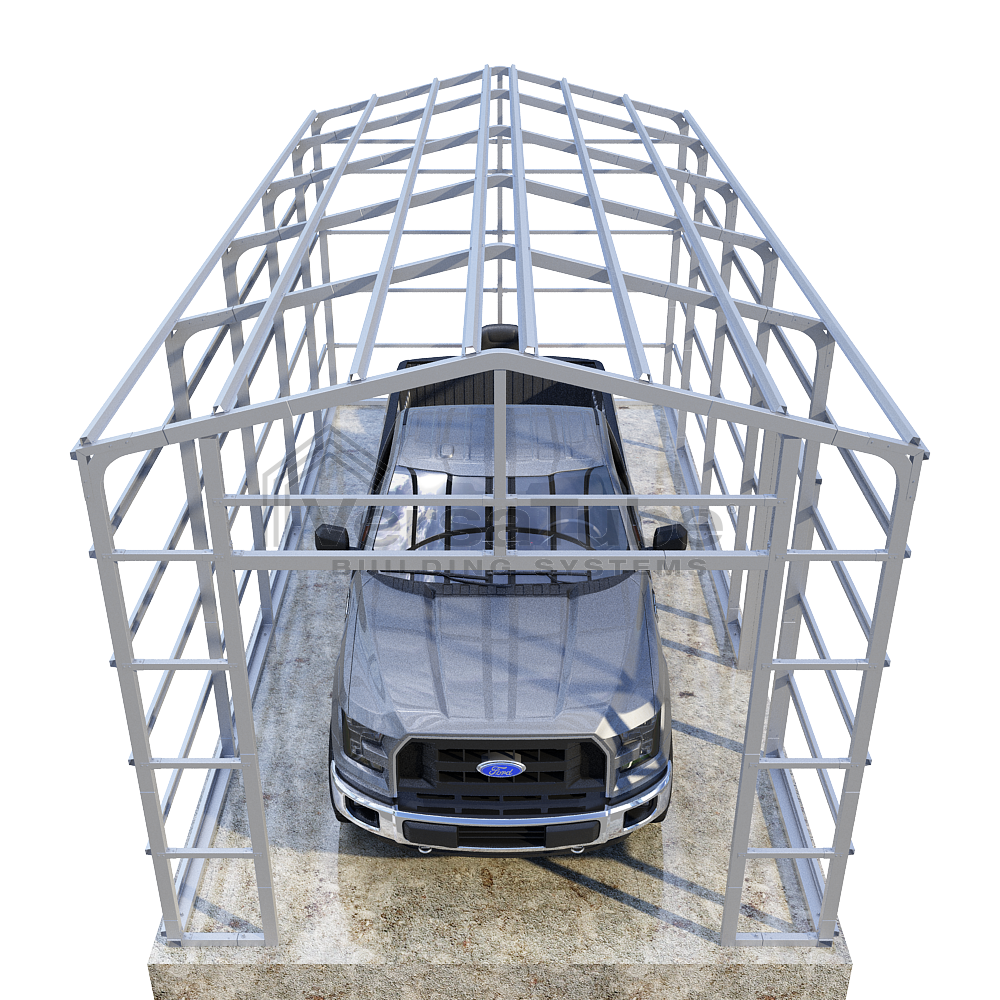 Summit Series DIY garage frame kit includes roof purlins and side girts for applying vertical sheet metal panels or other roofing or siding materials.