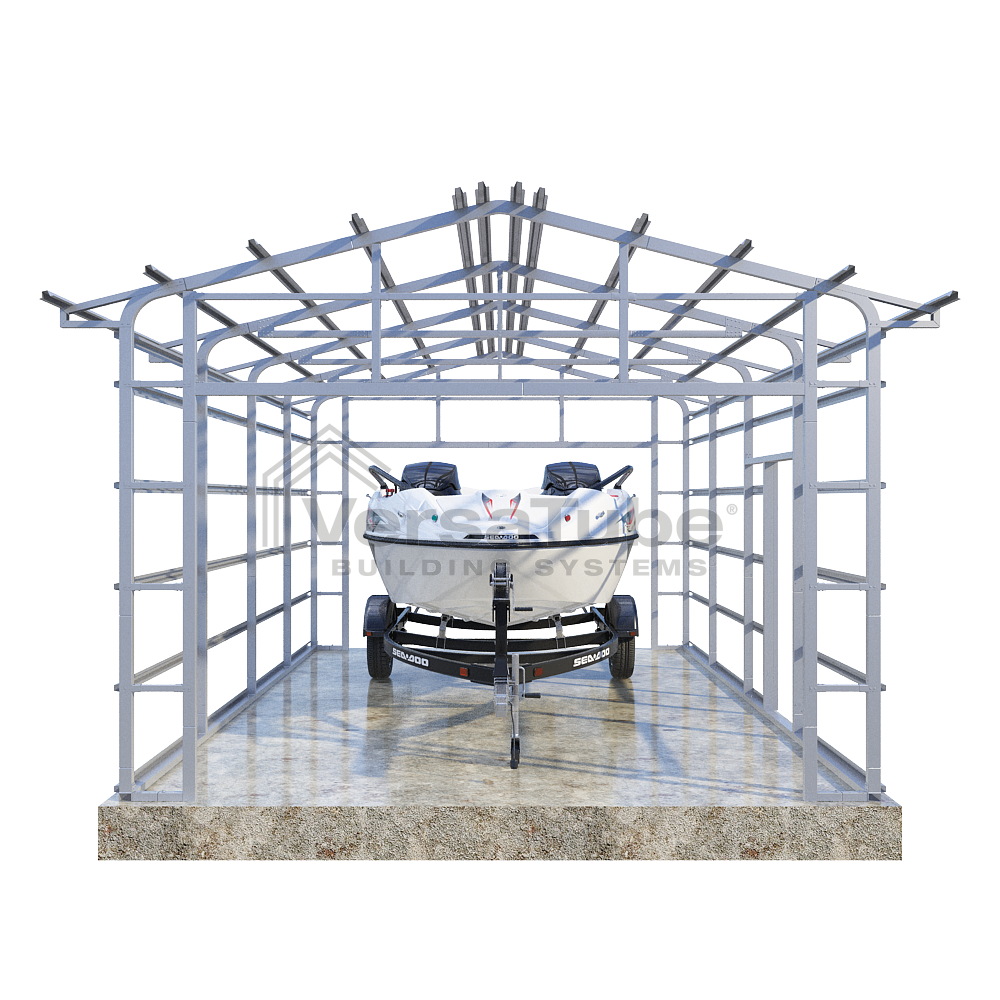 Summit Series DIY garage frame kit includes roof purlins and side girts for applying vertical sheet metal panels or other roofing or siding materials.