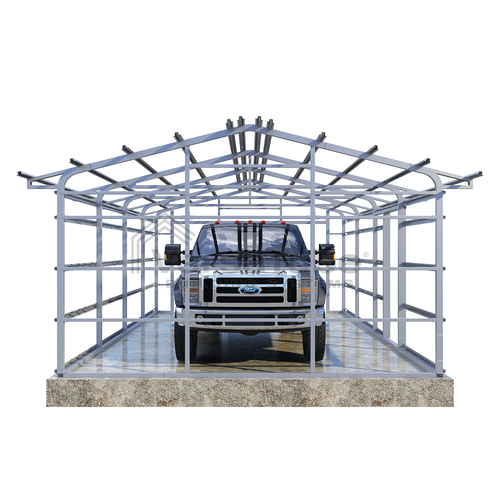 Summit Series DIY garage frame kit includes roof purlins and side girts for applying vertical sheet metal panels or other roofing or siding materials.
