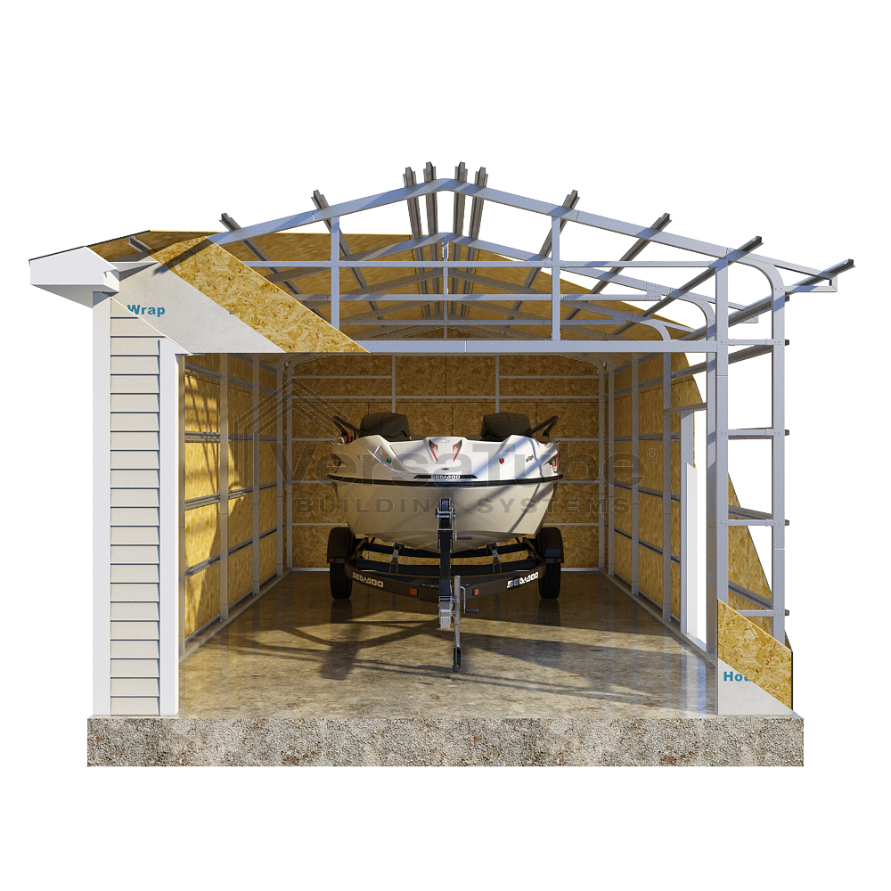 The required side girt components in the Summit design result in a more substantial building frame and allow for the use of plywood or OSB for vinyl or other siding products. And assembly time is drastically reduced with our patented Slip-Fit frame connections.