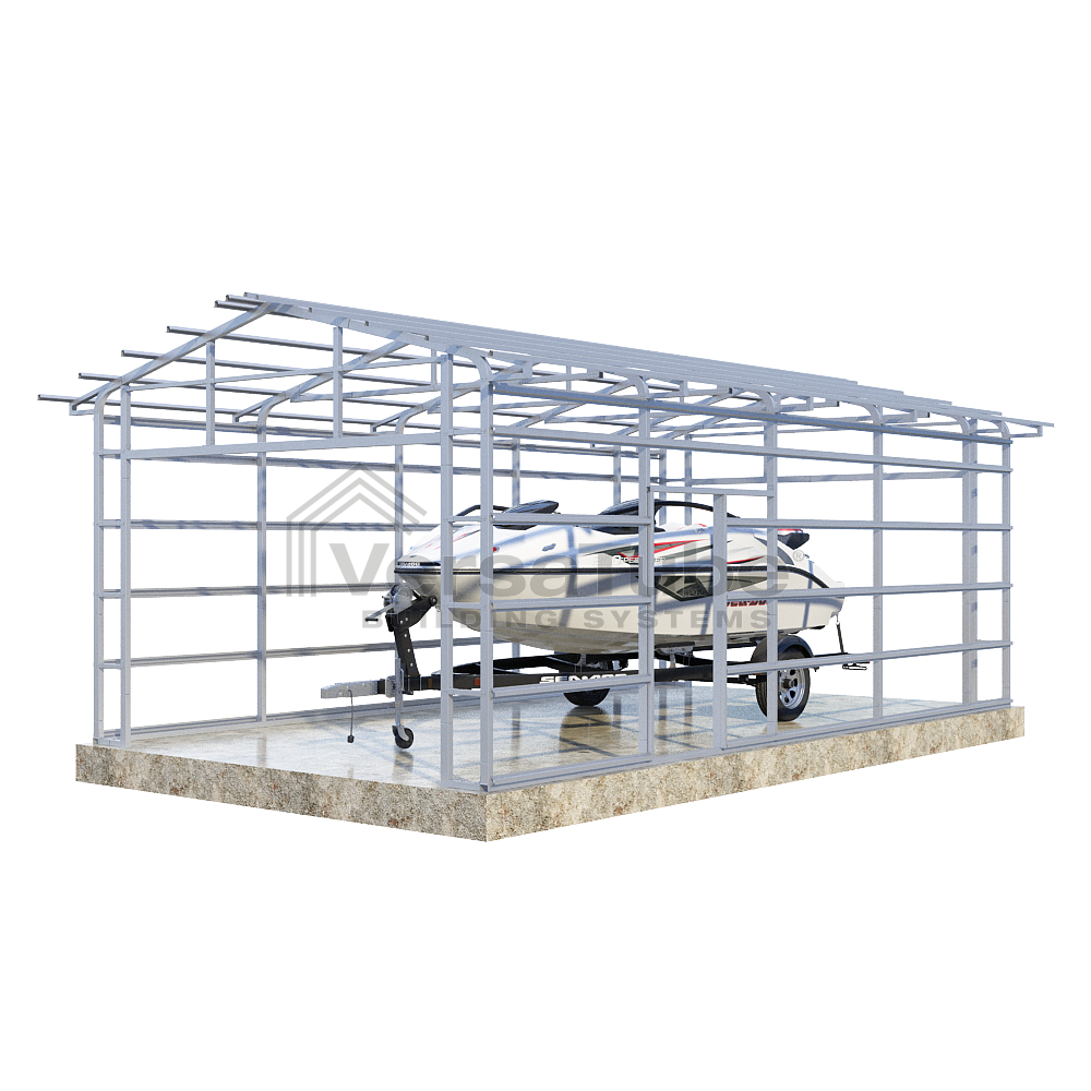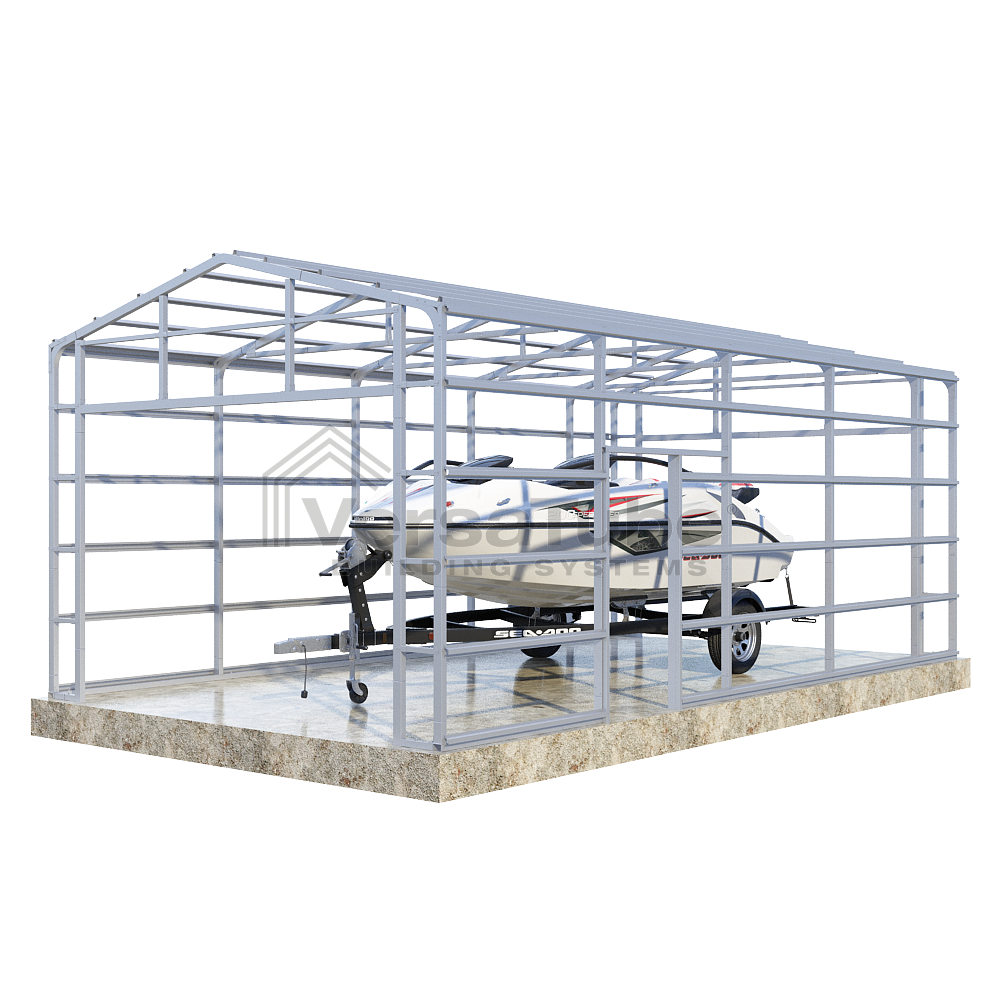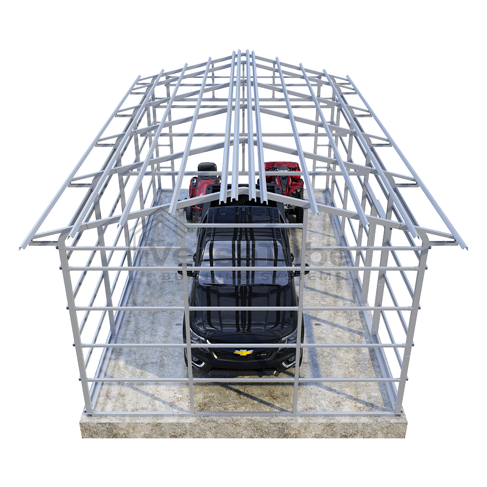 Summit Series DIY garage frame kit includes roof purlins and side girts for applying vertical sheet metal panels or other roofing or siding materials.