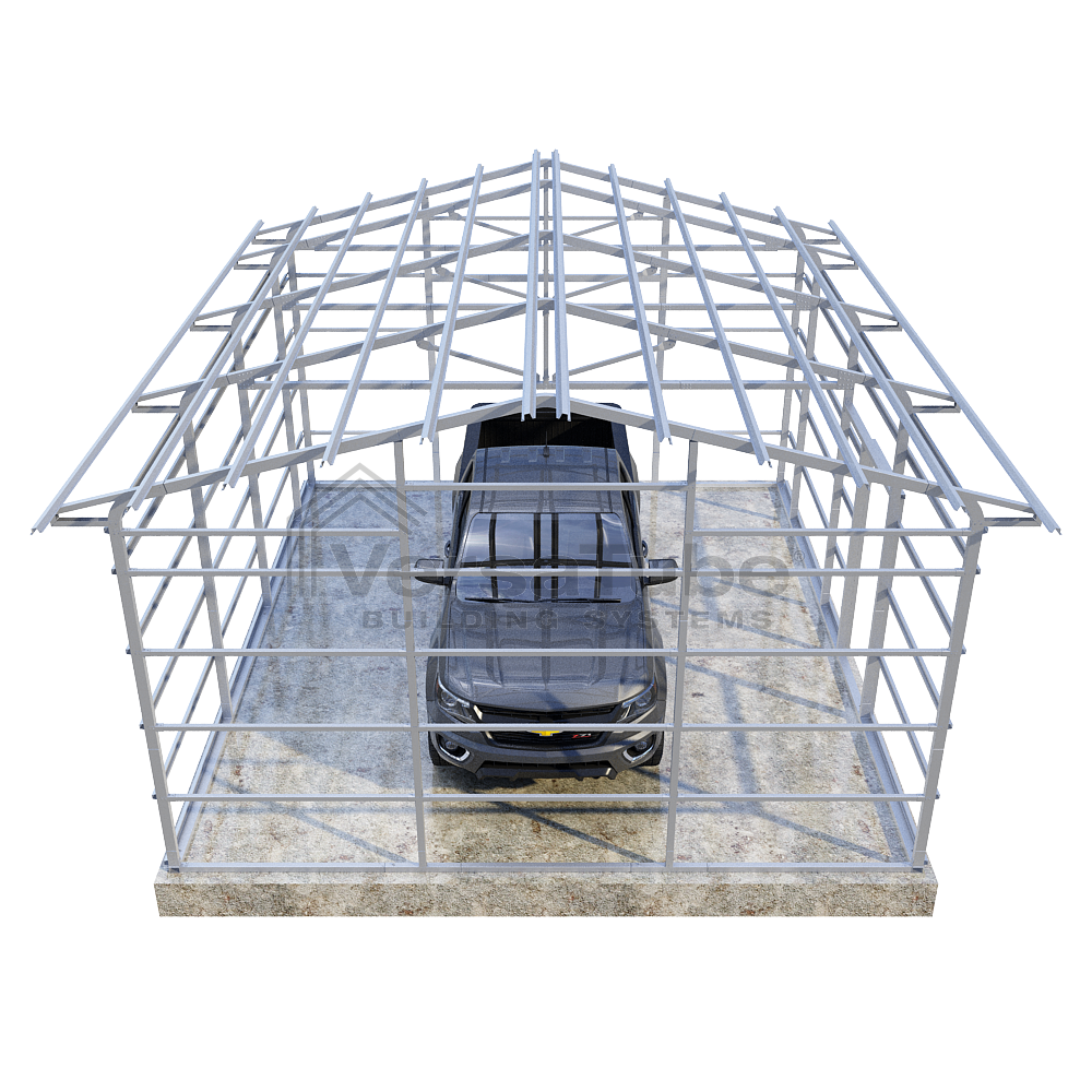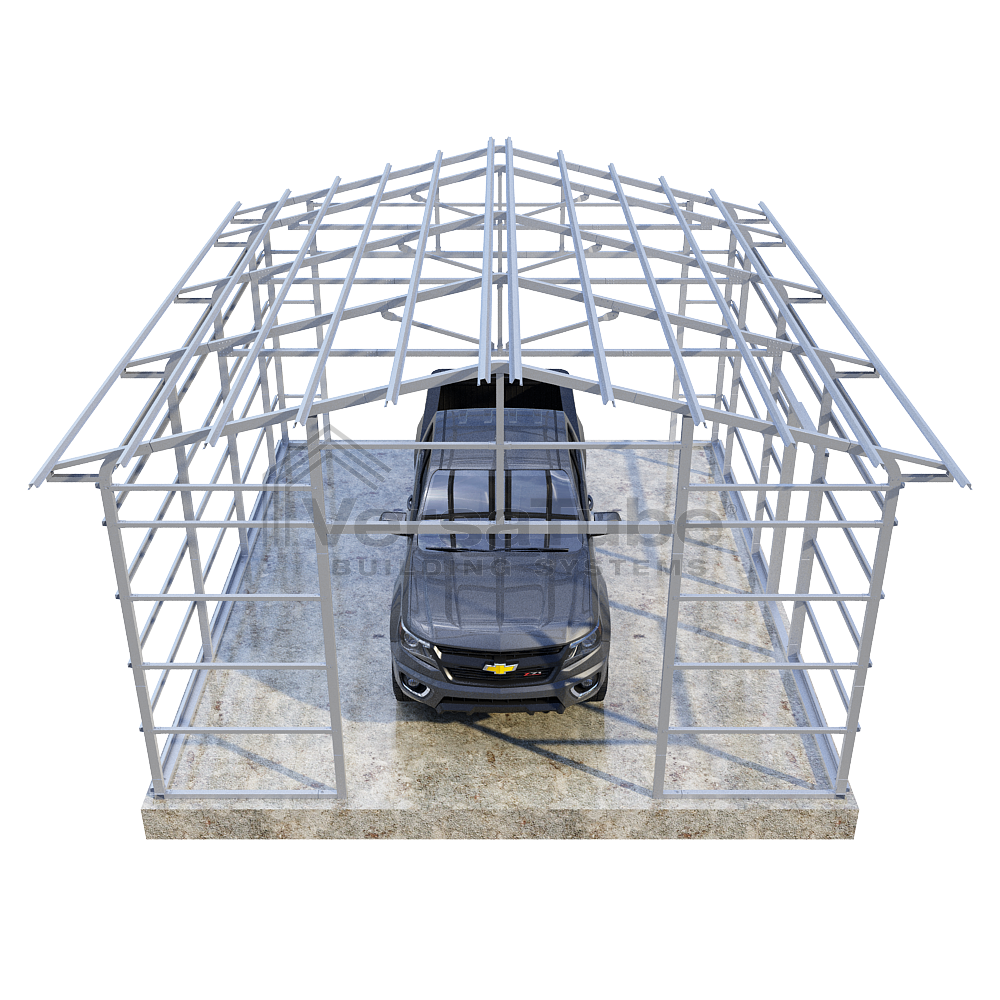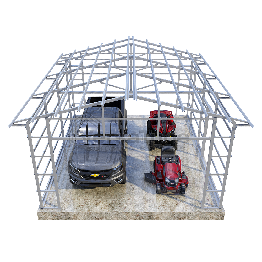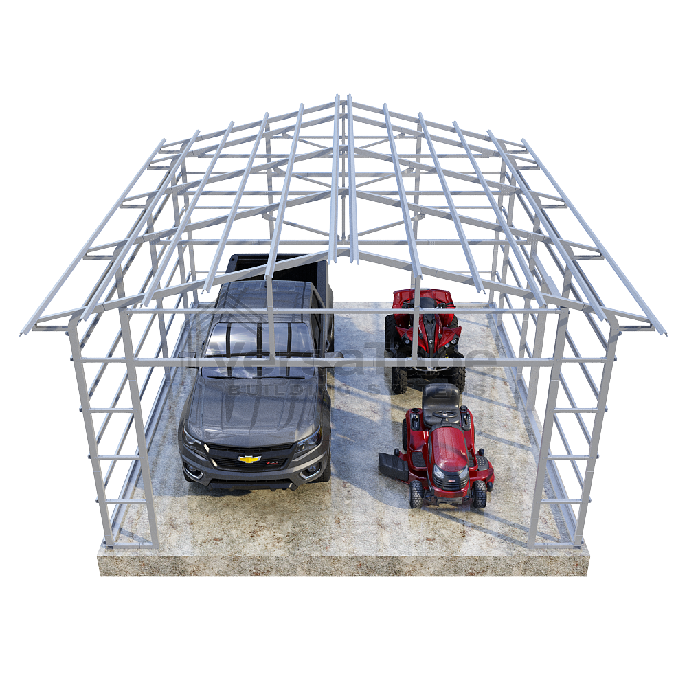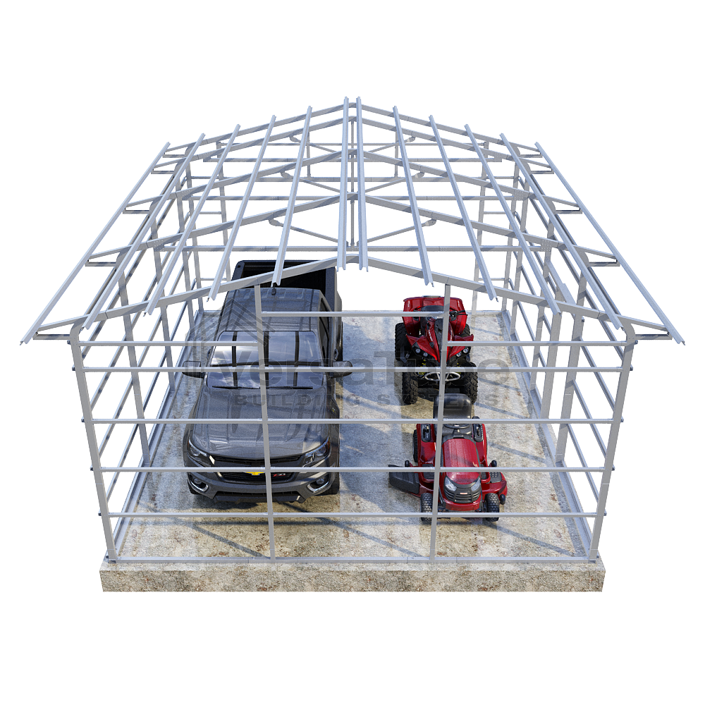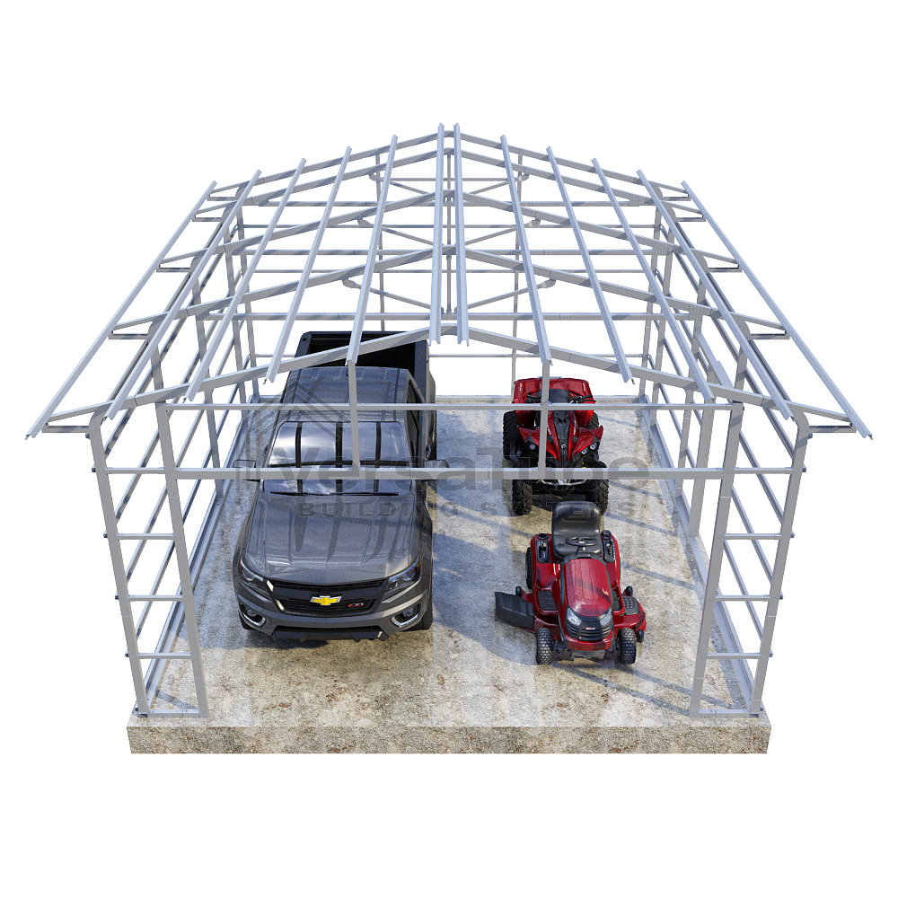 Summit Series DIY garage frame kit includes roof purlins and side girts for applying vertical sheet metal panels or other roofing or siding materials.