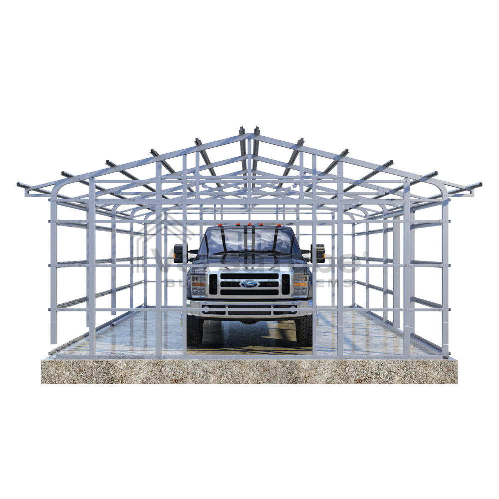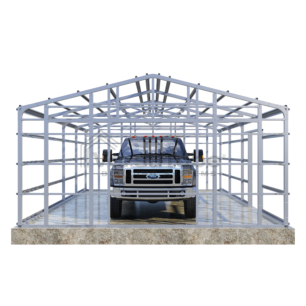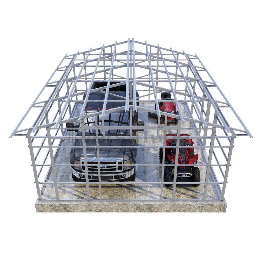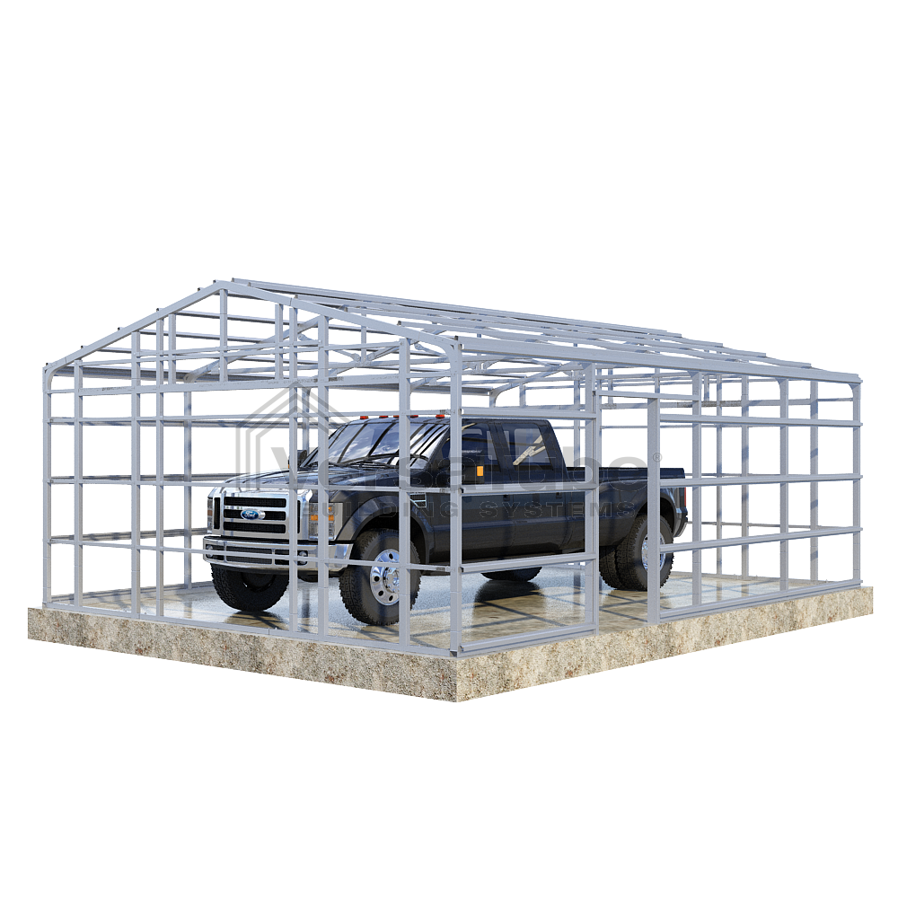 Summit Series DIY garage frame kit includes roof purlins and side girts for applying vertical sheet metal panels or other roofing or siding materials.