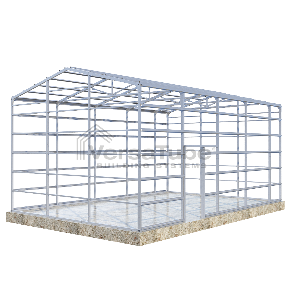 Summit Series DIY garage frame kit includes roof purlins and side girts for applying vertical sheet metal panels or other roofing or siding materials.