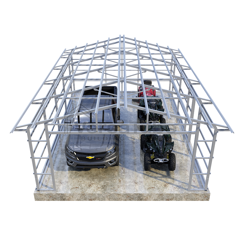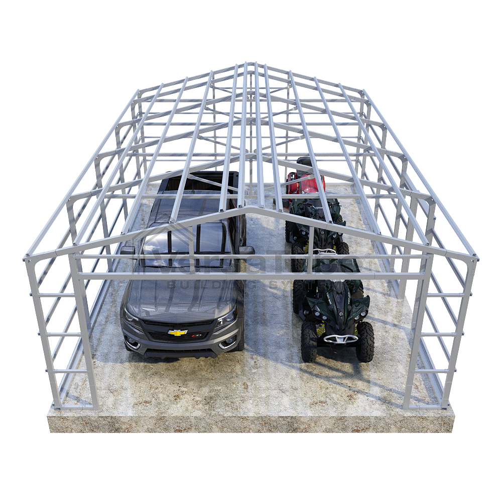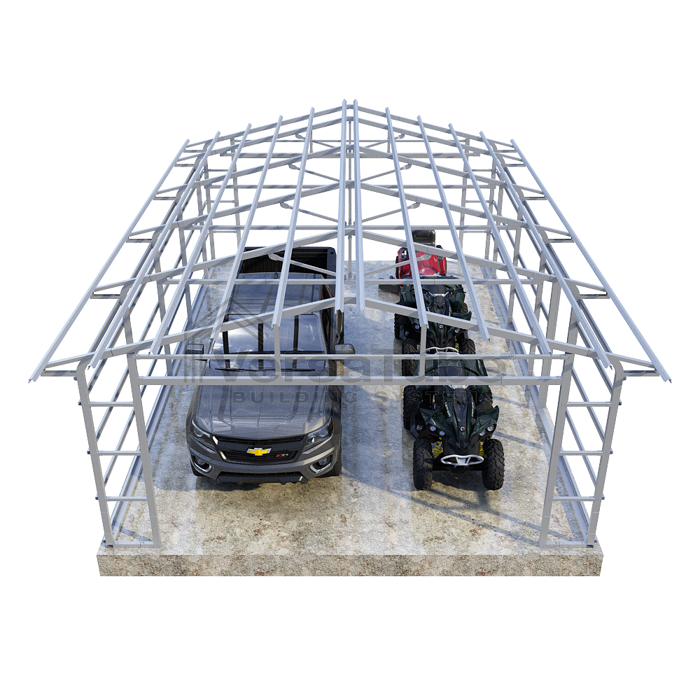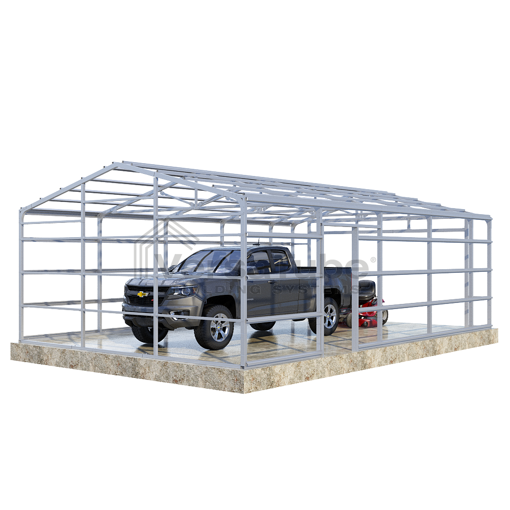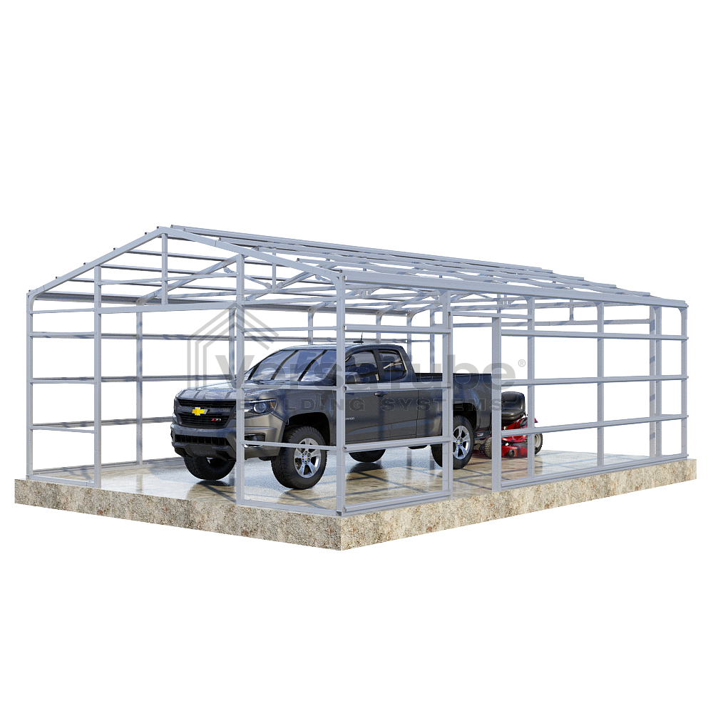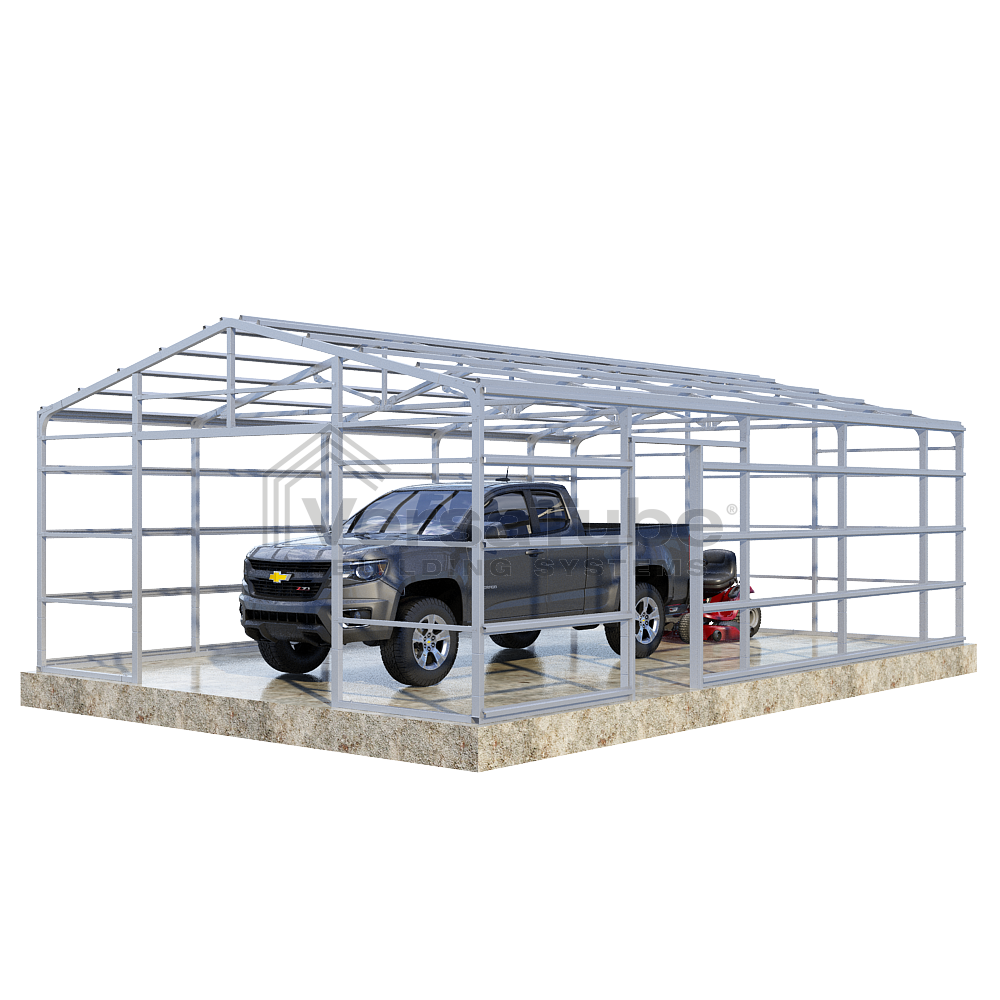 Summit Series DIY garage frame kit includes roof purlins and side girts for applying vertical sheet metal panels or other roofing or siding materials.
