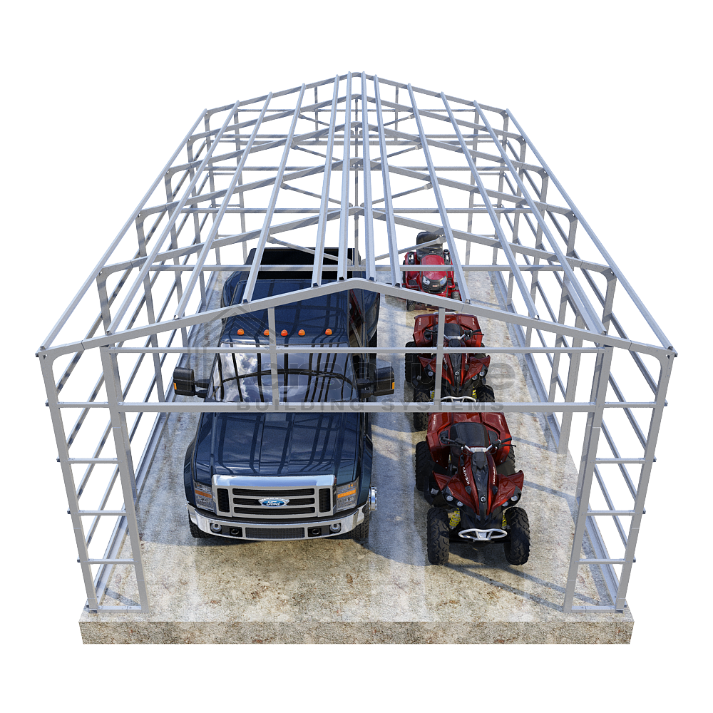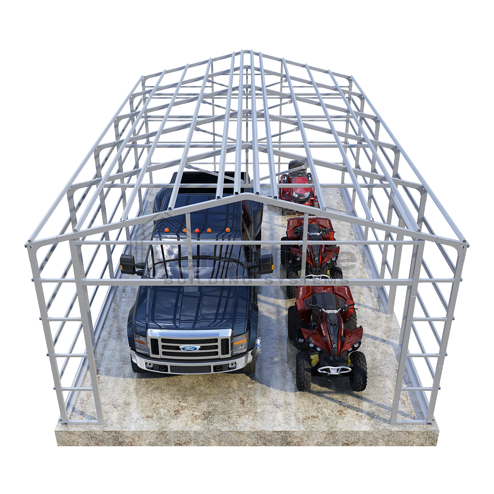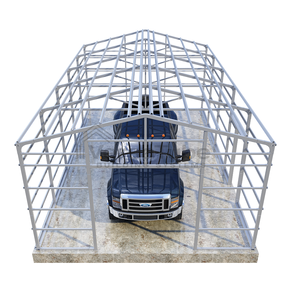 Summit Series DIY garage frame kit includes roof purlins and side girts for applying vertical sheet metal panels or other roofing or siding materials.