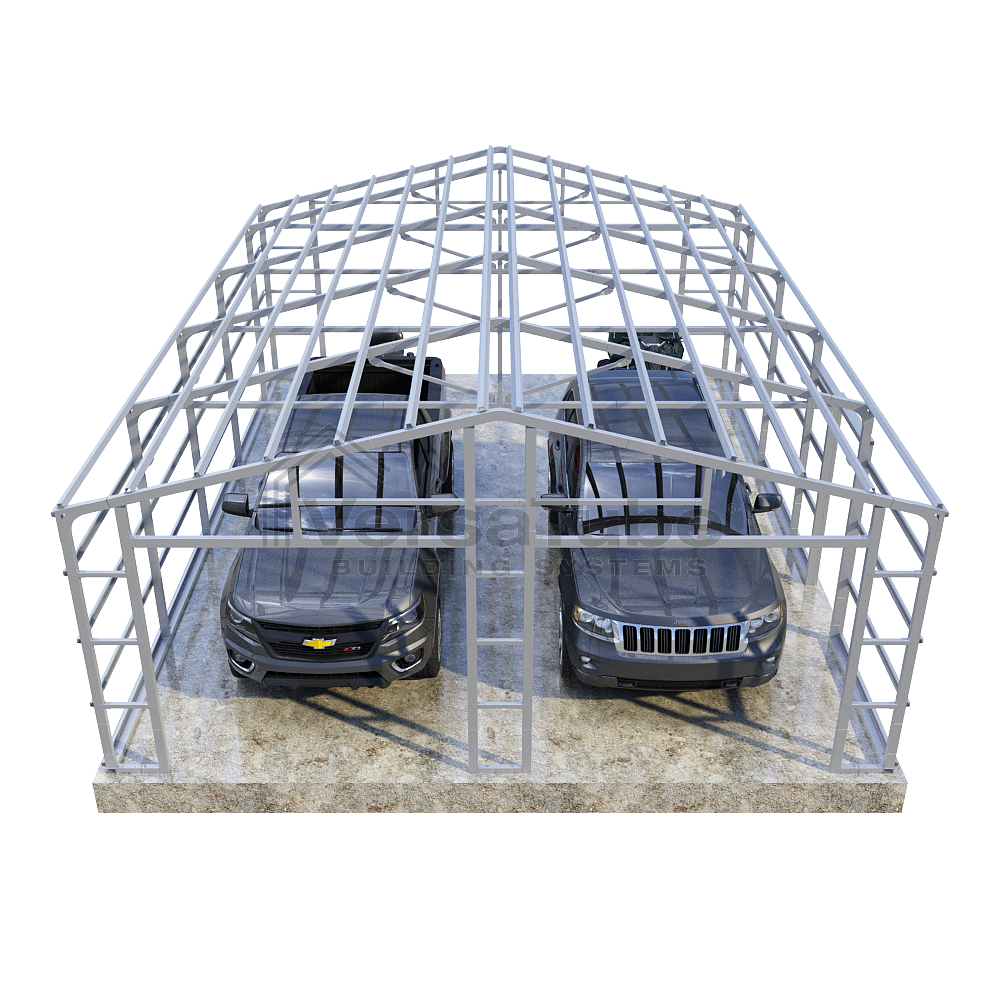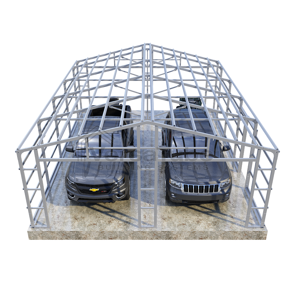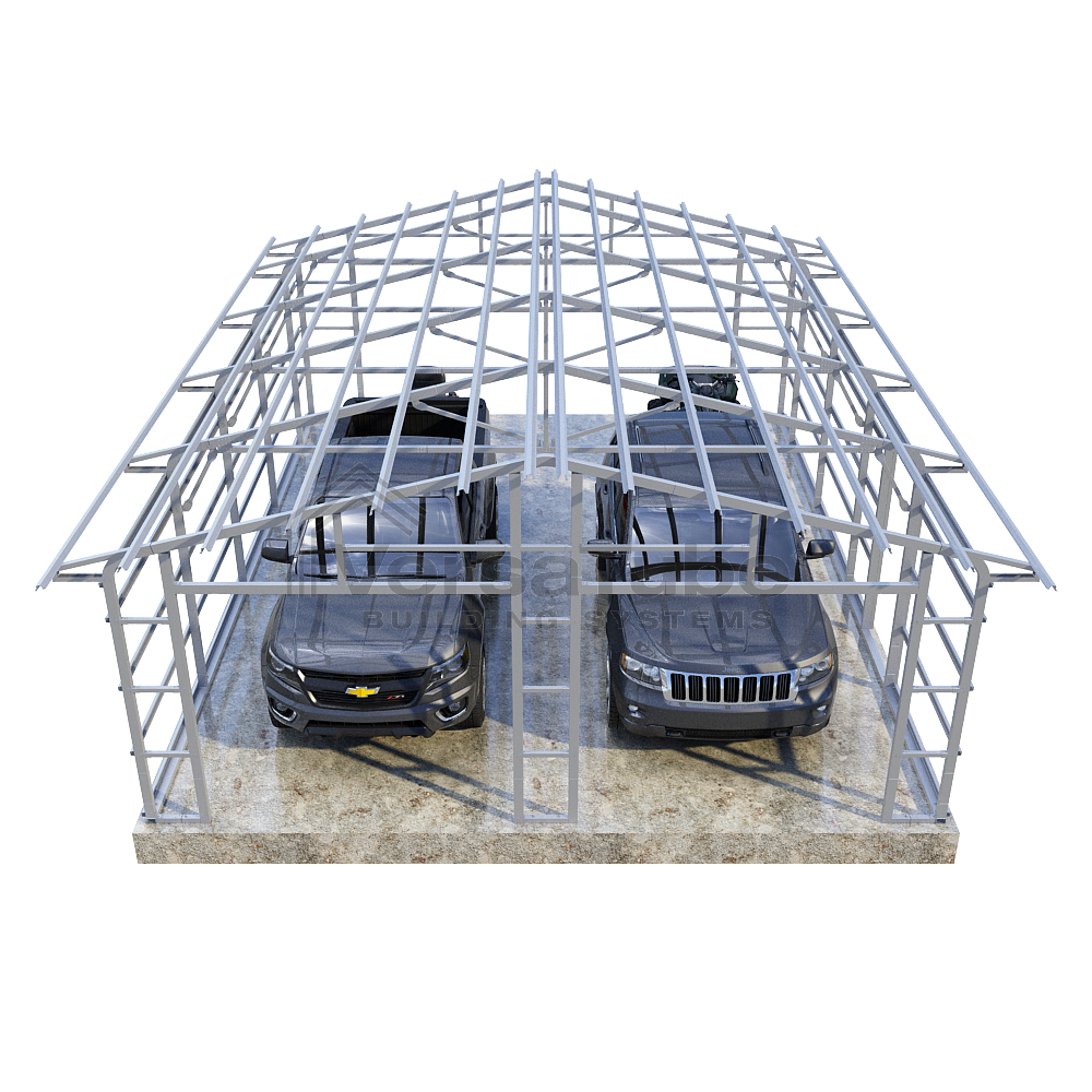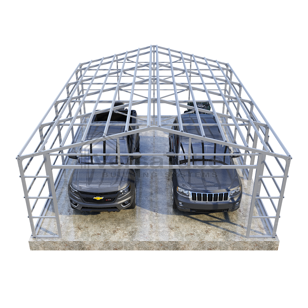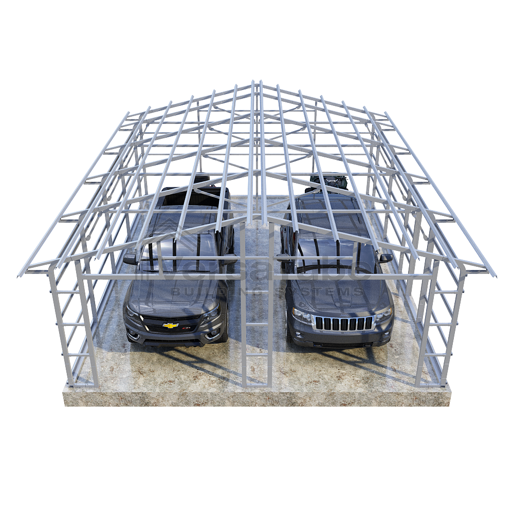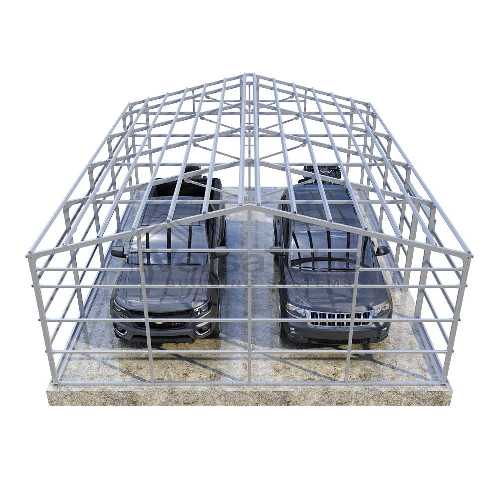 Summit Series DIY garage frame kit includes roof purlins and side girts for applying vertical sheet metal panels or other roofing or siding materials.
