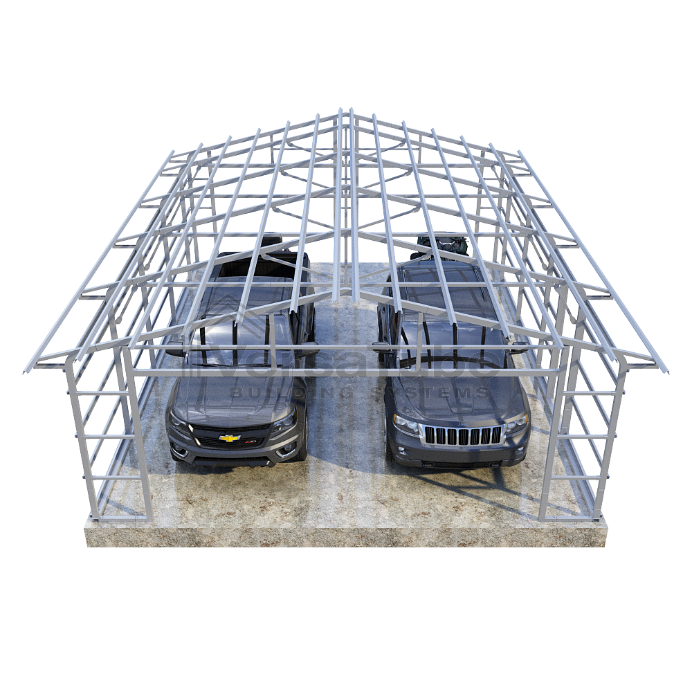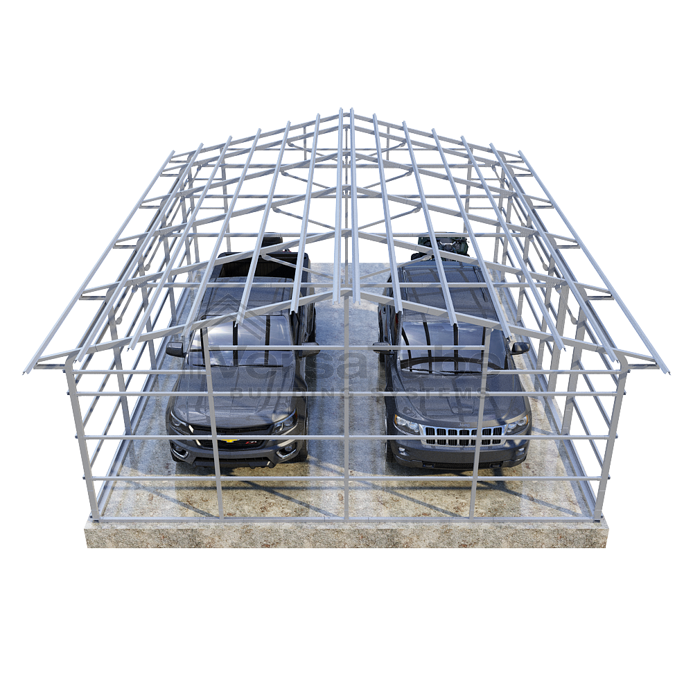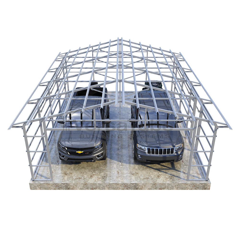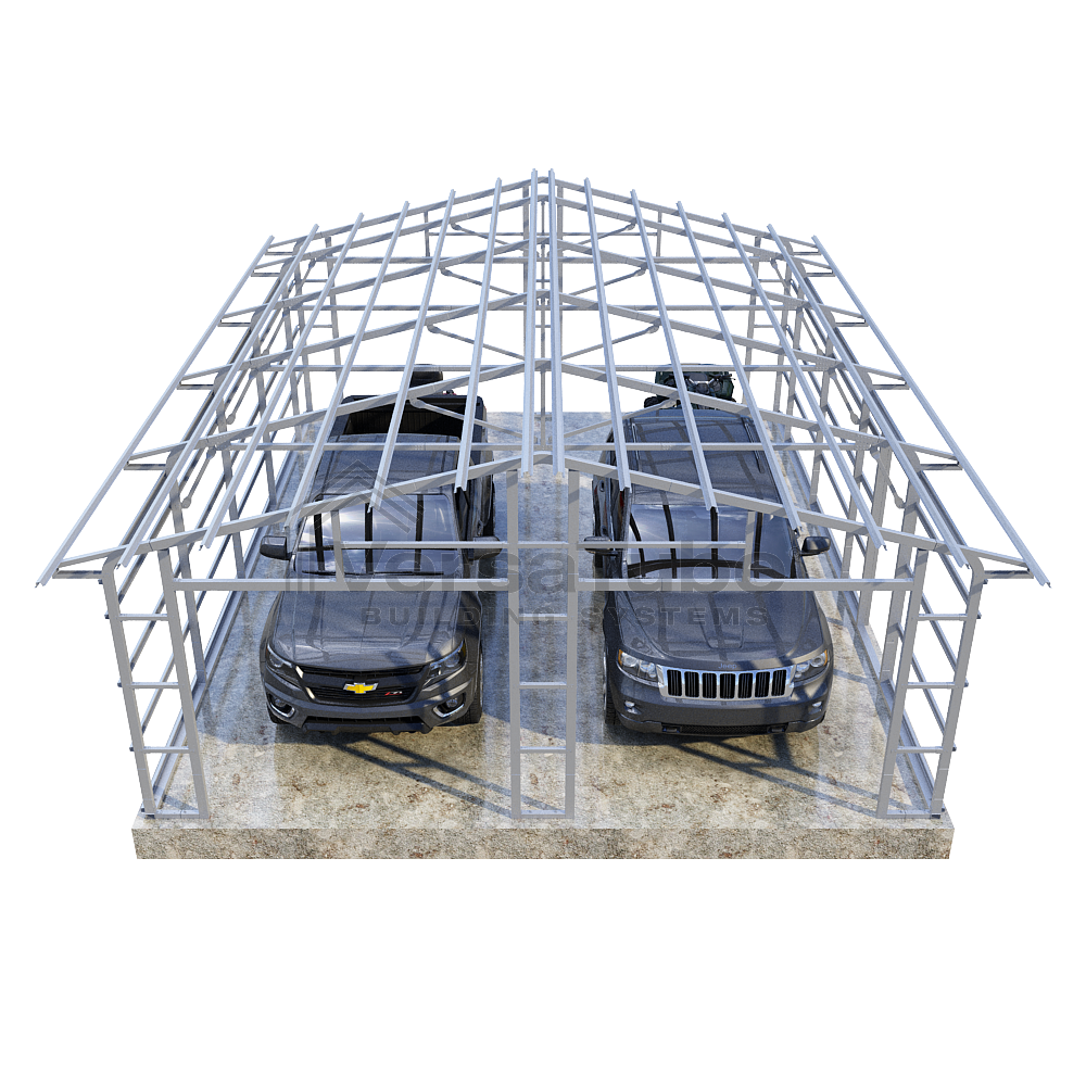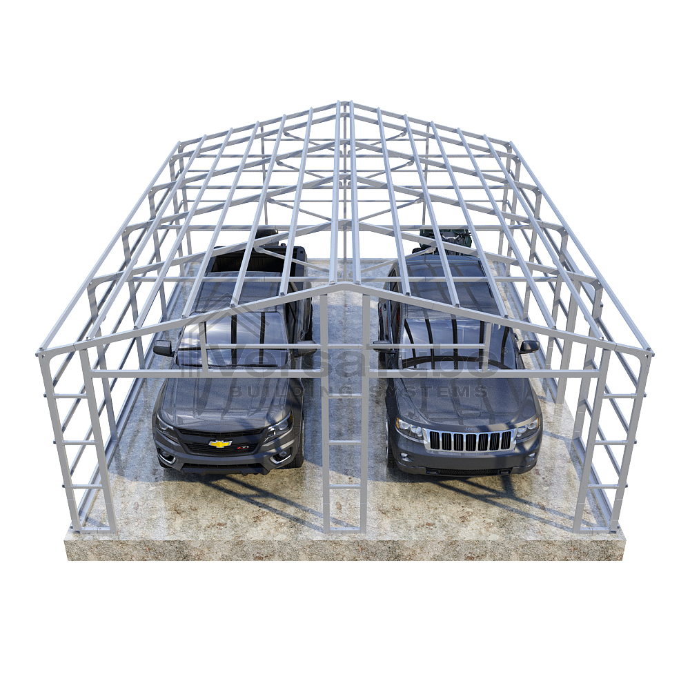 Summit Series DIY garage frame kit includes roof purlins and side girts for applying vertical sheet metal panels or other roofing or siding materials.